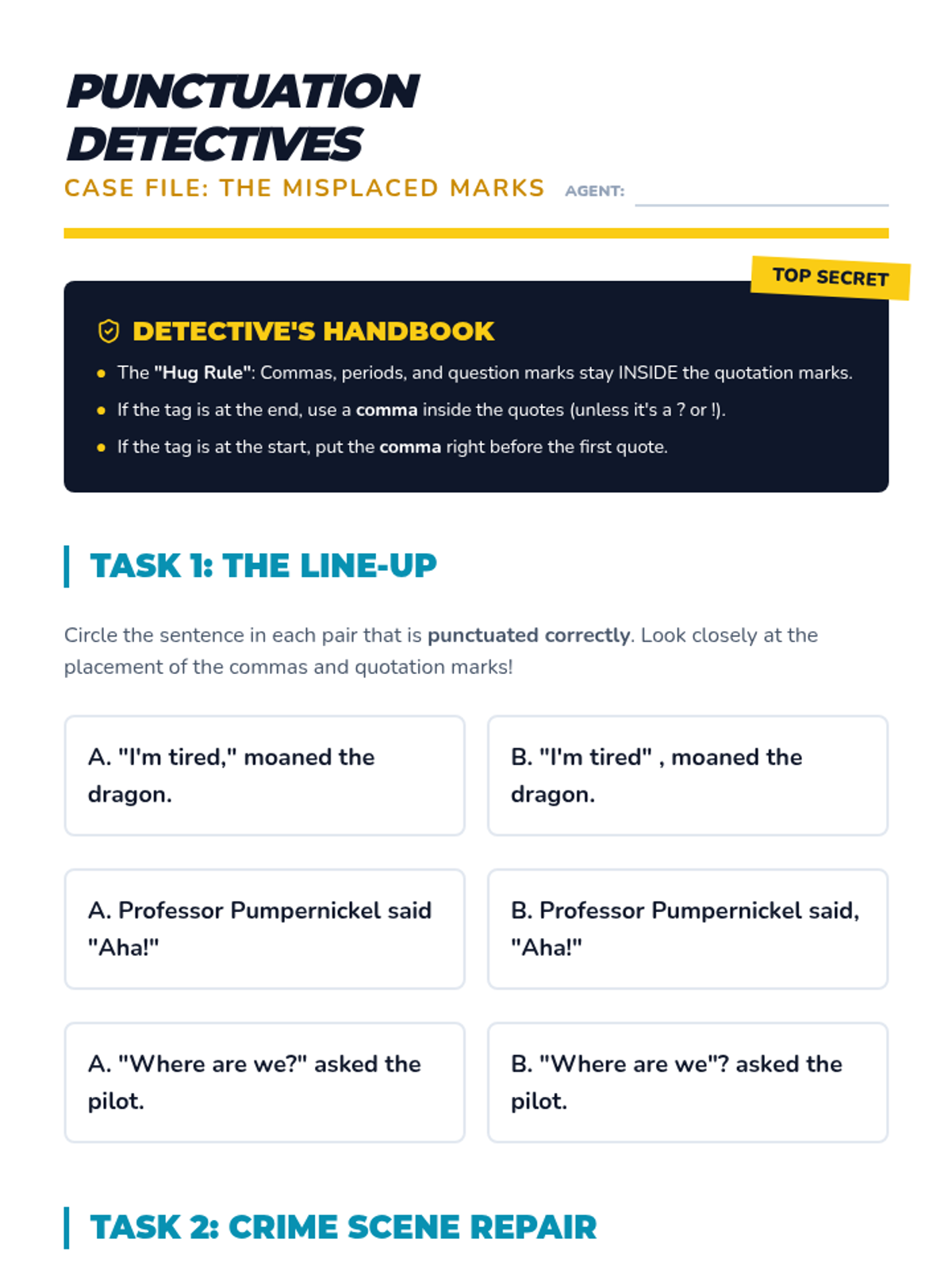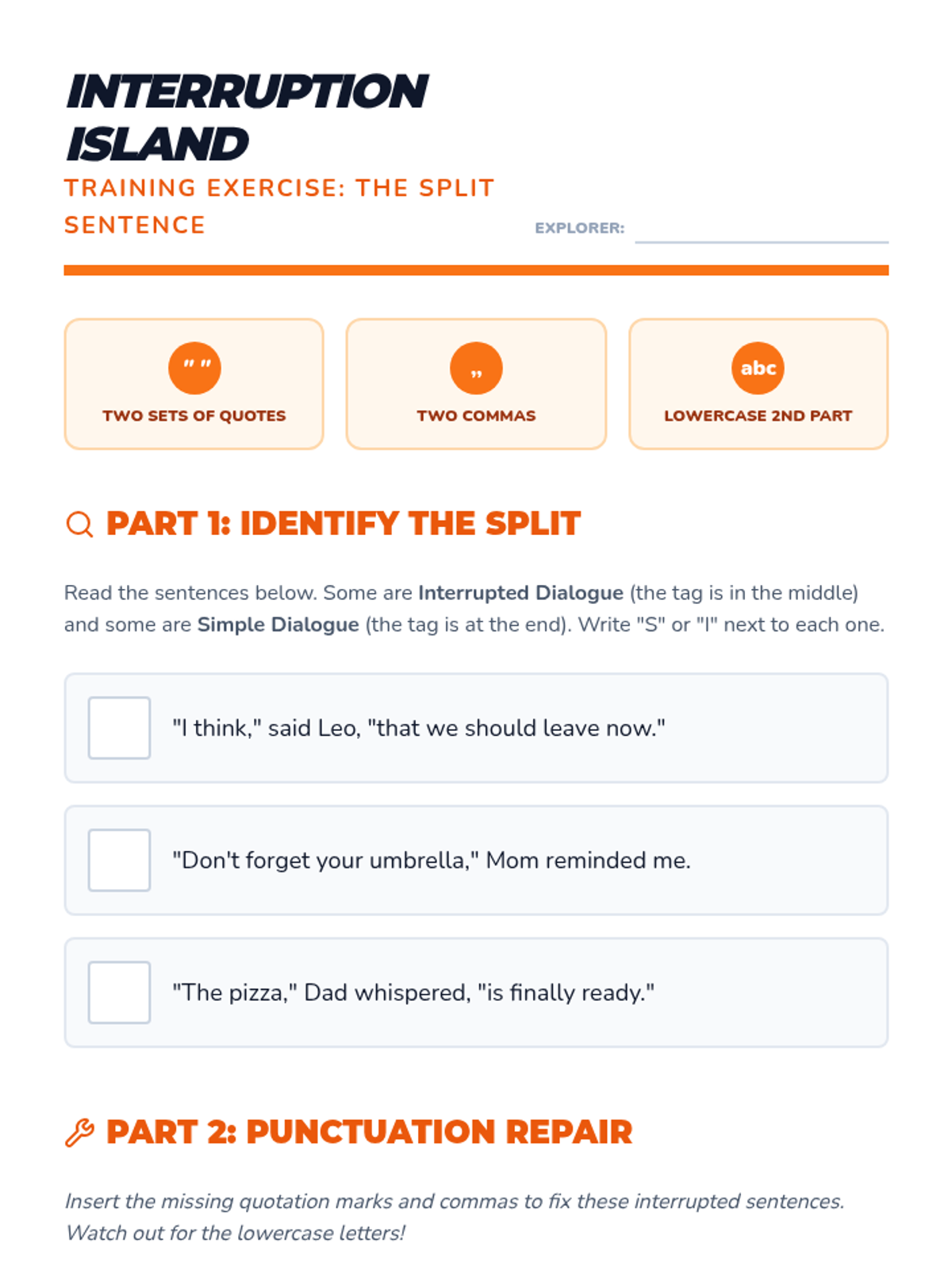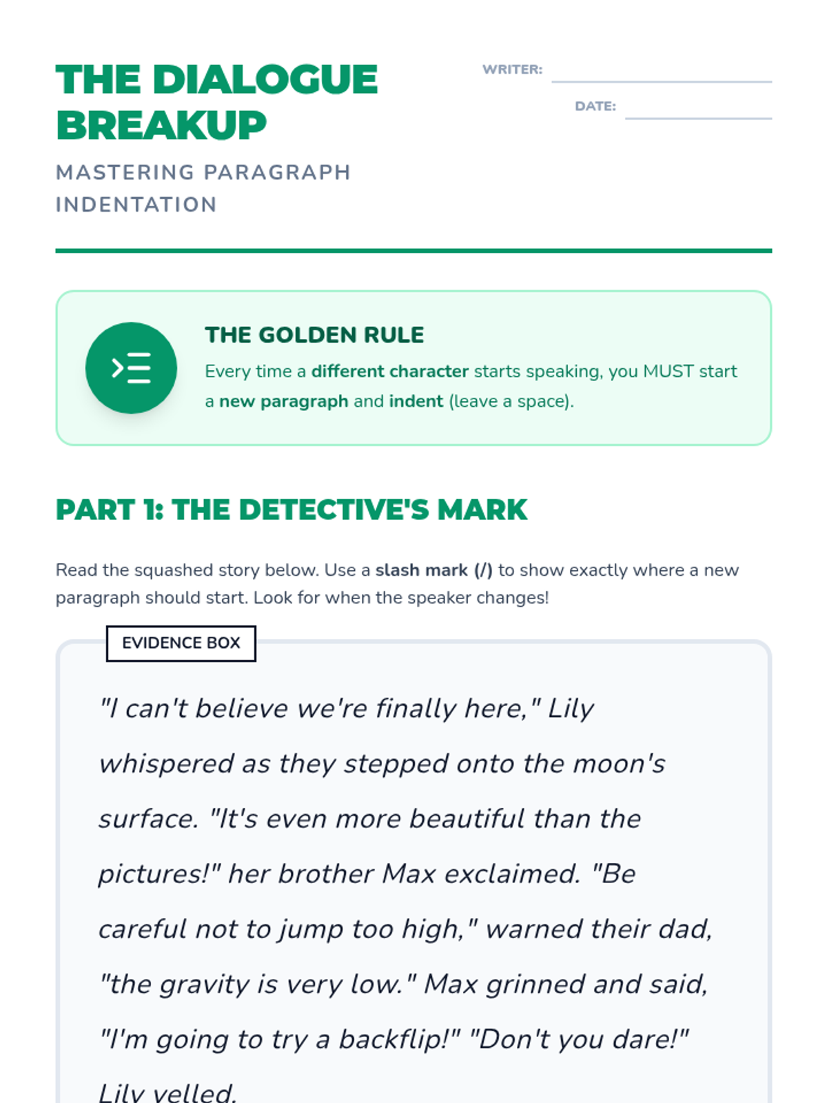 A comprehensive workshop-style sequence for 4th graders to master the mechanics of narrative dialogue, covering quotation marks, comma placement, indentation, and interrupted speech.