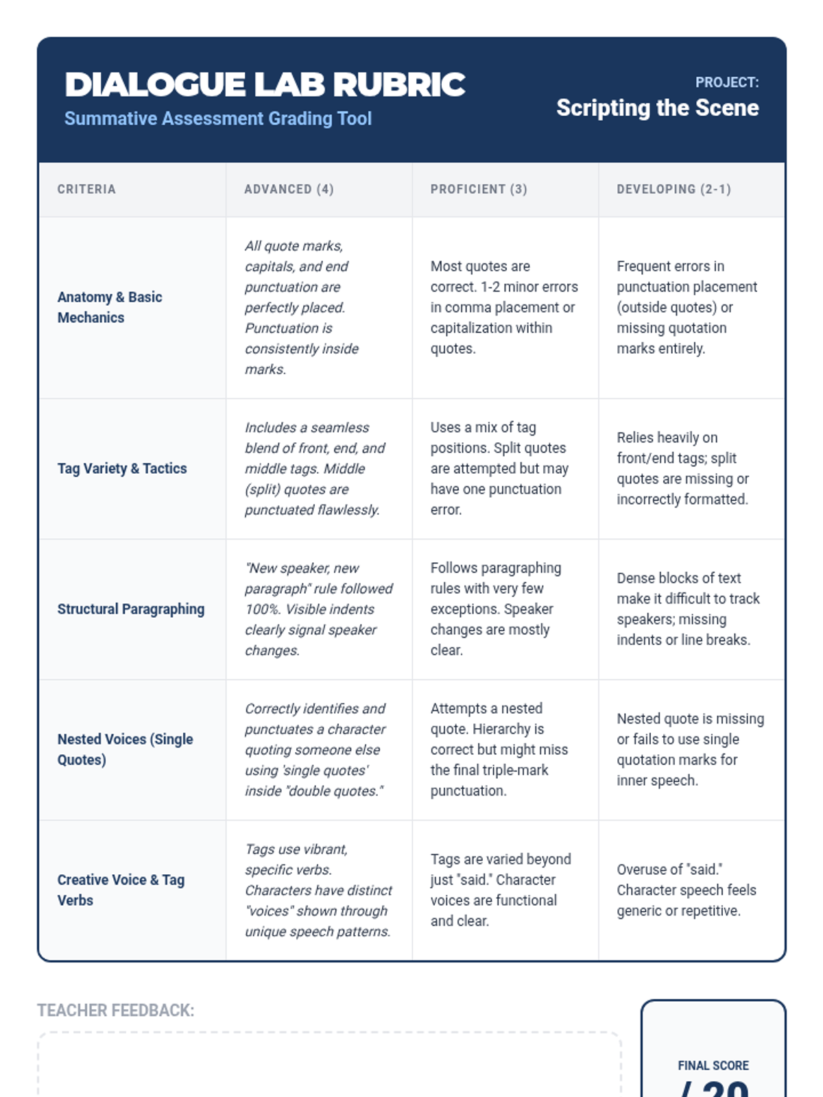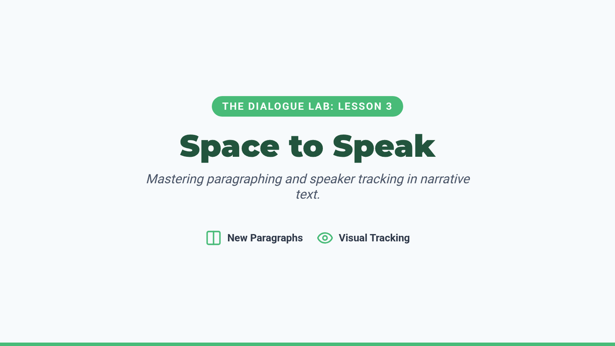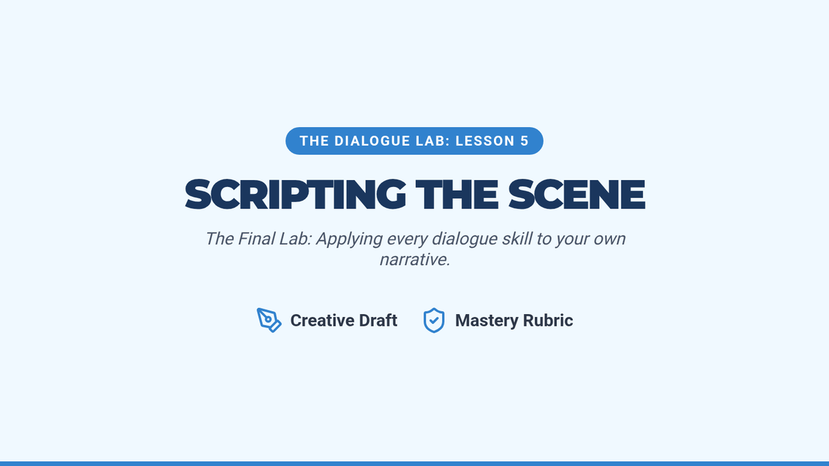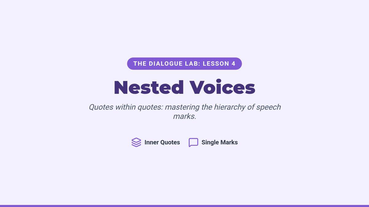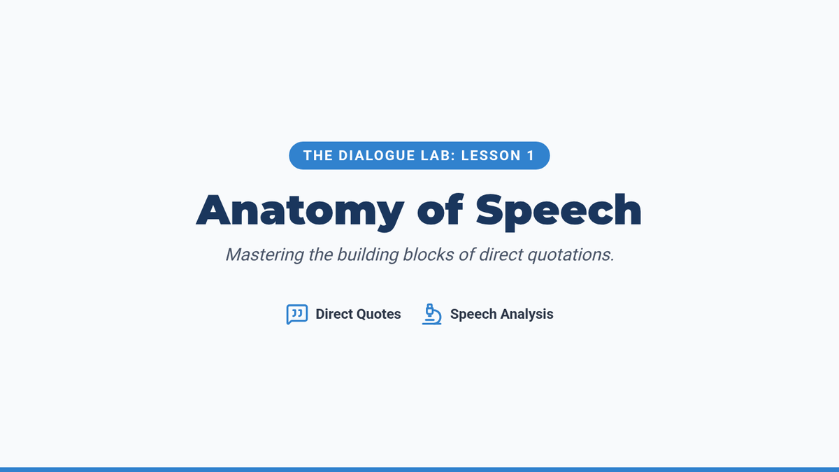 A comprehensive 7th-grade ELA sequence focused on the mechanics of dialogue, from basic punctuation to complex nesting and formatting. Students move through five lessons to master the art of writing clear, authentic character voices.