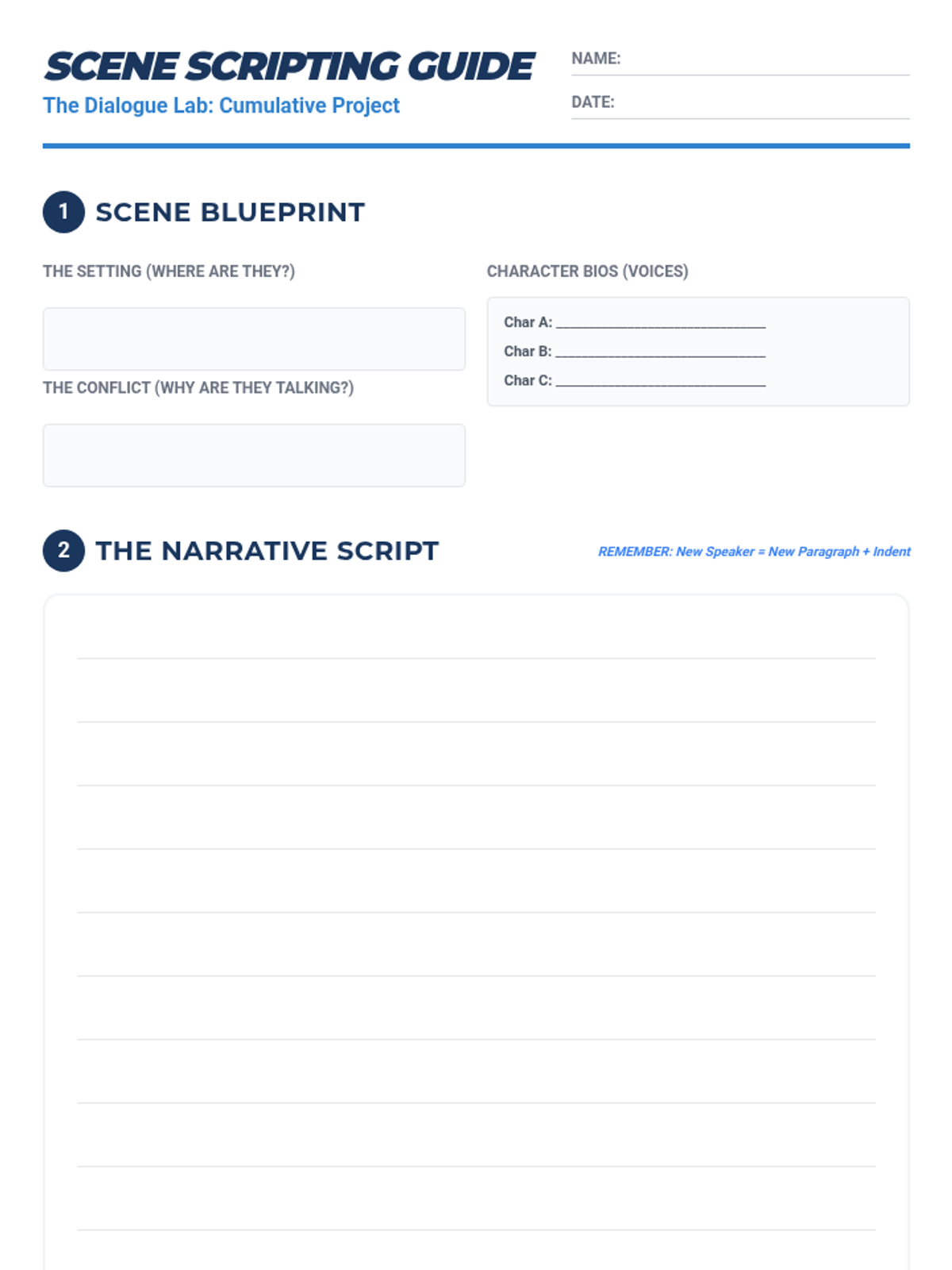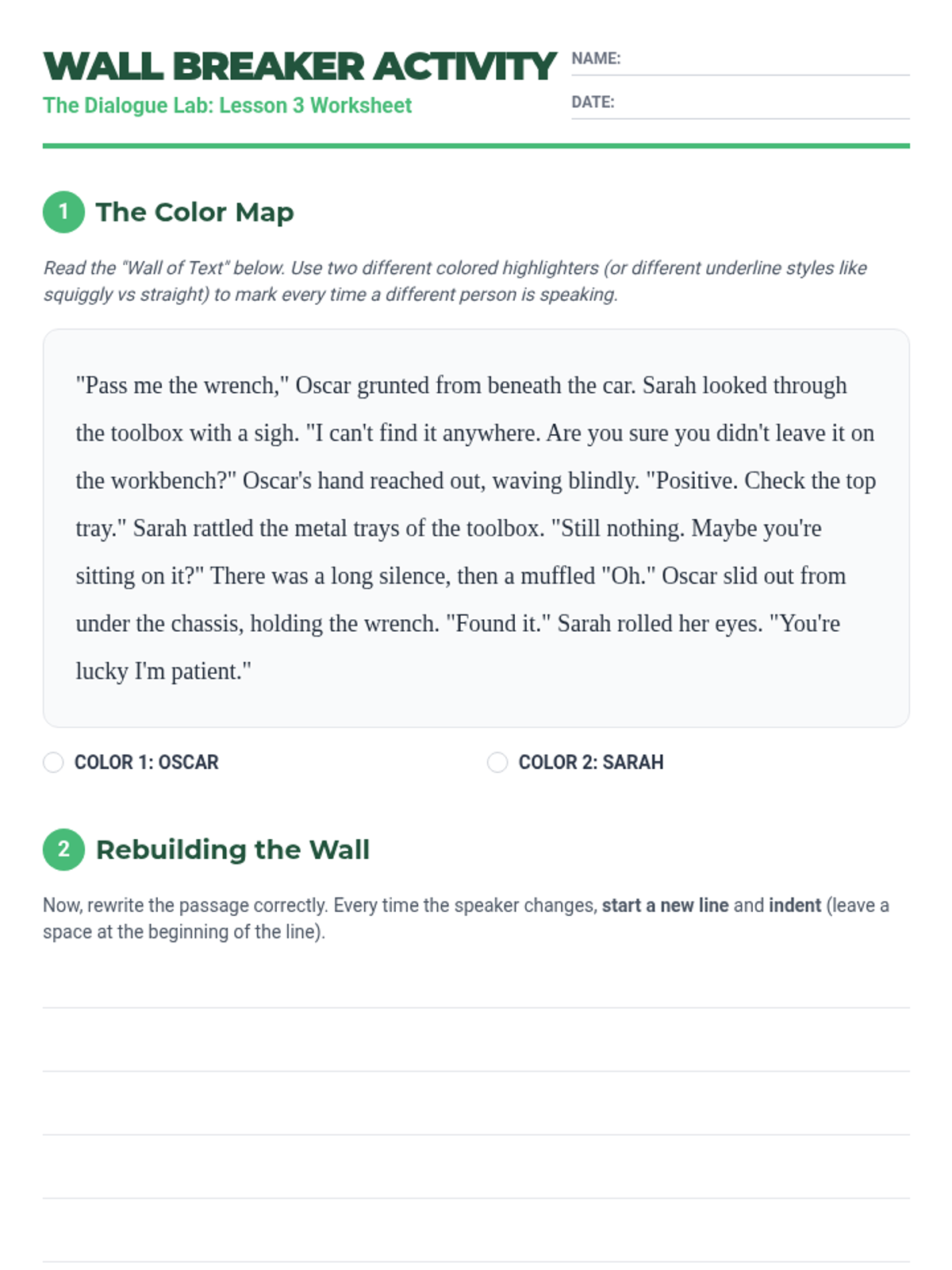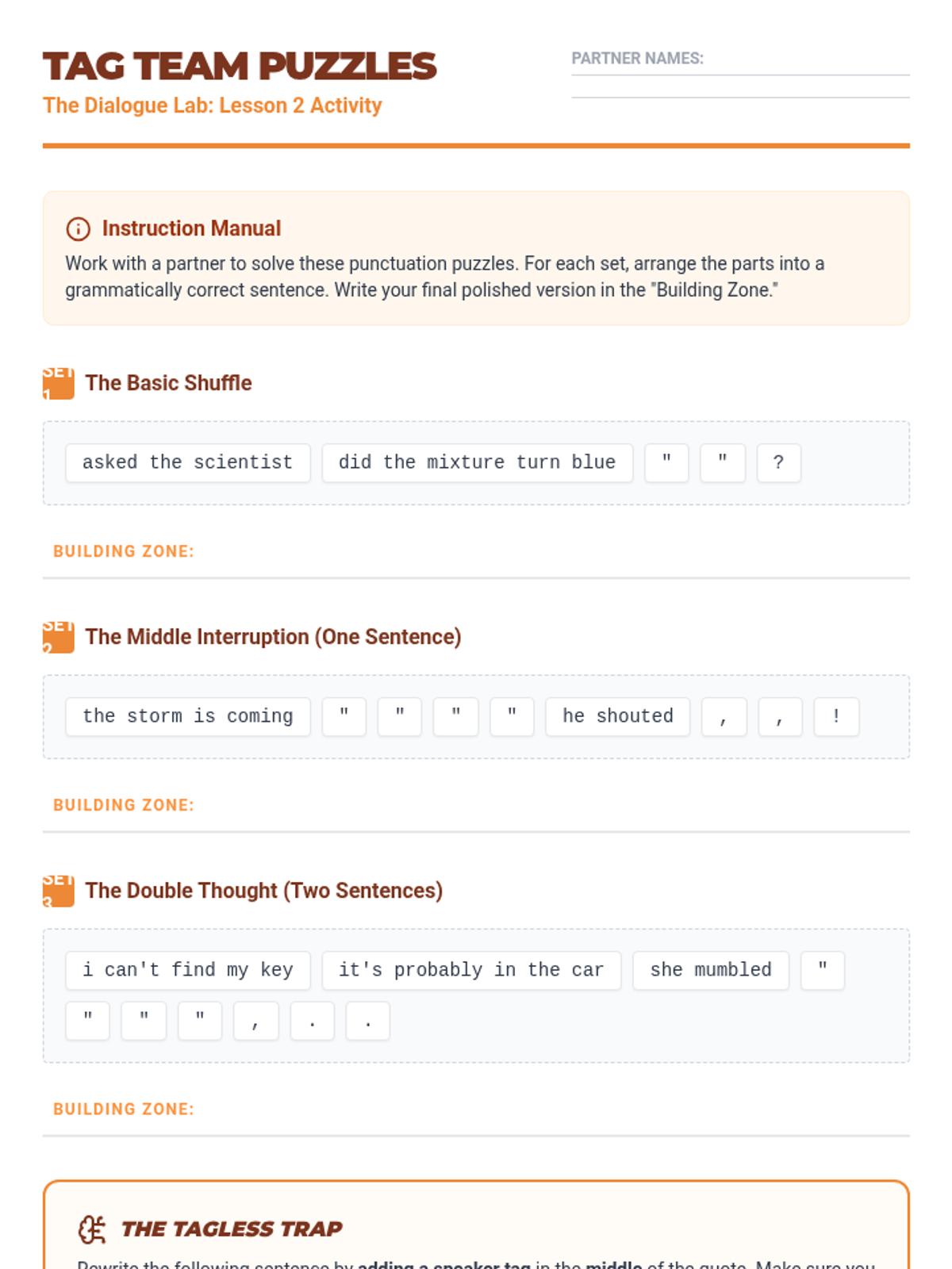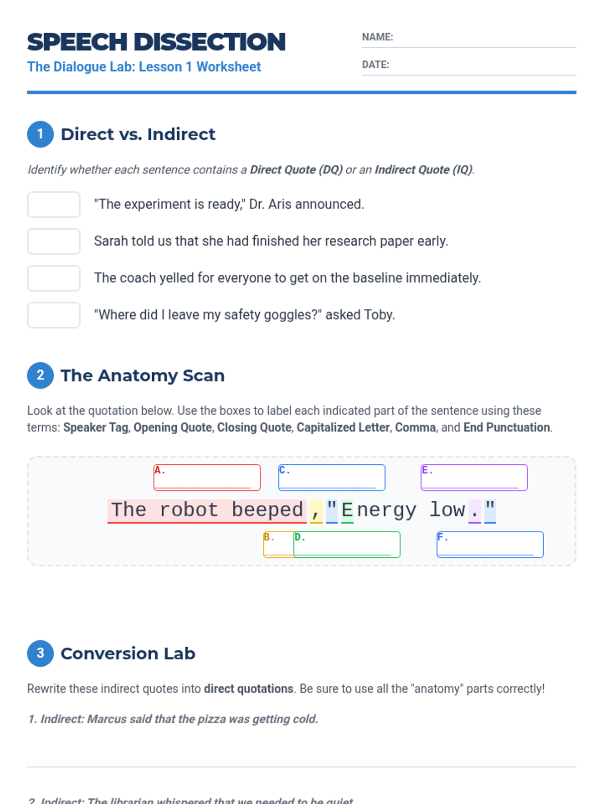 A comprehensive 7th-grade ELA sequence focused on the mechanics of dialogue, from basic punctuation to complex nesting and formatting. Students move through five lessons to master the art of writing clear, authentic character voices.
