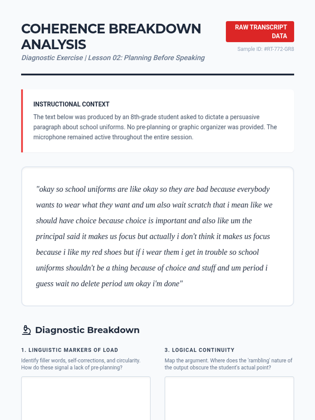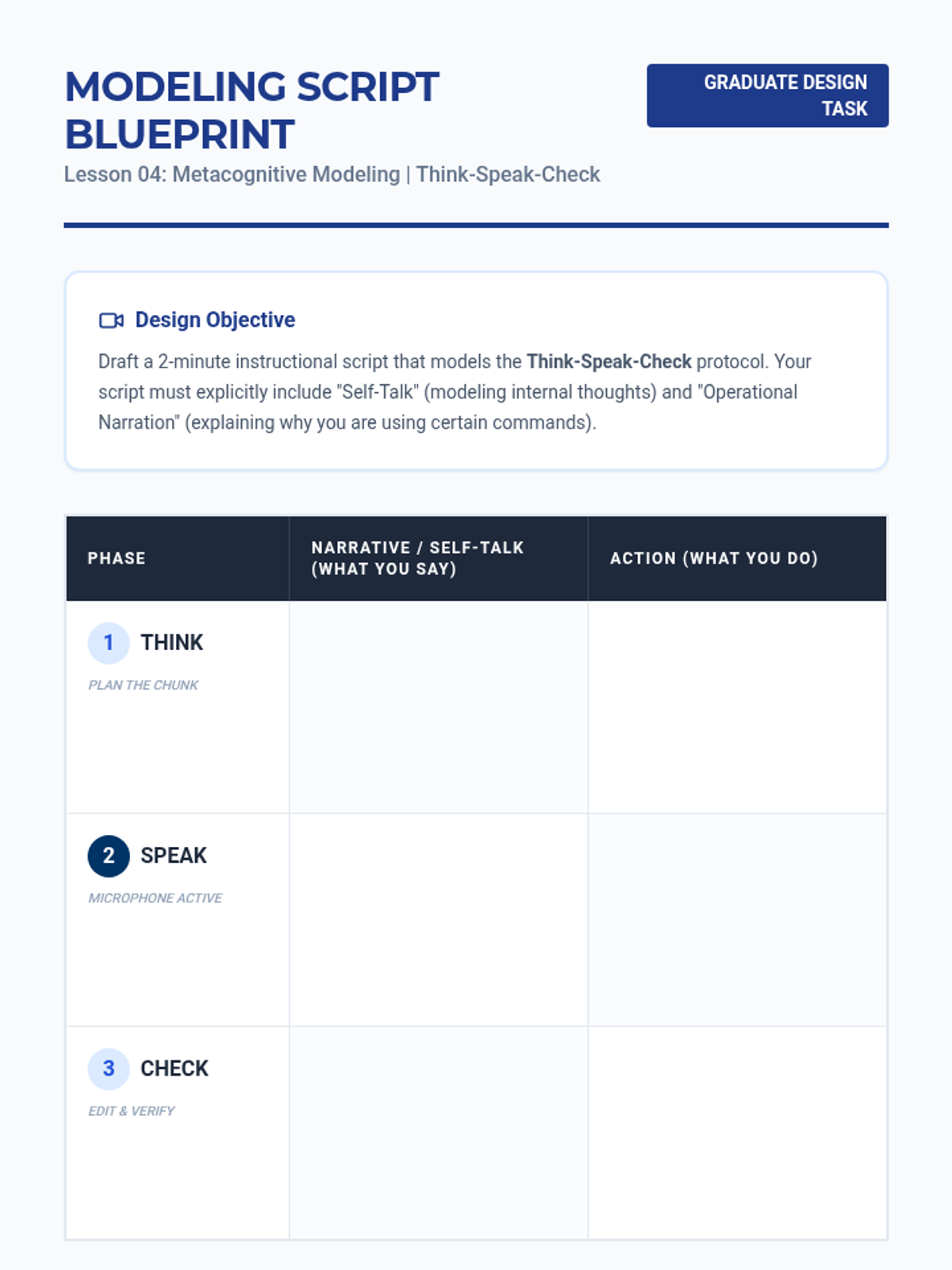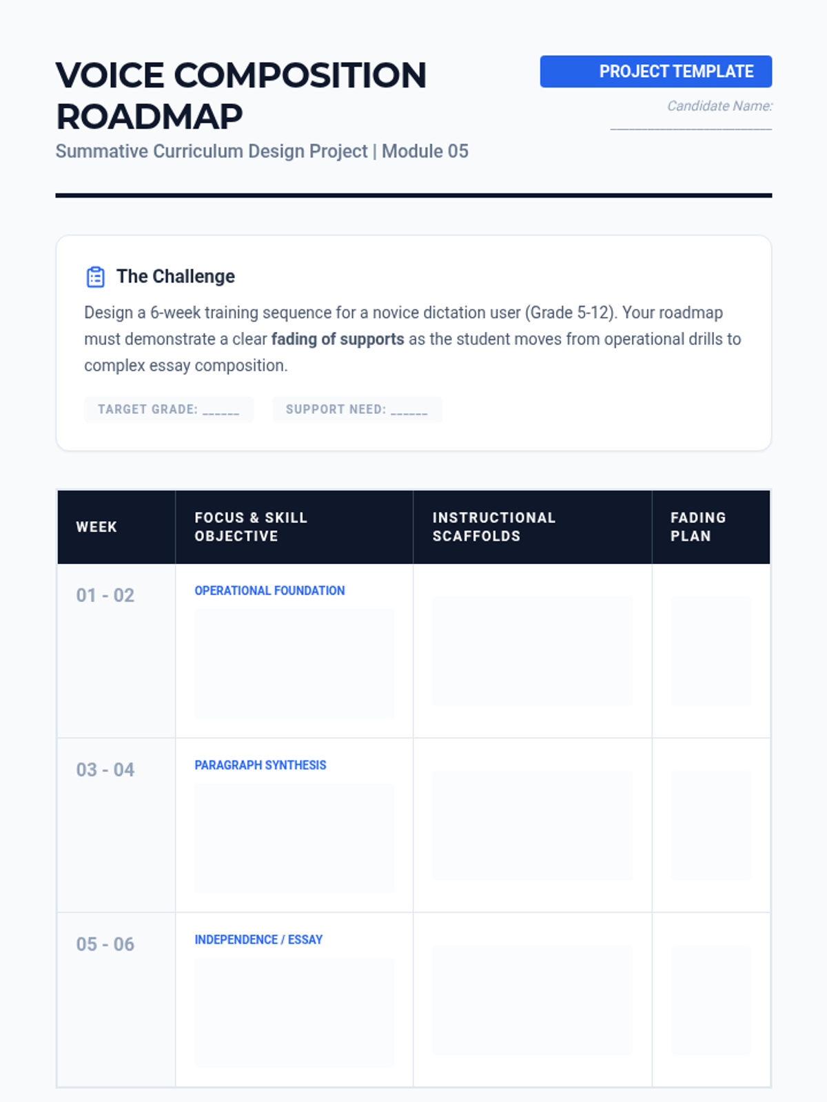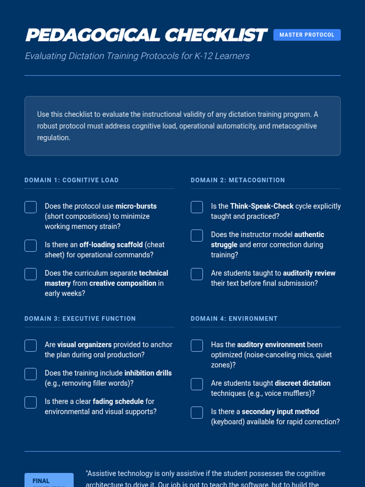 A graduate-level sequence focused on the pedagogy of speech recognition. Students shift from learning the technology to designing instructional protocols that address the cognitive demands of oral composition, specifically for K-12 learners with executive function challenges.