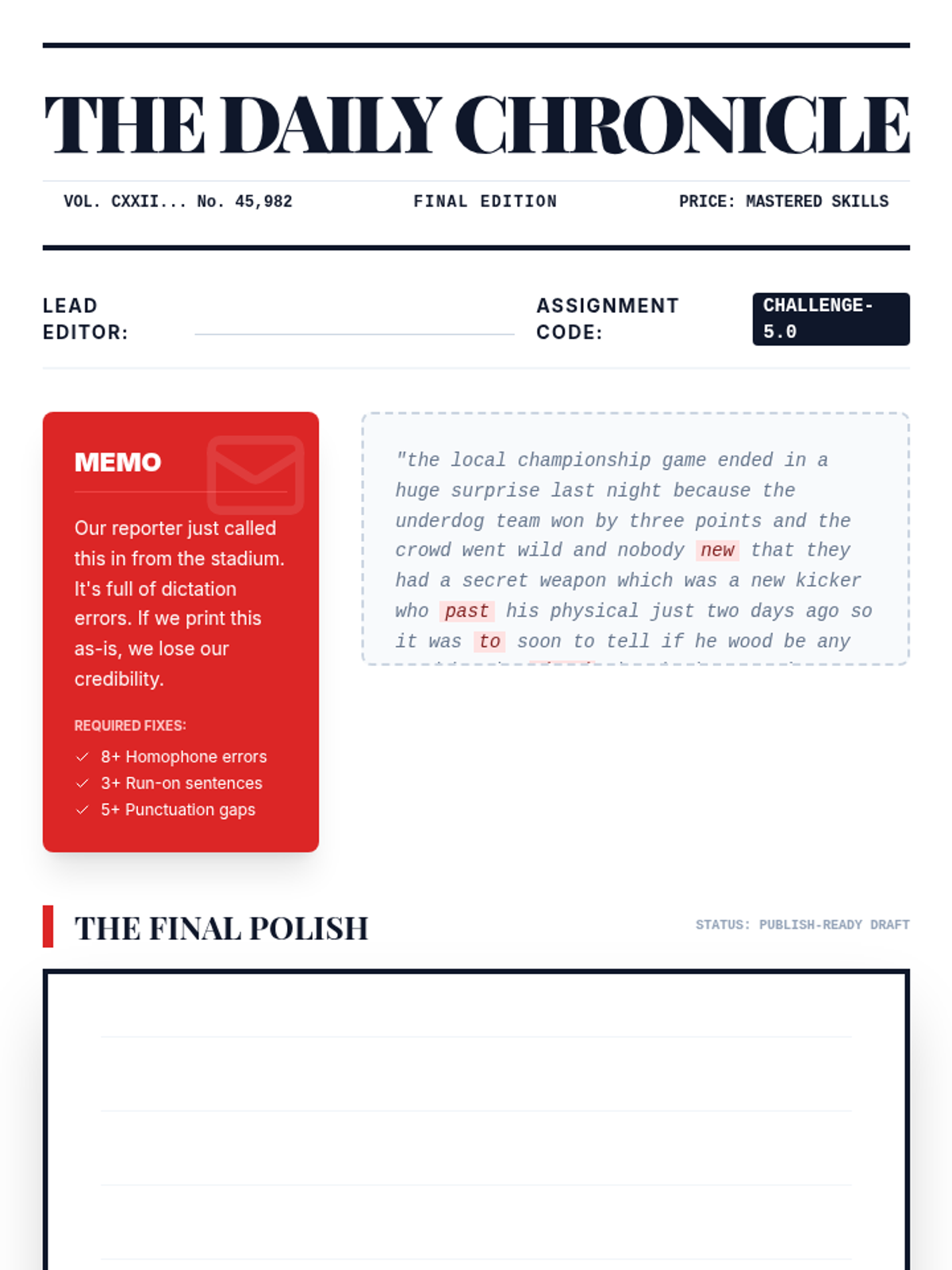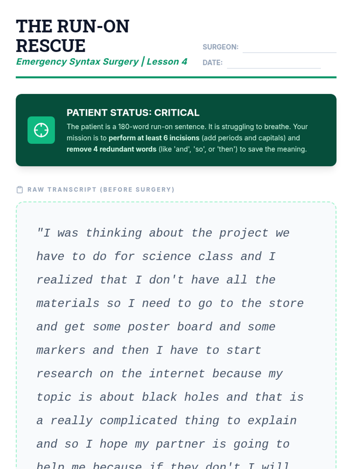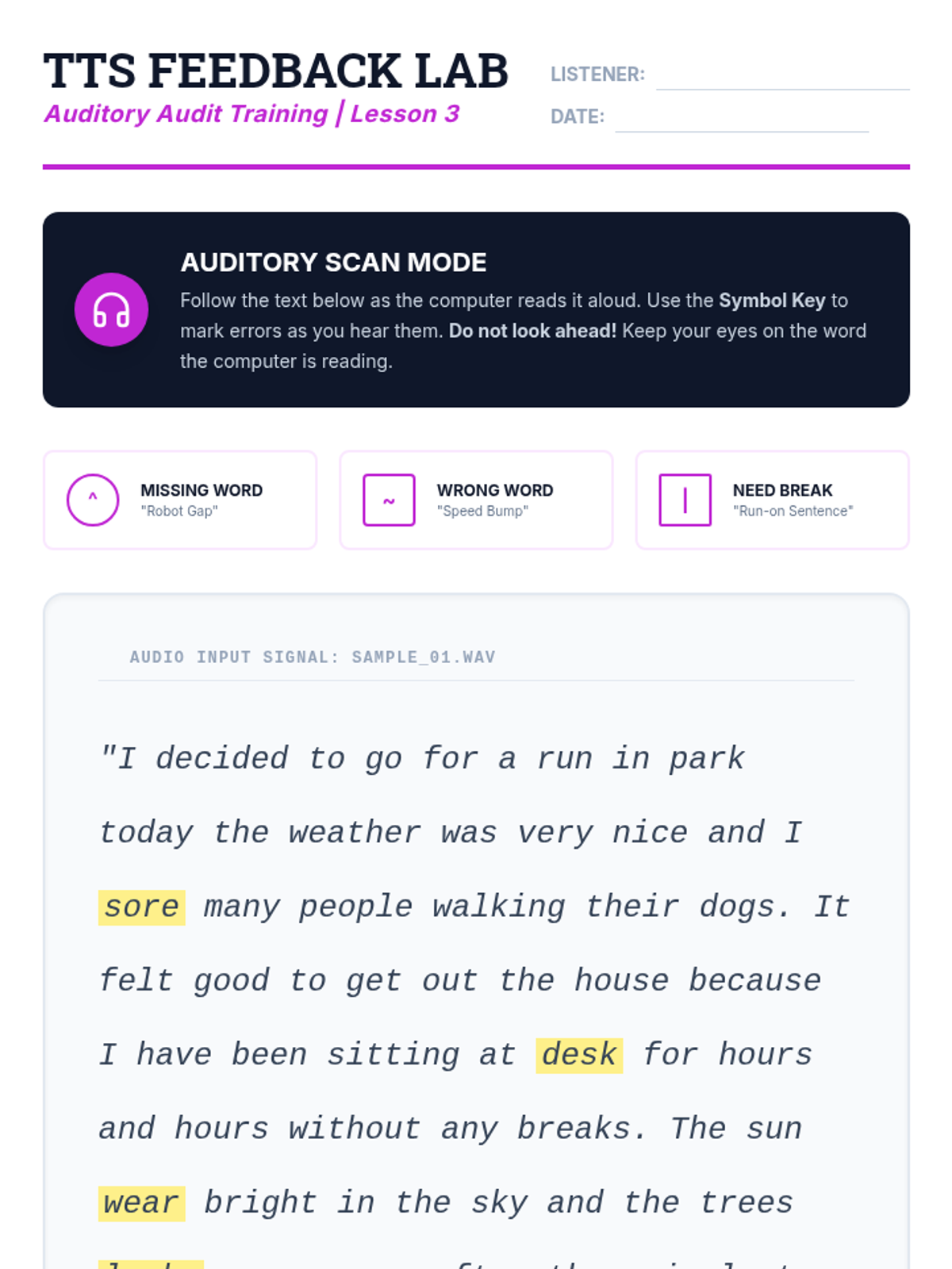This sequence teaches 12th-grade students with diverse learning needs how to master the technical and cognitive skills required for proofreading and editing text generated by speech-to-text (STT) technology. Students move from basic error identification to auditory proofreading and professional-level syntactic refinement.