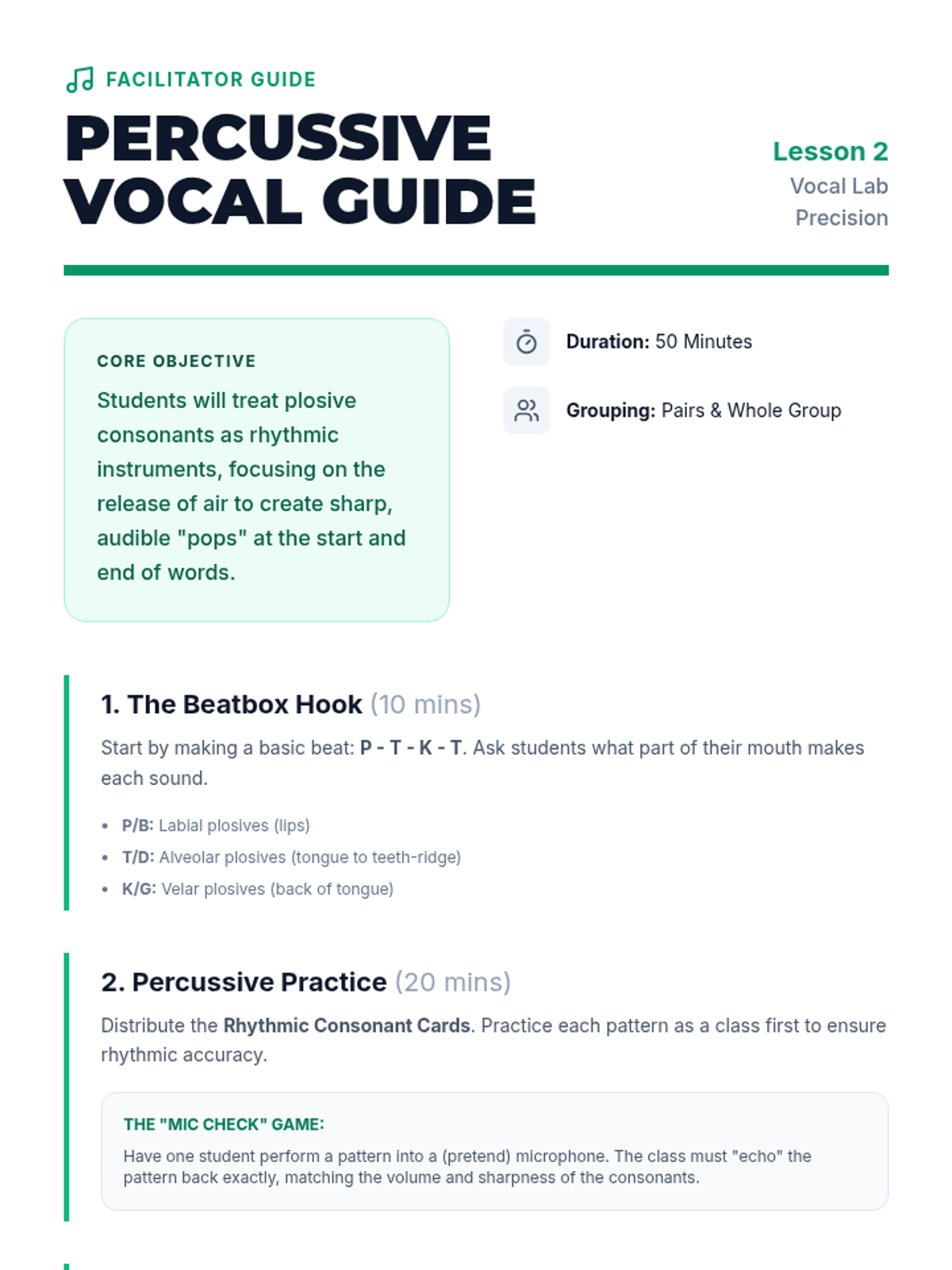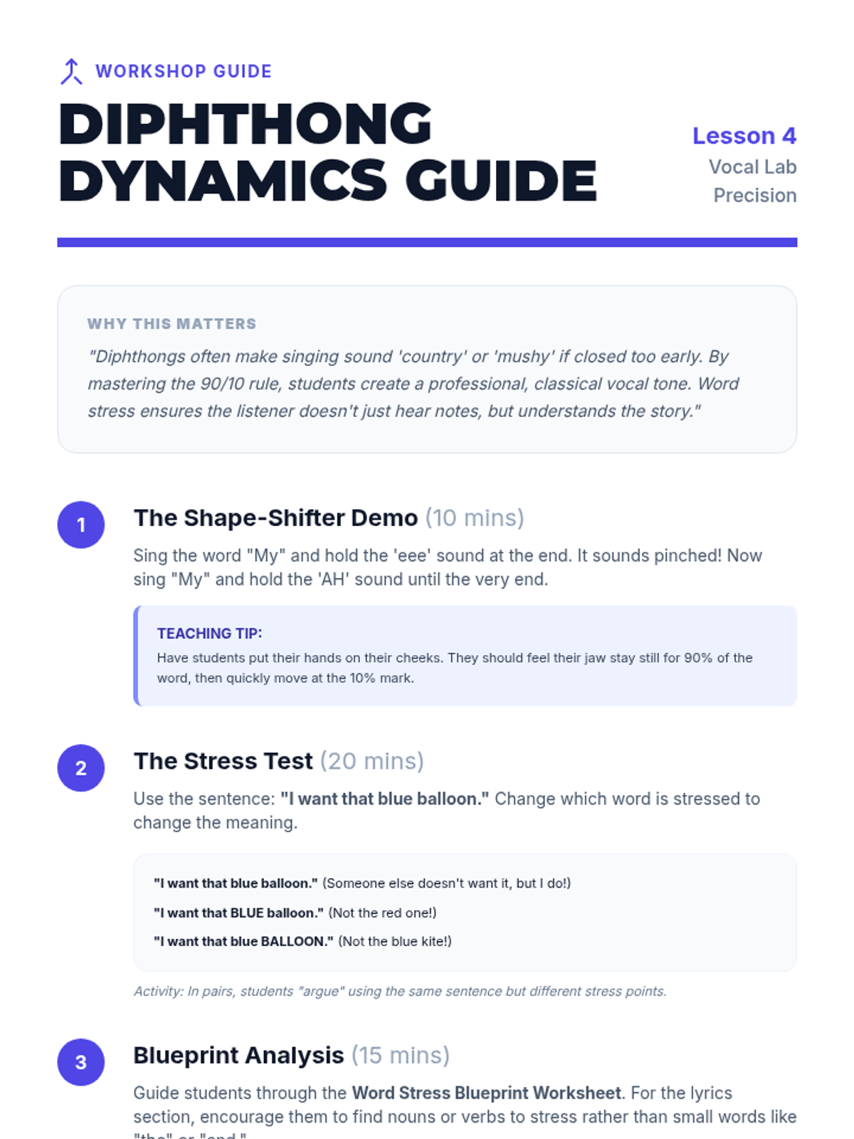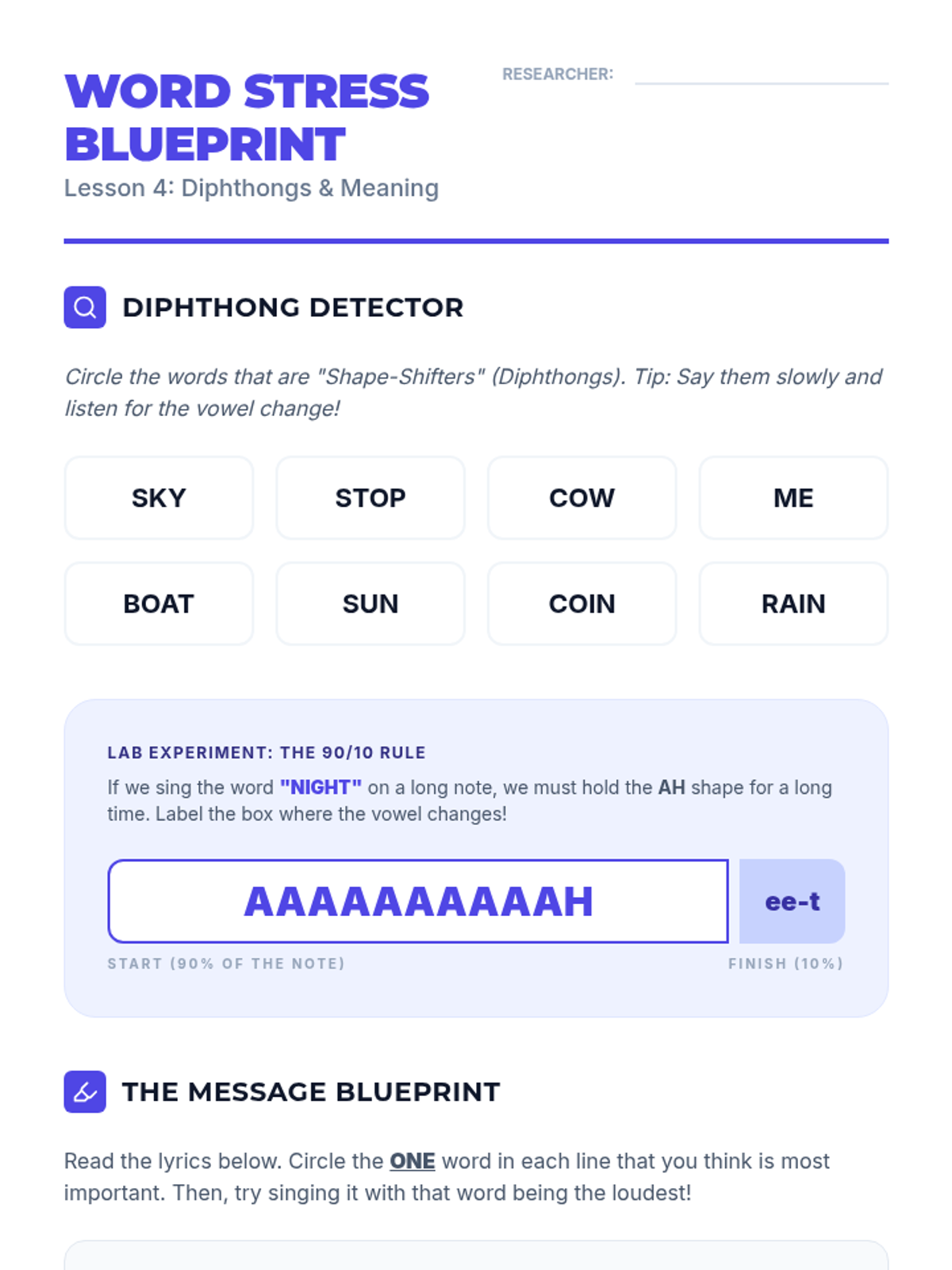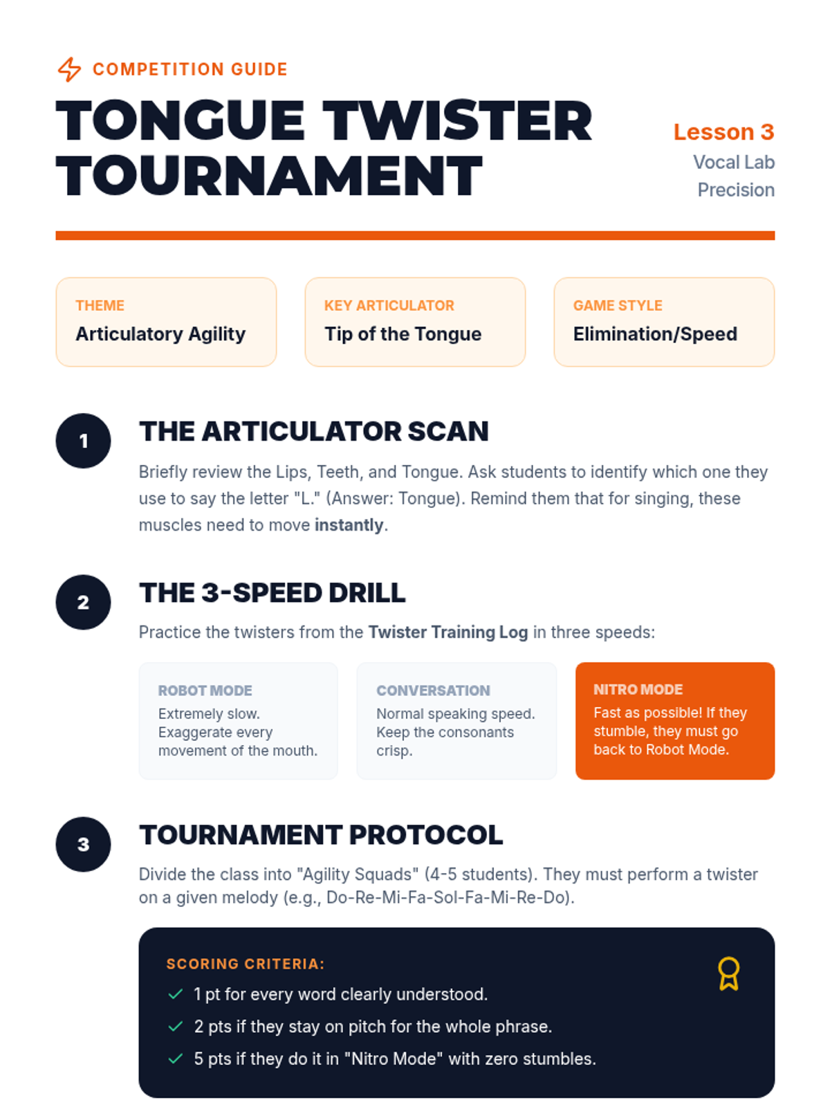 A game-based music sequence for 3rd-grade students focusing on clear diction, vowel shaping, and articulatory agility in singing. Students progress from basic vowel shapes to complex diphthongs and percussive consonants, culminating in a clear vocal performance.