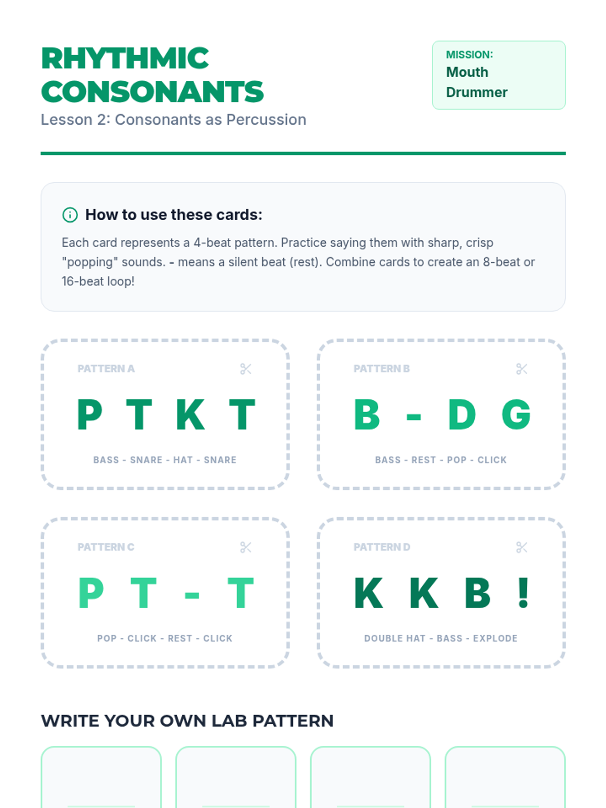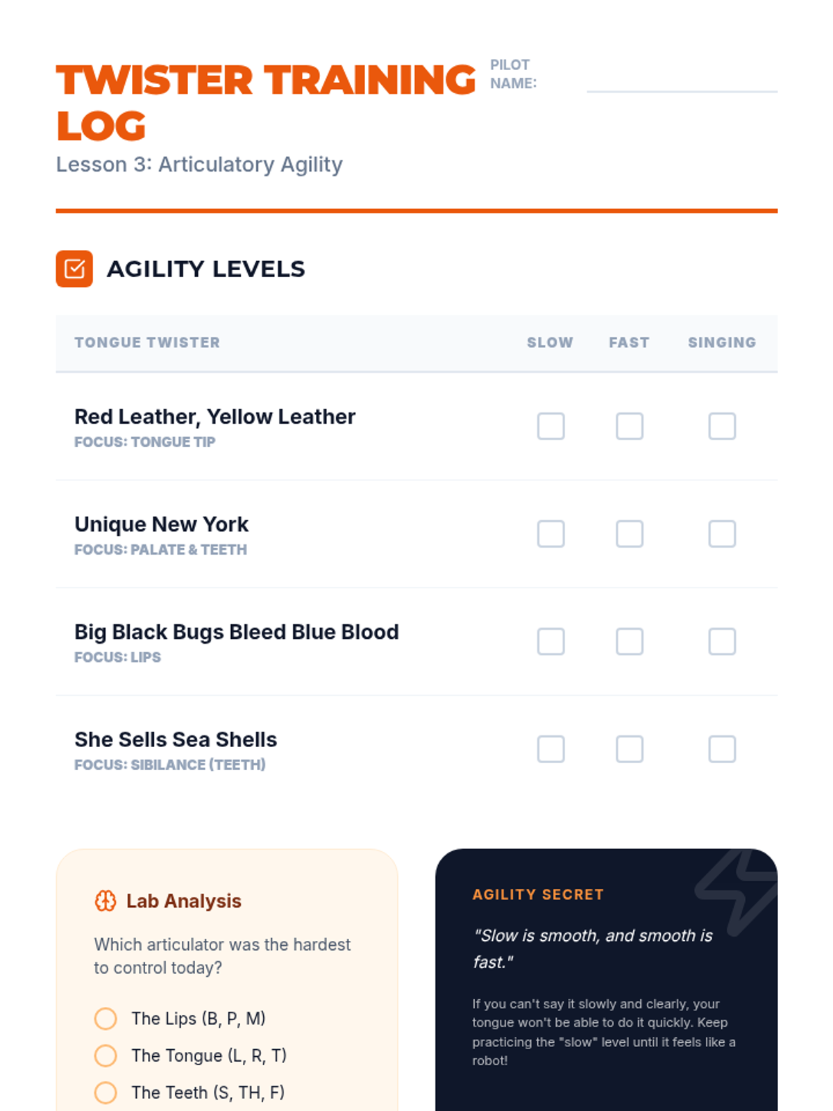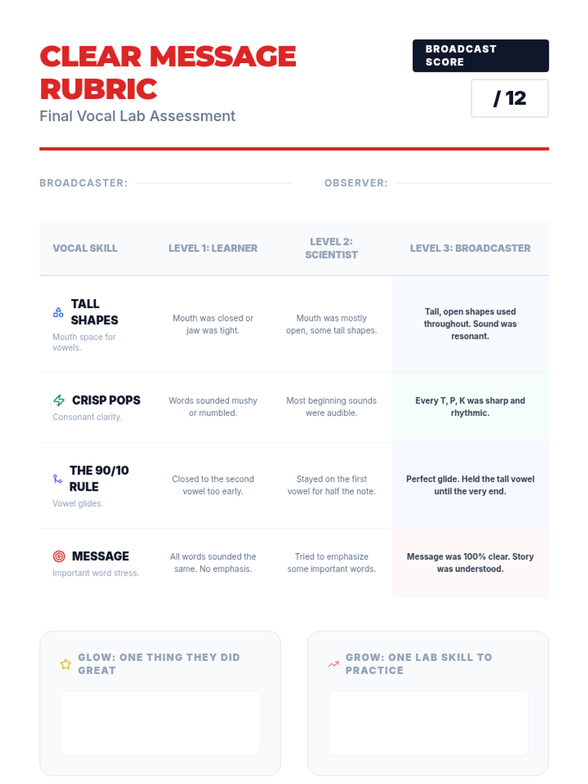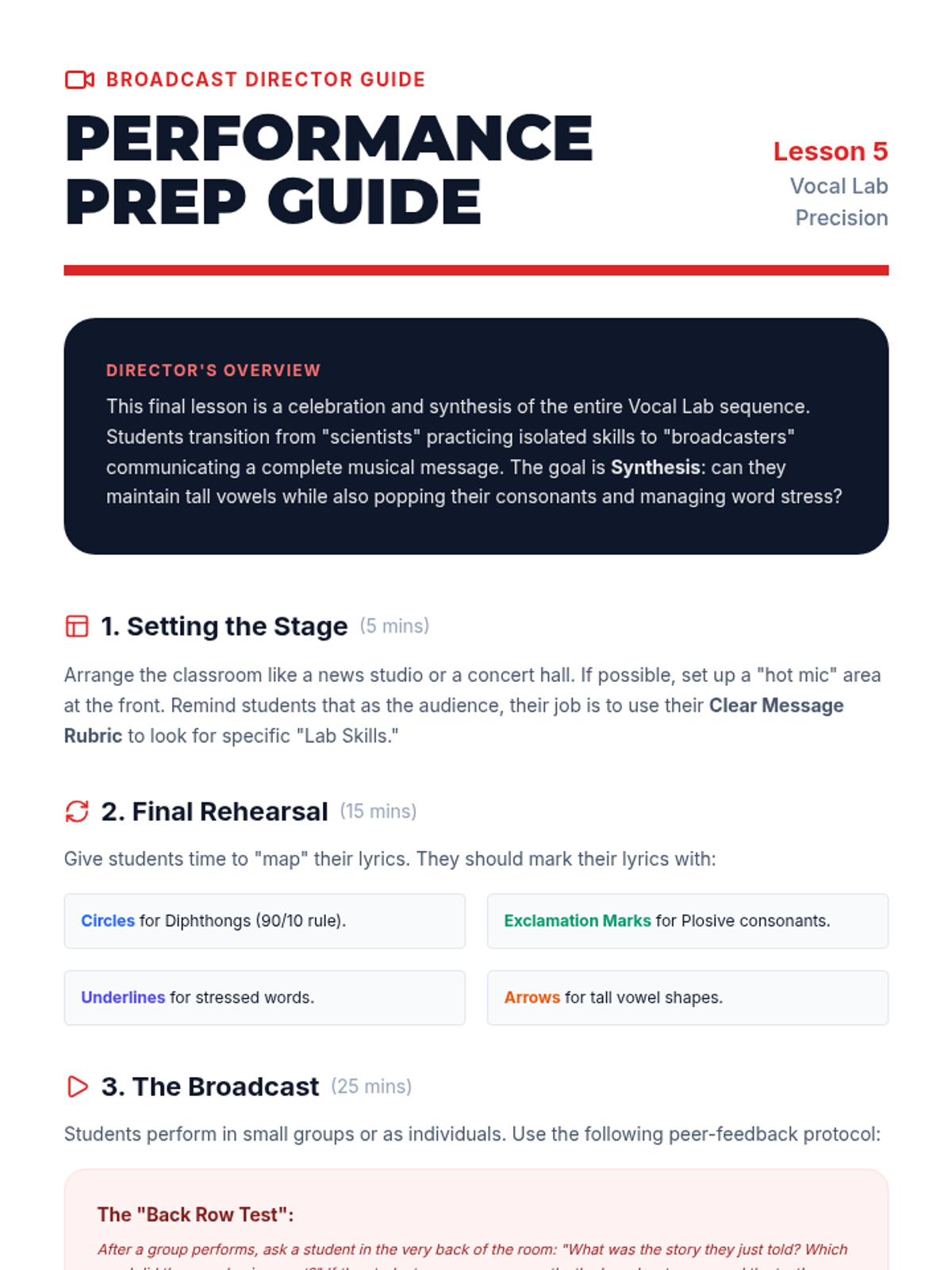 A game-based music sequence for 3rd-grade students focusing on clear diction, vowel shaping, and articulatory agility in singing. Students progress from basic vowel shapes to complex diphthongs and percussive consonants, culminating in a clear vocal performance.