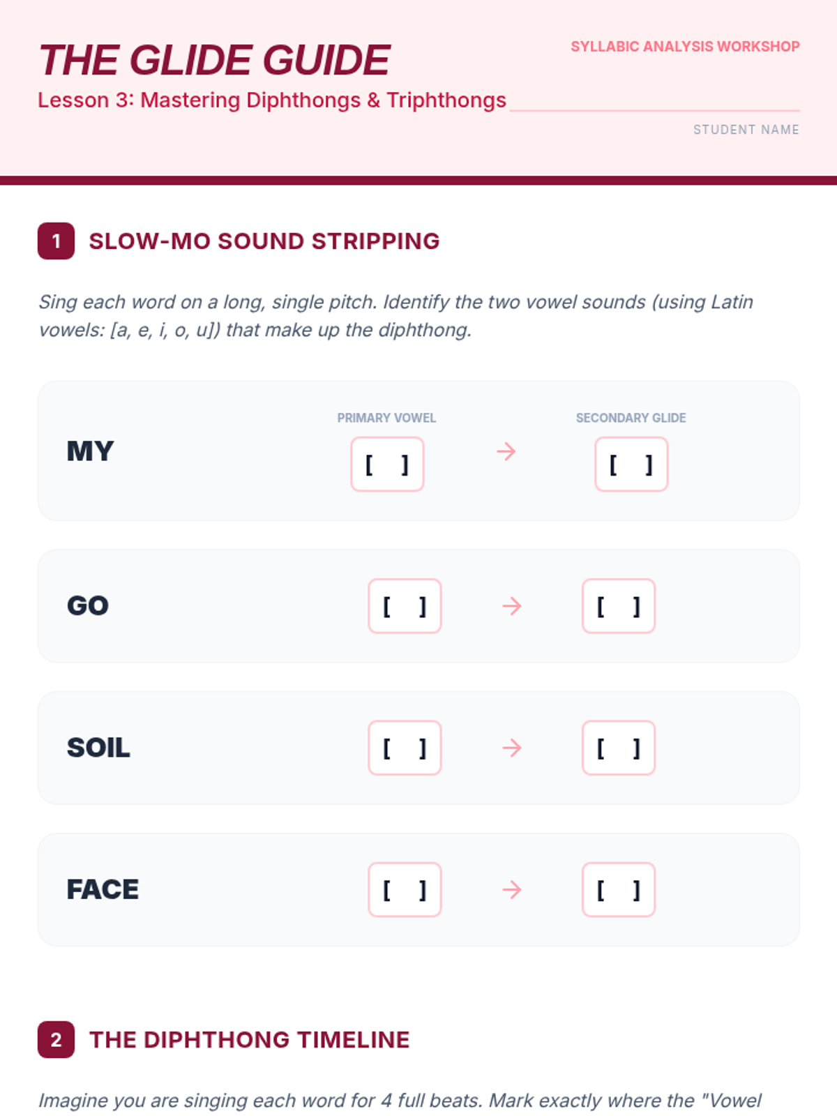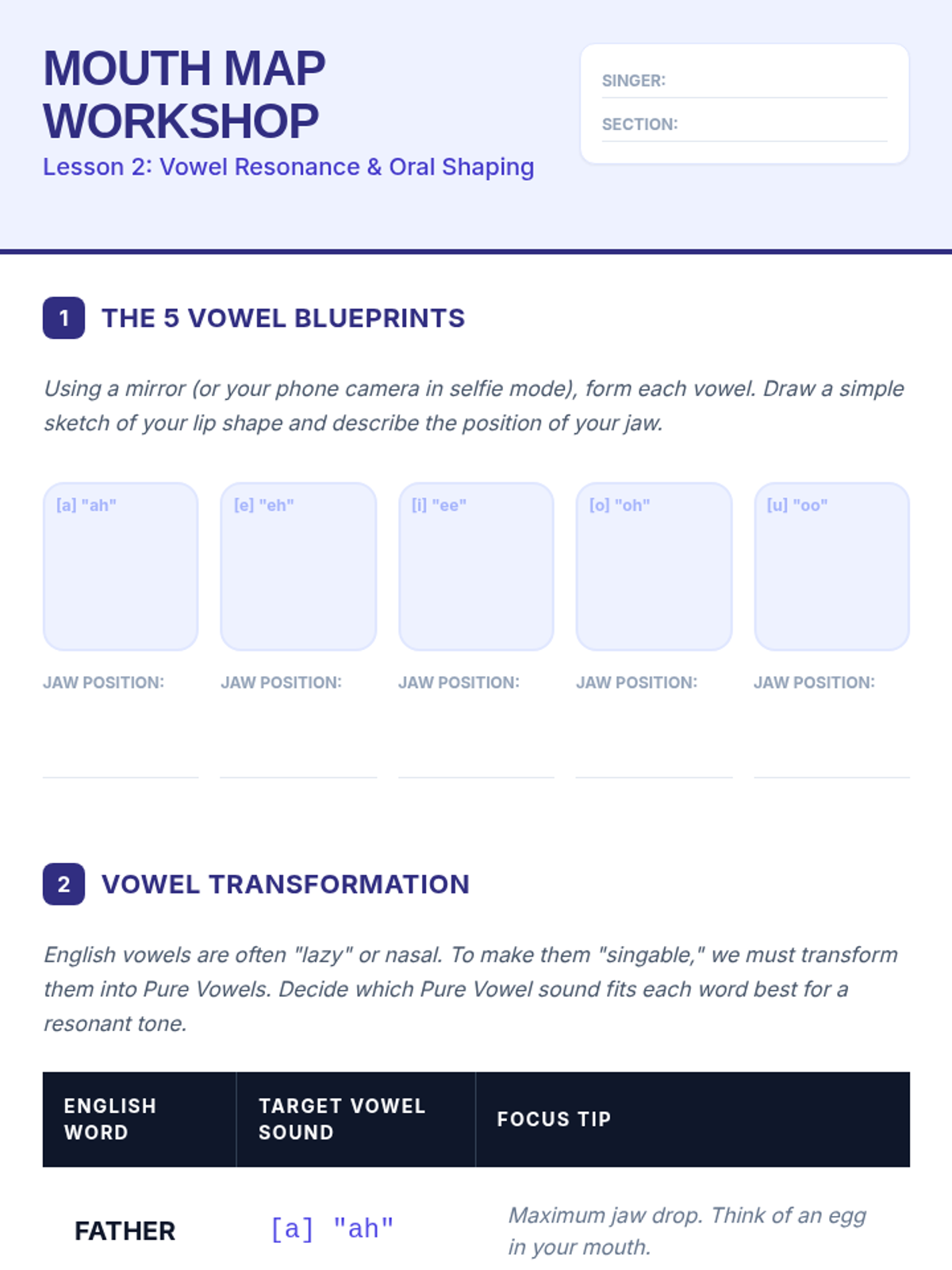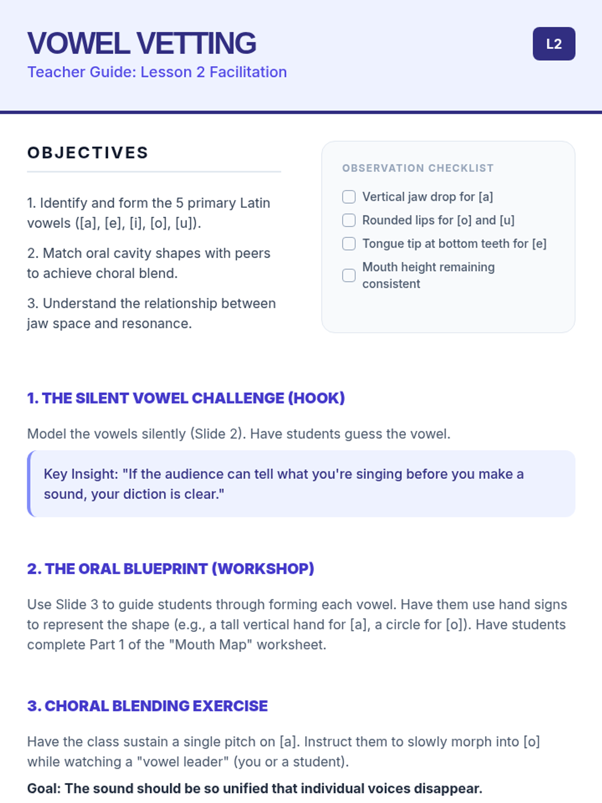 A comprehensive sequence for 6th-grade singers focusing on articulation and diction. Students progress from using consonants as rhythmic tools to mastering pure vowels, diphthongs, and the International Phonetic Alphabet (IPA).