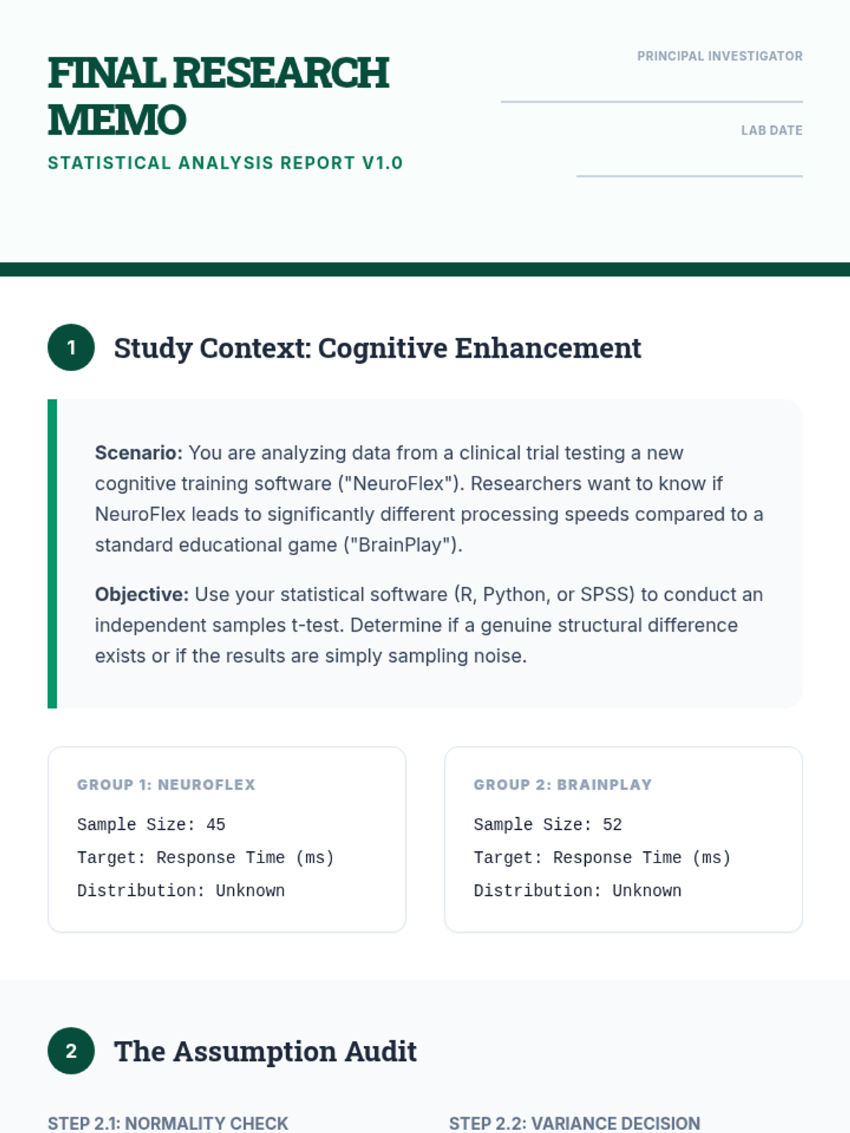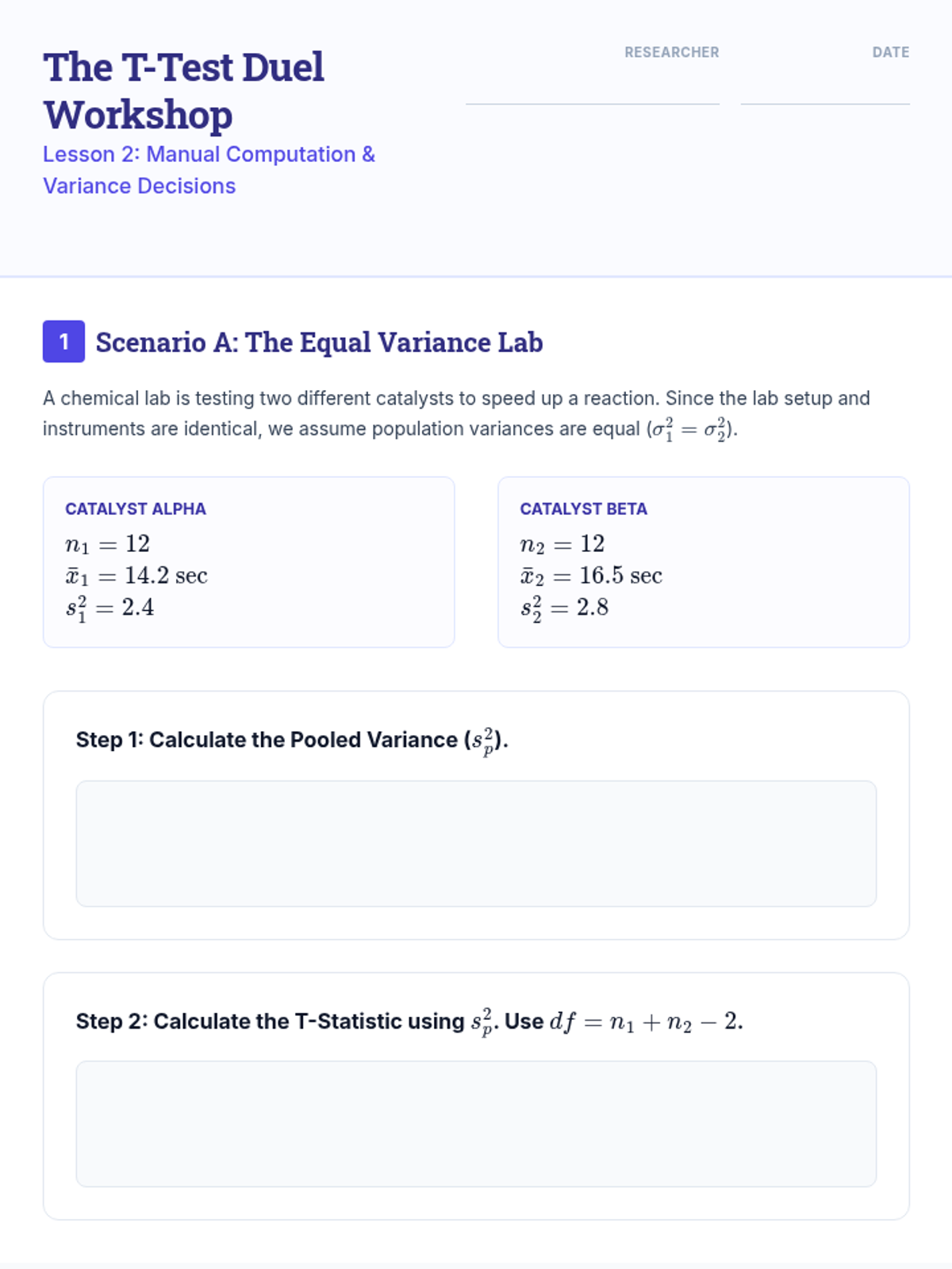 This sequence covers the theoretical and practical application of comparing means between two independent groups. Students progress from understanding sampling distributions and standard errors to performing pooled and unpooled t-tests, constructing confidence intervals, and verifying statistical assumptions using diagnostic tools.