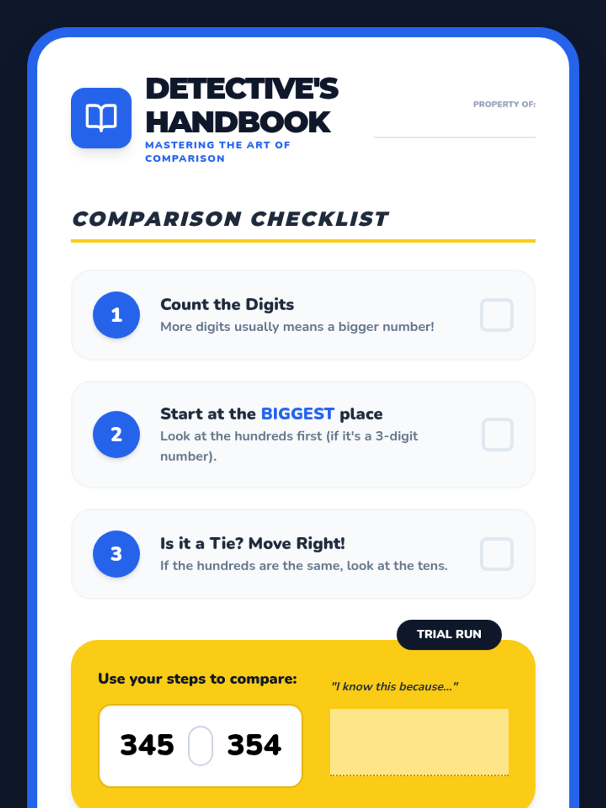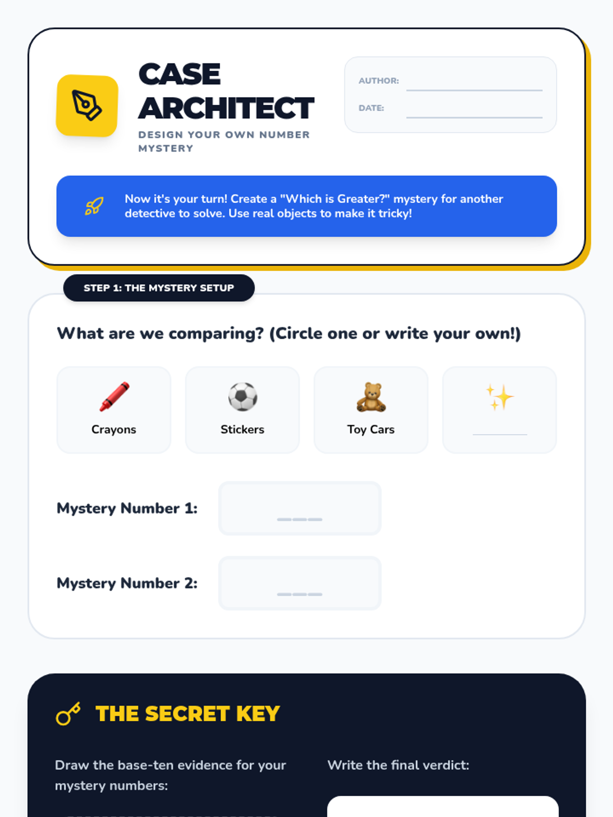 A playful, detective-themed math sequence for 3rd grade students to master number comparison. Students become 'Digit Detectives' as they investigate place value mysteries, solve 'blunders' made by a messy professor, and create their own case files using concrete models like base-ten blocks and number lines.