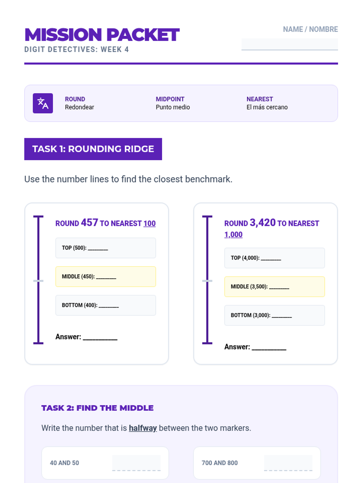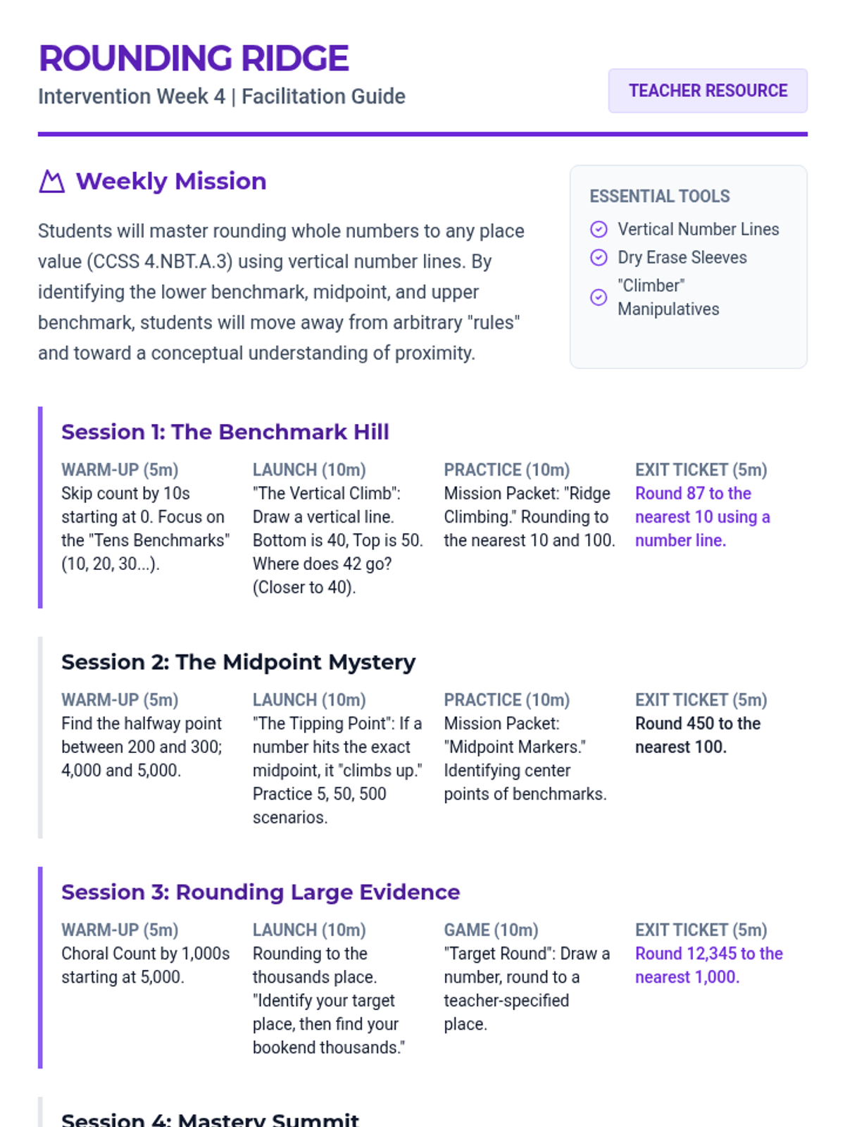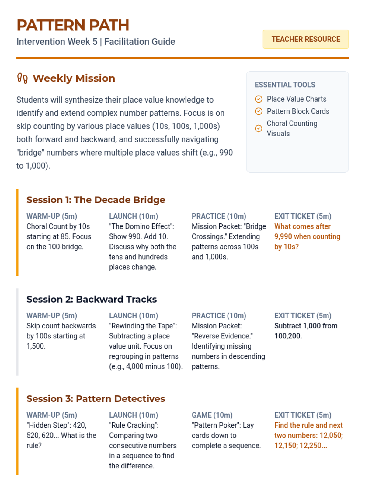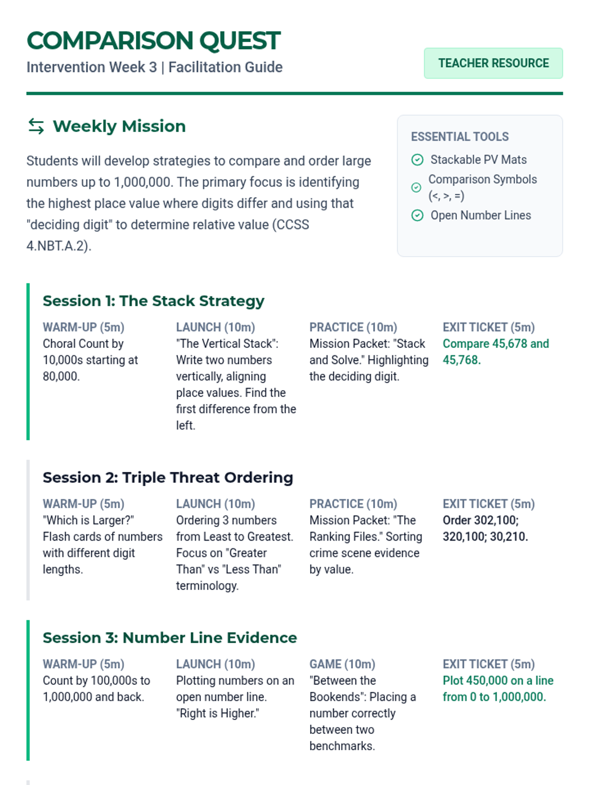 A comprehensive 5-week Tier 3 intervention for grades 4-6 focusing on foundational place value concepts from grades 1-4. The sequence uses a 'Digit Detectives' mystery theme to engage students in mastering place value relationships, large numbers, comparison, rounding, and number patterns.