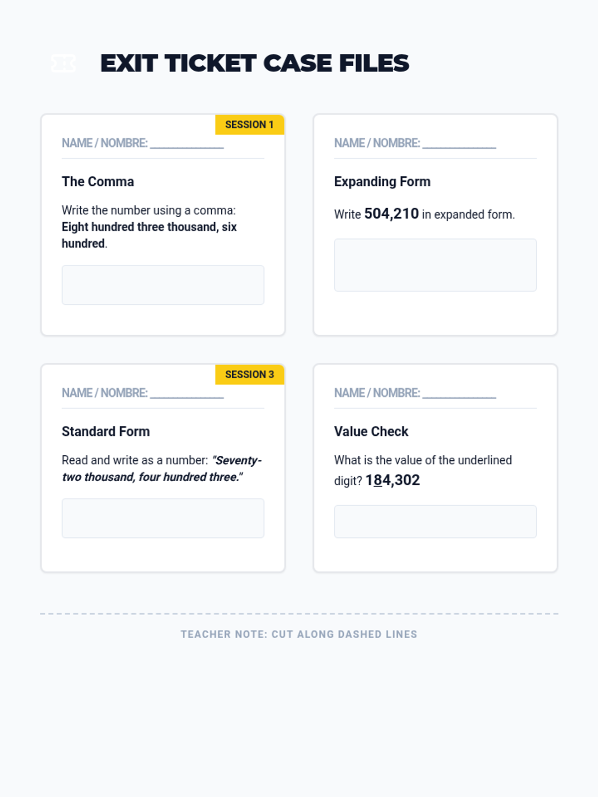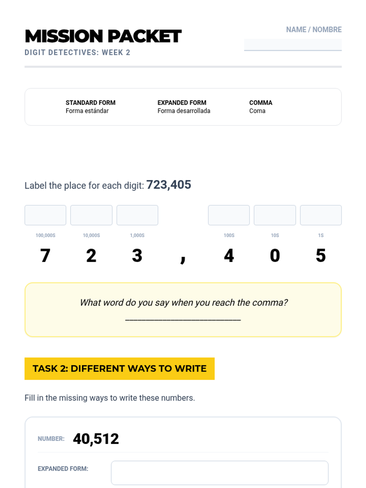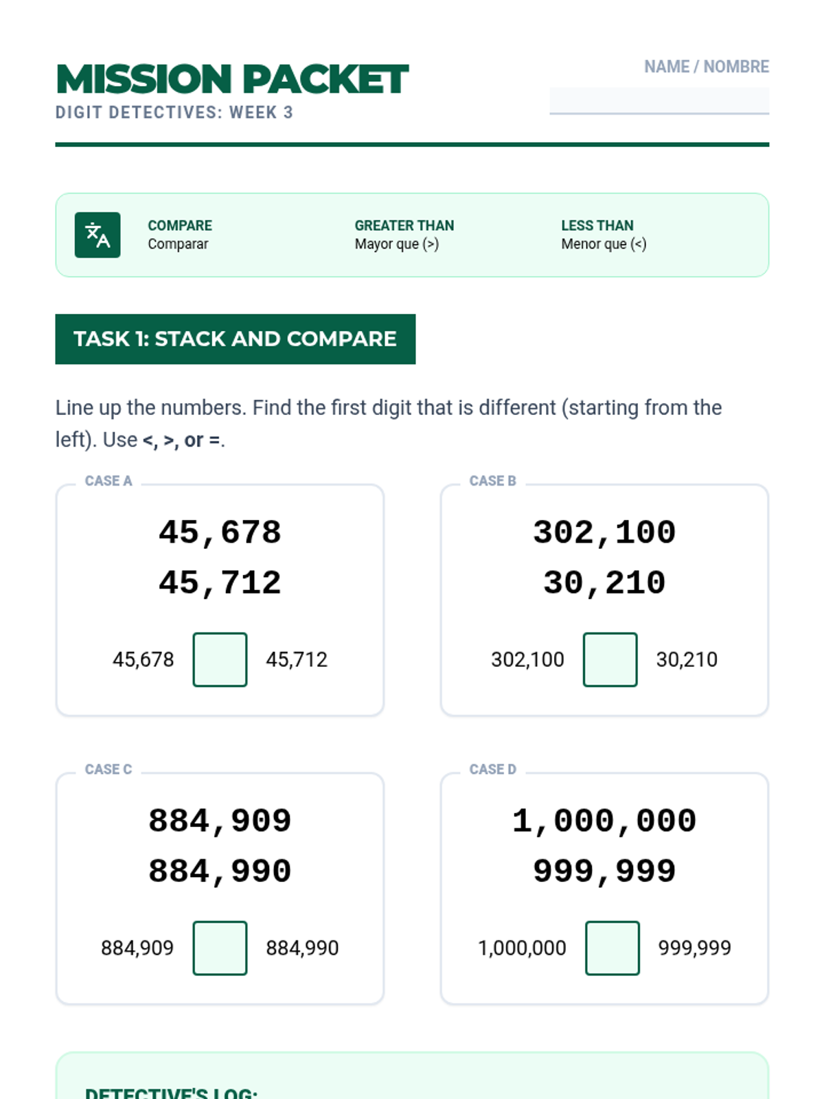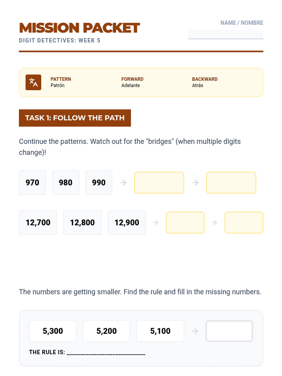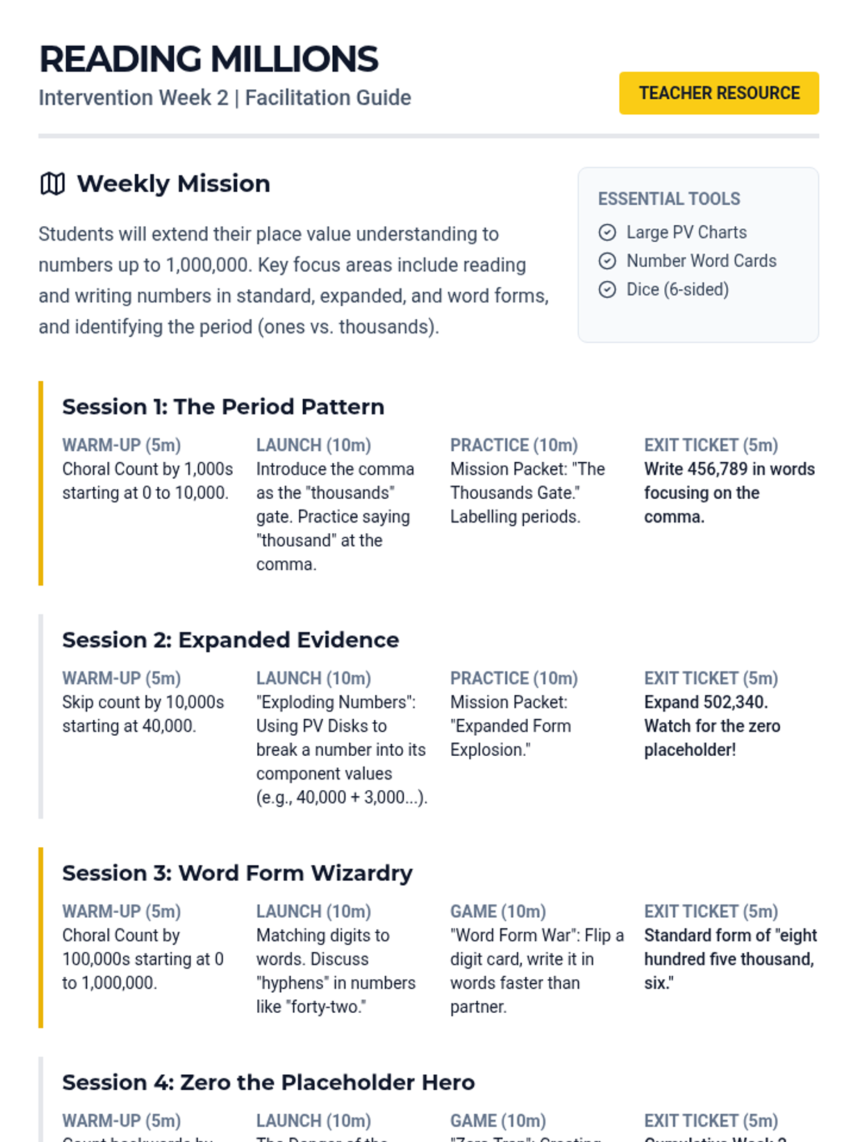 A comprehensive 5-week Tier 3 intervention for grades 4-6 focusing on foundational place value concepts from grades 1-4. The sequence uses a 'Digit Detectives' mystery theme to engage students in mastering place value relationships, large numbers, comparison, rounding, and number patterns.