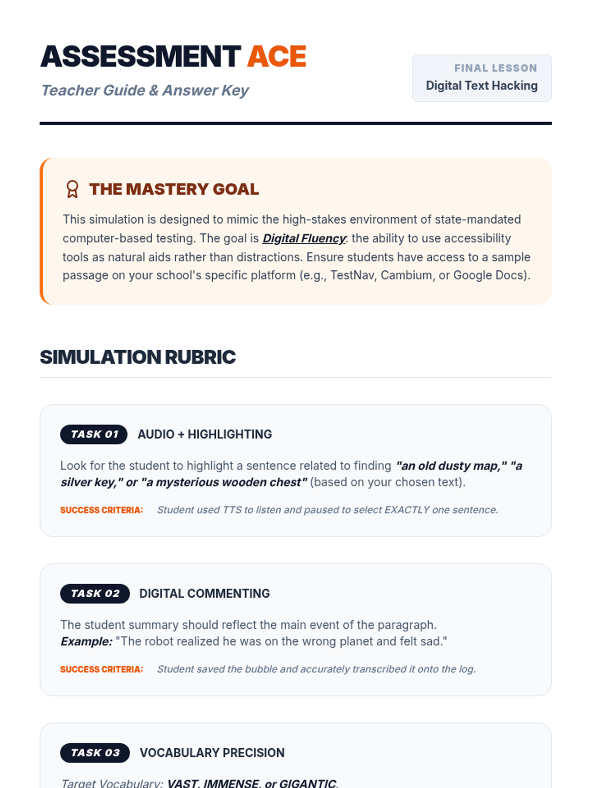 This sequence teaches 4th-grade students how to use digital annotation tools—like highlighting, commenting, and text-to-speech—to support reading comprehension and prepare for computer-based assessments. It is designed specifically for students needing academic support or accommodations.