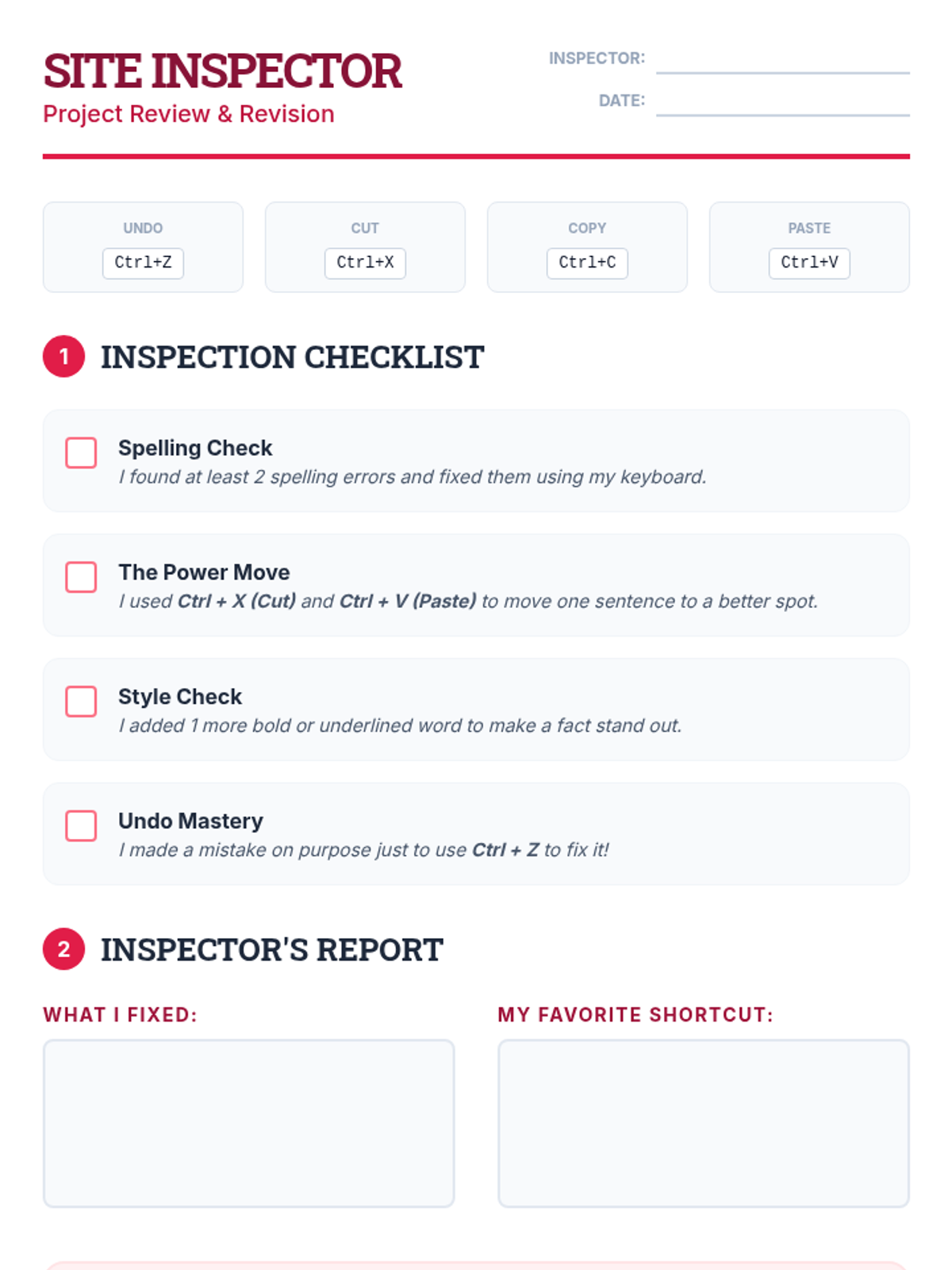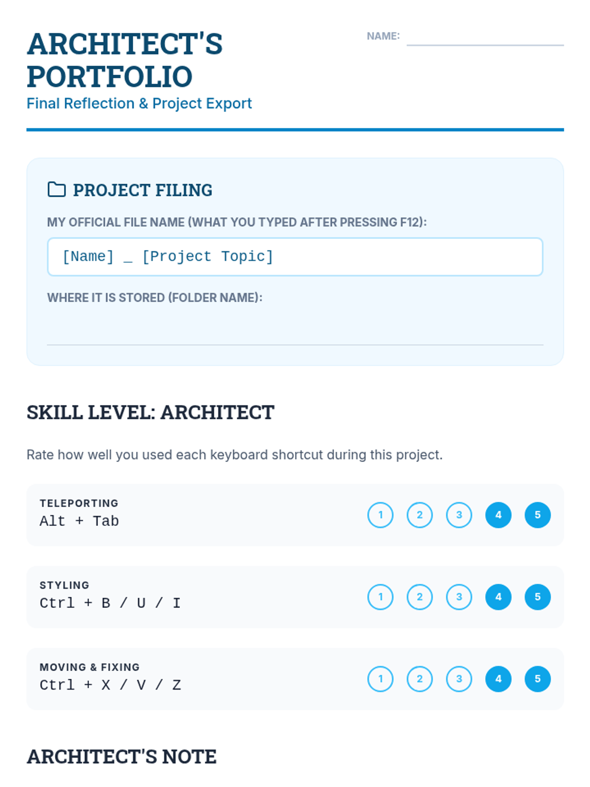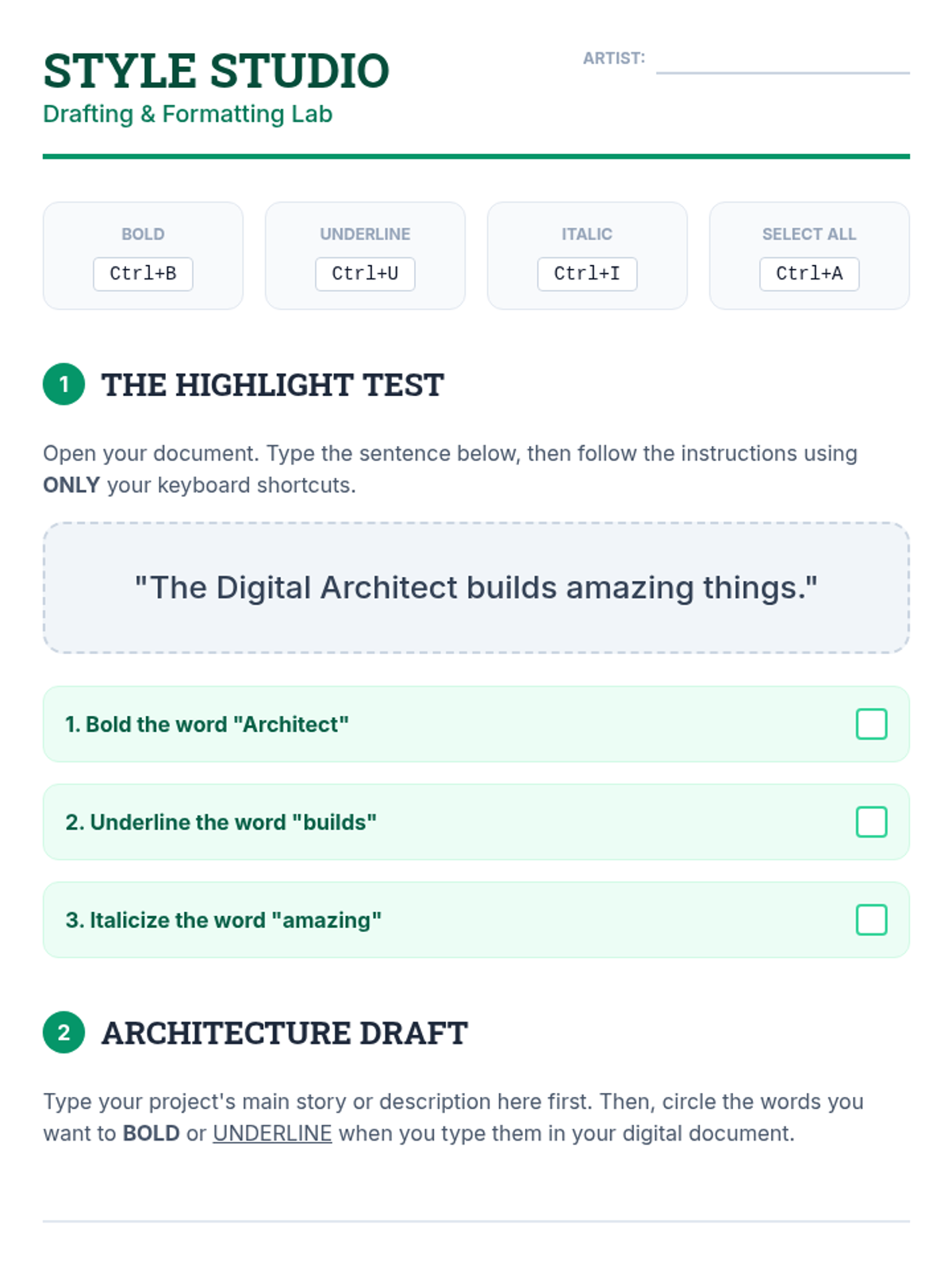 A project-based sequence for 3rd graders to master assistive technology through keyboard shortcuts. Students act as 'Digital Architects,' building a project from setup to final save using essential navigation and formatting commands.