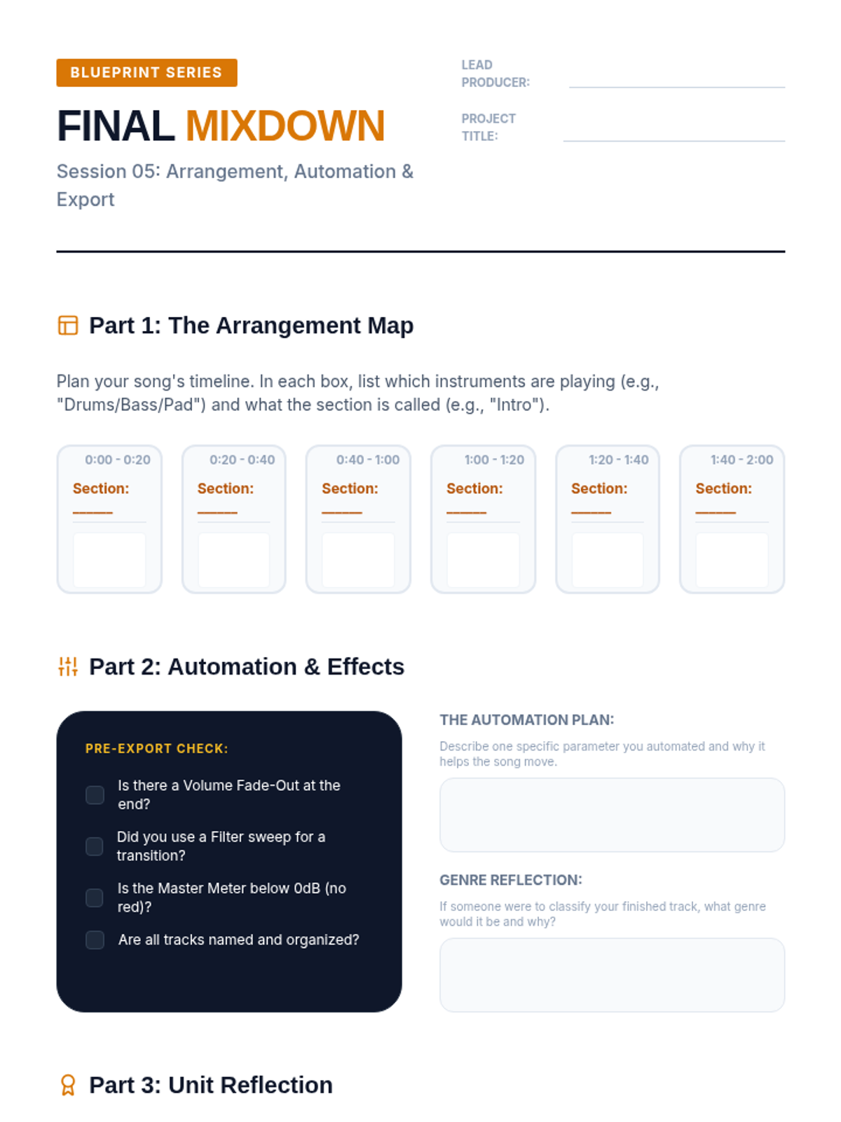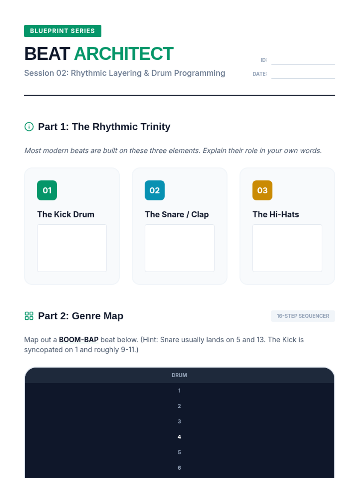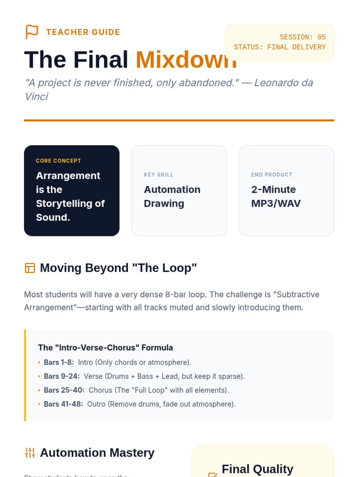 A comprehensive introduction to modern music production using Digital Audio Workstations (DAWs). Students progress from basic MIDI sequencing to advanced arrangement and sound design, culminating in a finished instrumental track.