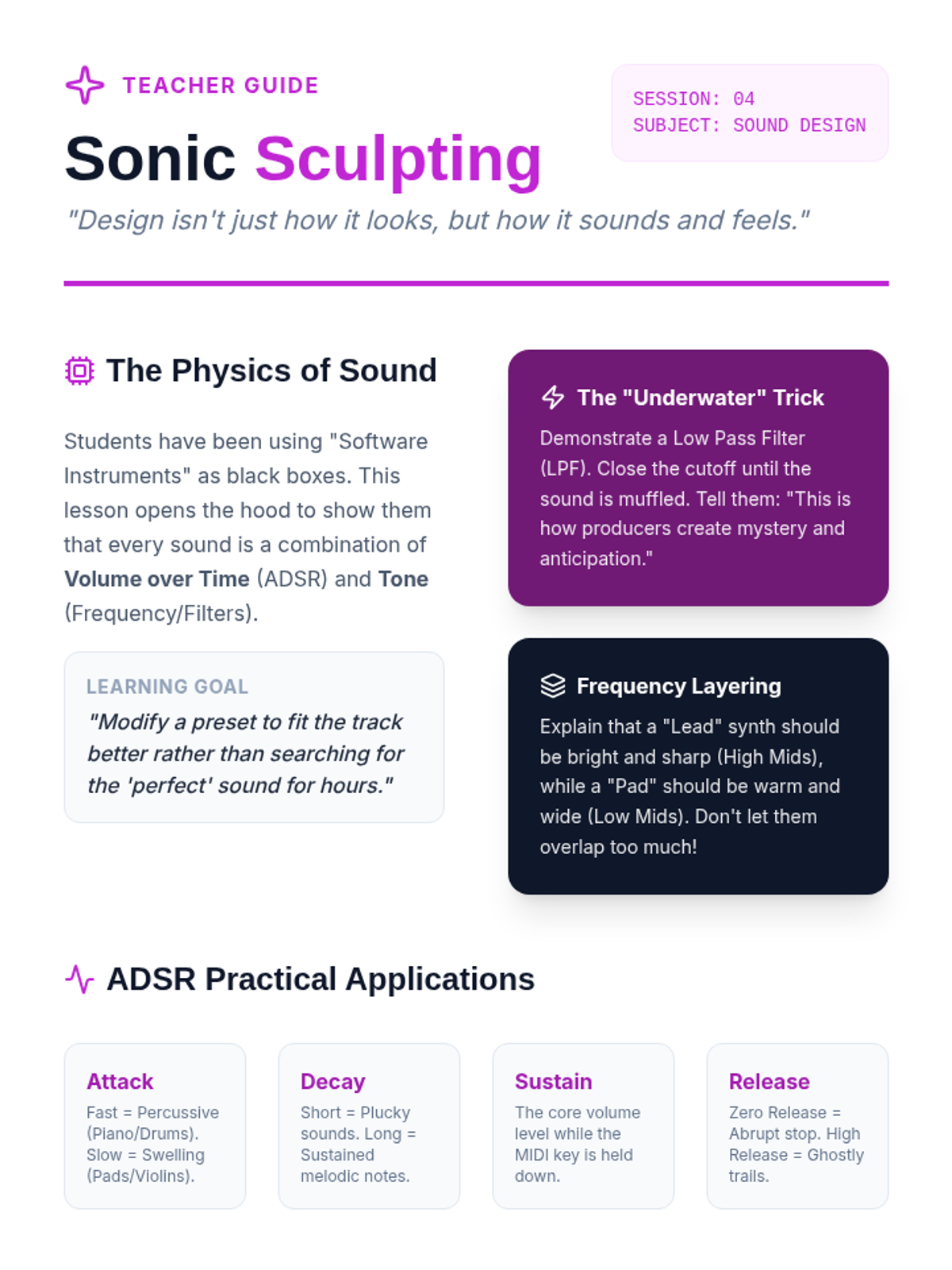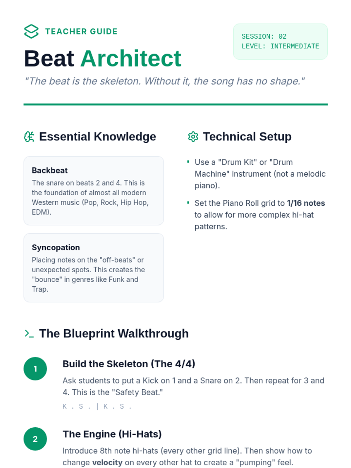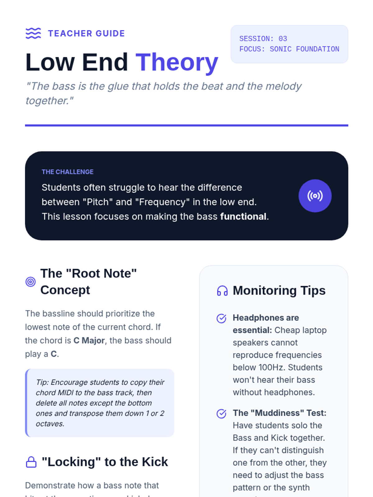 A comprehensive introduction to modern music production using Digital Audio Workstations (DAWs). Students progress from basic MIDI sequencing to advanced arrangement and sound design, culminating in a finished instrumental track.