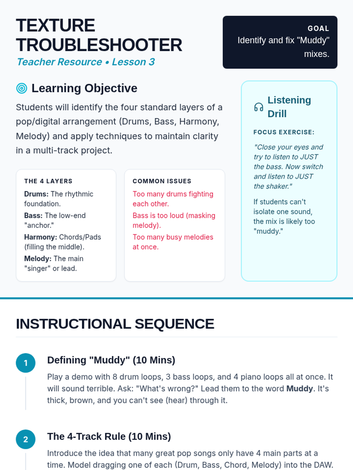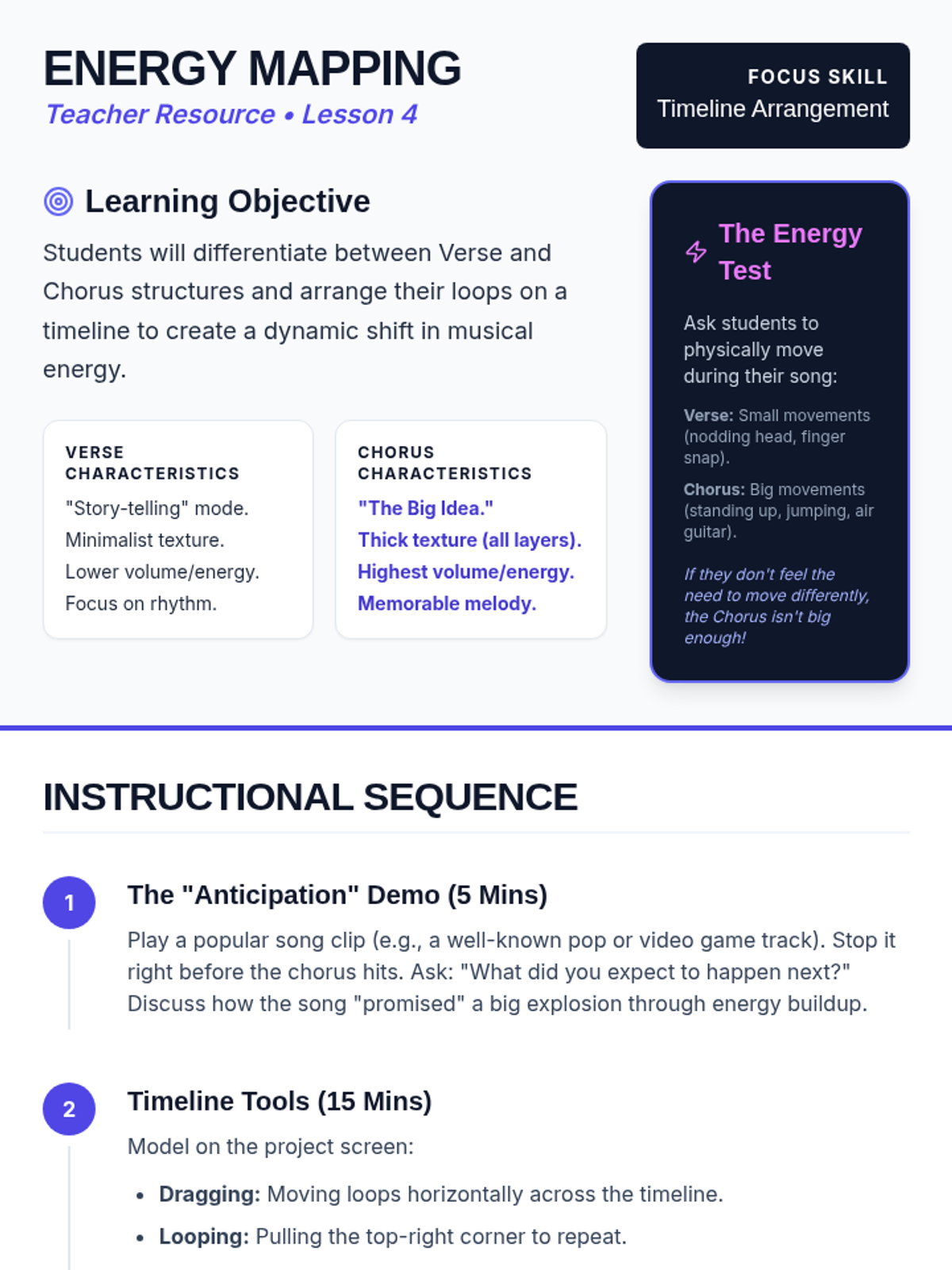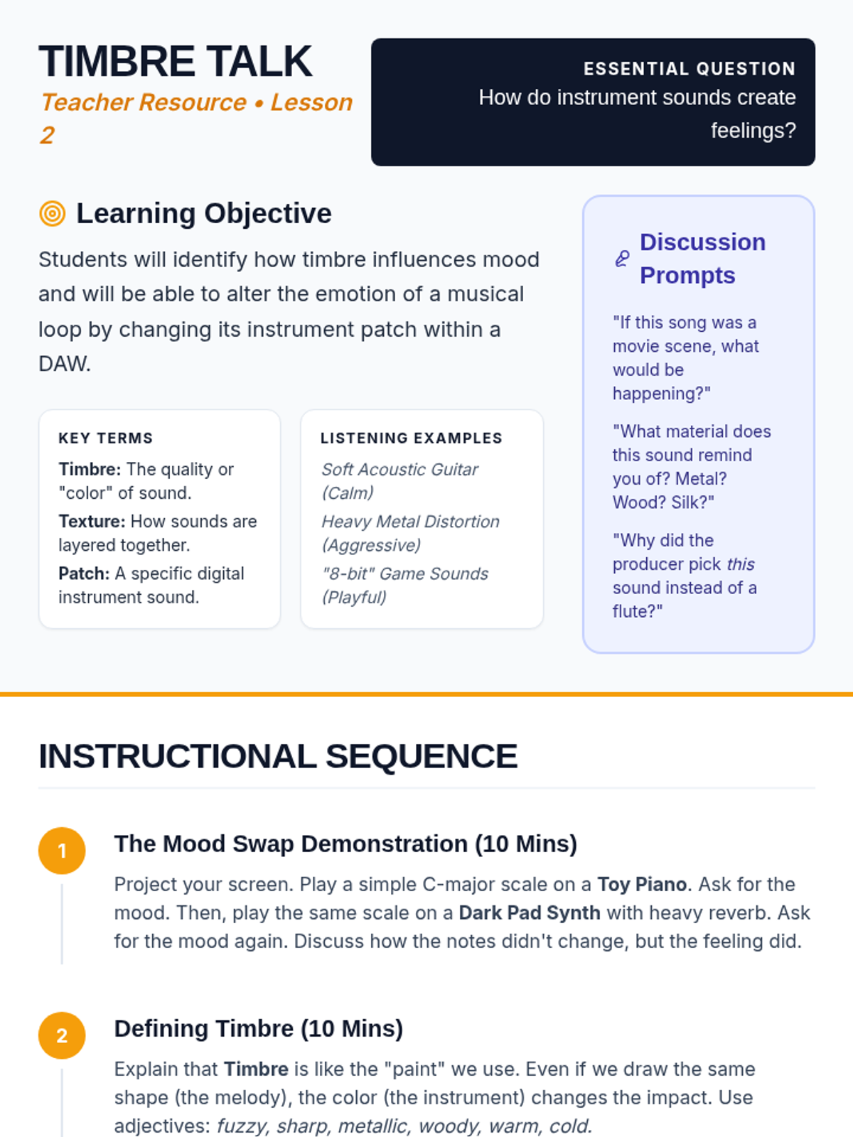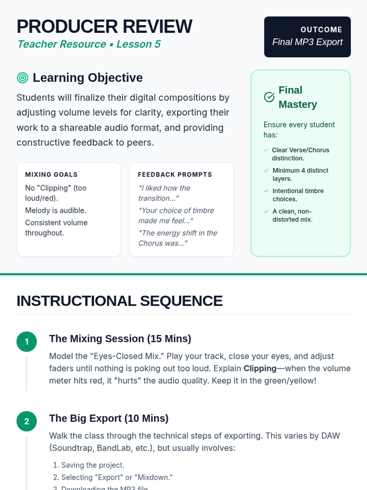 A 4th-grade music production unit where students use digital audio workstations (DAWs) to compose, arrange, and mix original music. Students learn about timbre, texture, song structure, and digital literacy through the lens of a modern music producer.