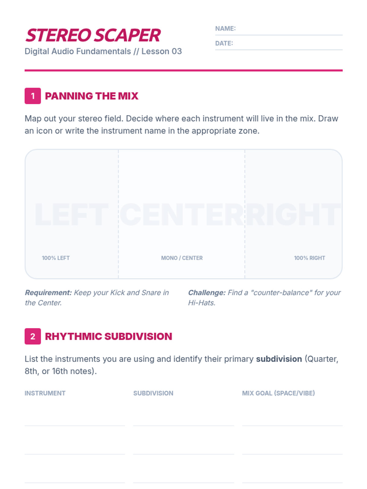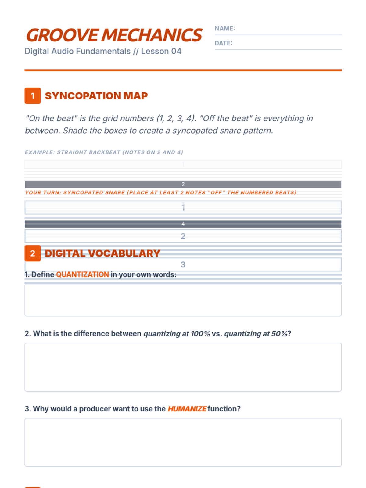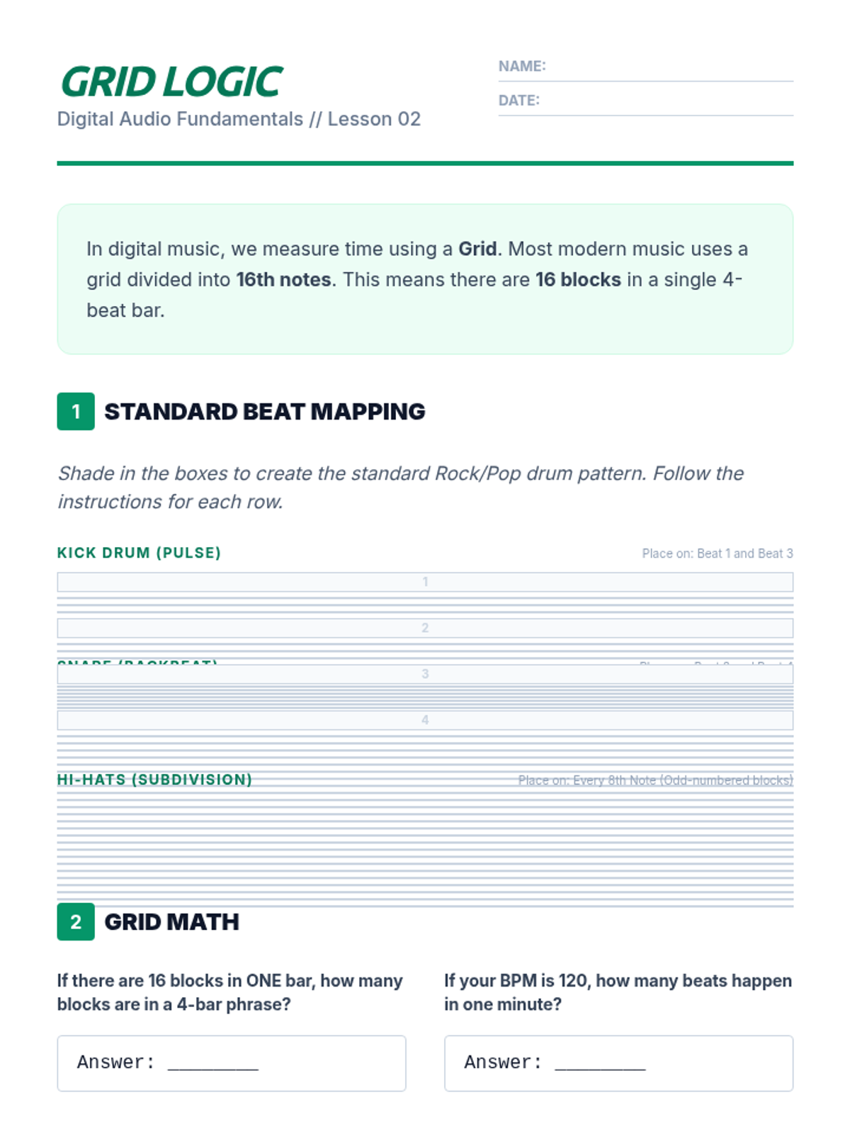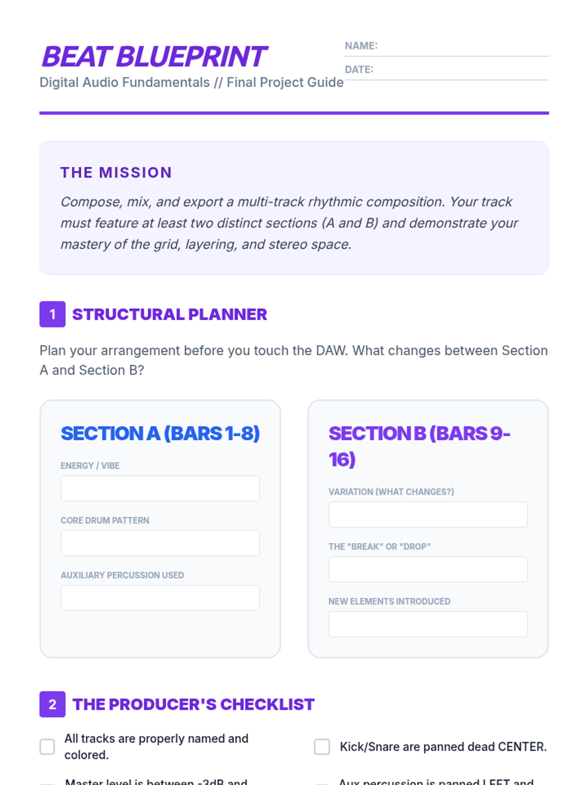 This sequence introduces students to digital music production, focusing on rhythmic construction within a Digital Audio Workstation (DAW). Students progress from basic interface navigation and loop sequencing to advanced techniques like syncopation, stereo panning, and arrangement, culminating in a polished multi-track drum composition.