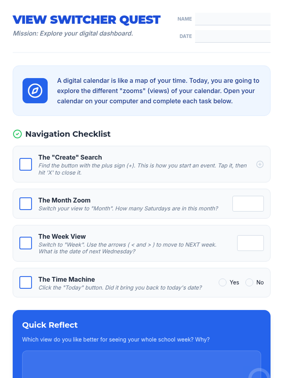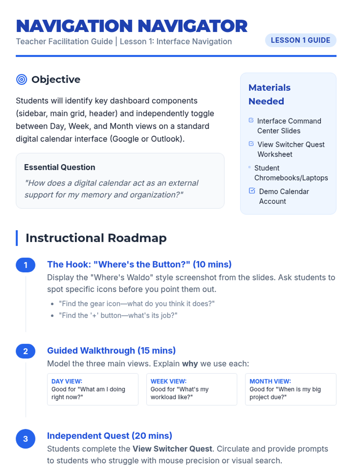 A comprehensive sequence for 9th-grade Special Education students to master the fundamental mechanics of digital calendar platforms, from navigation to real-world schedule input.