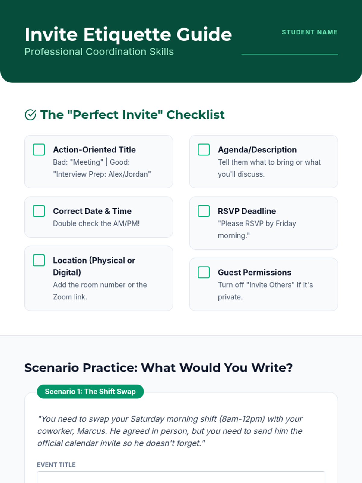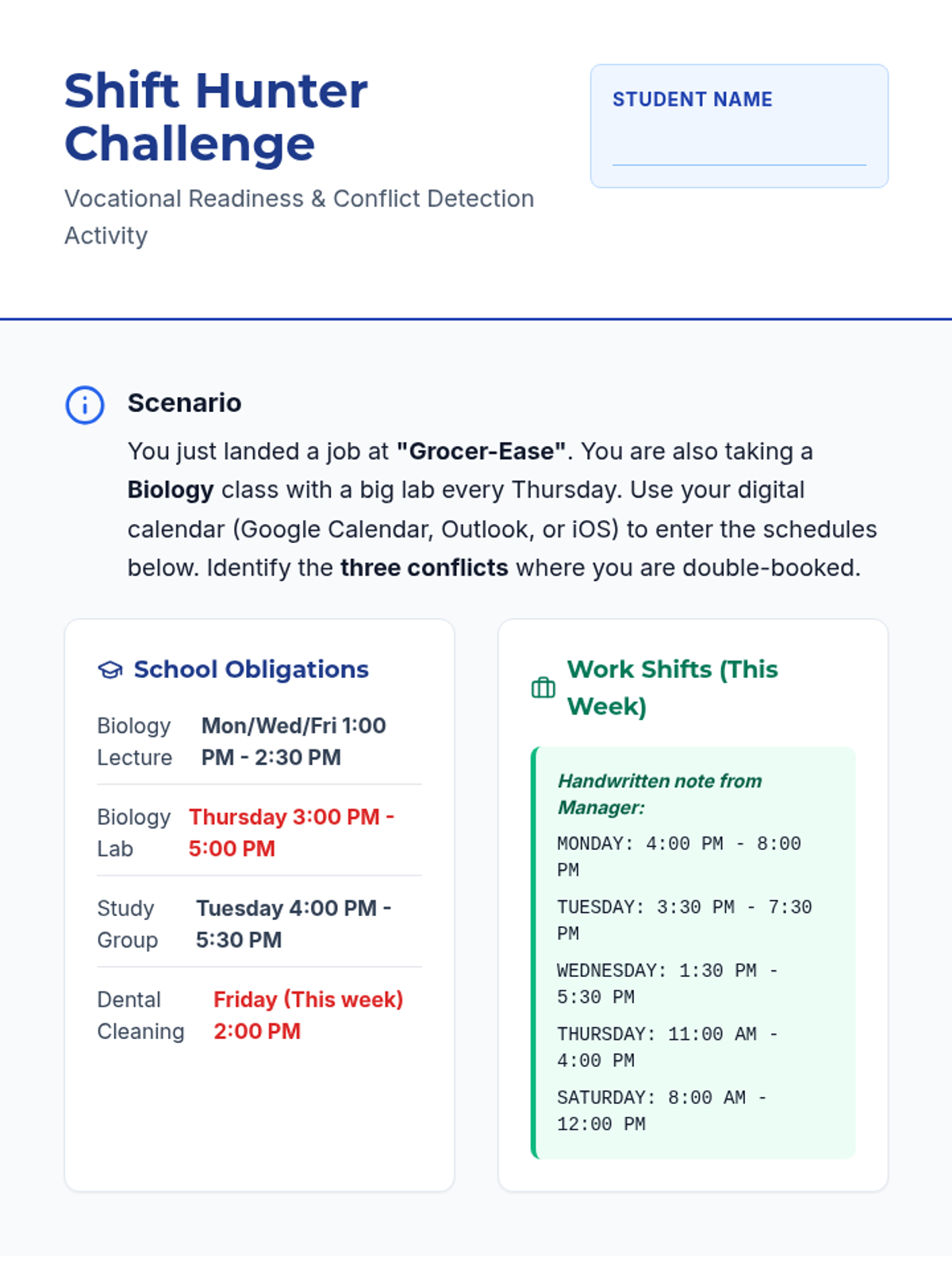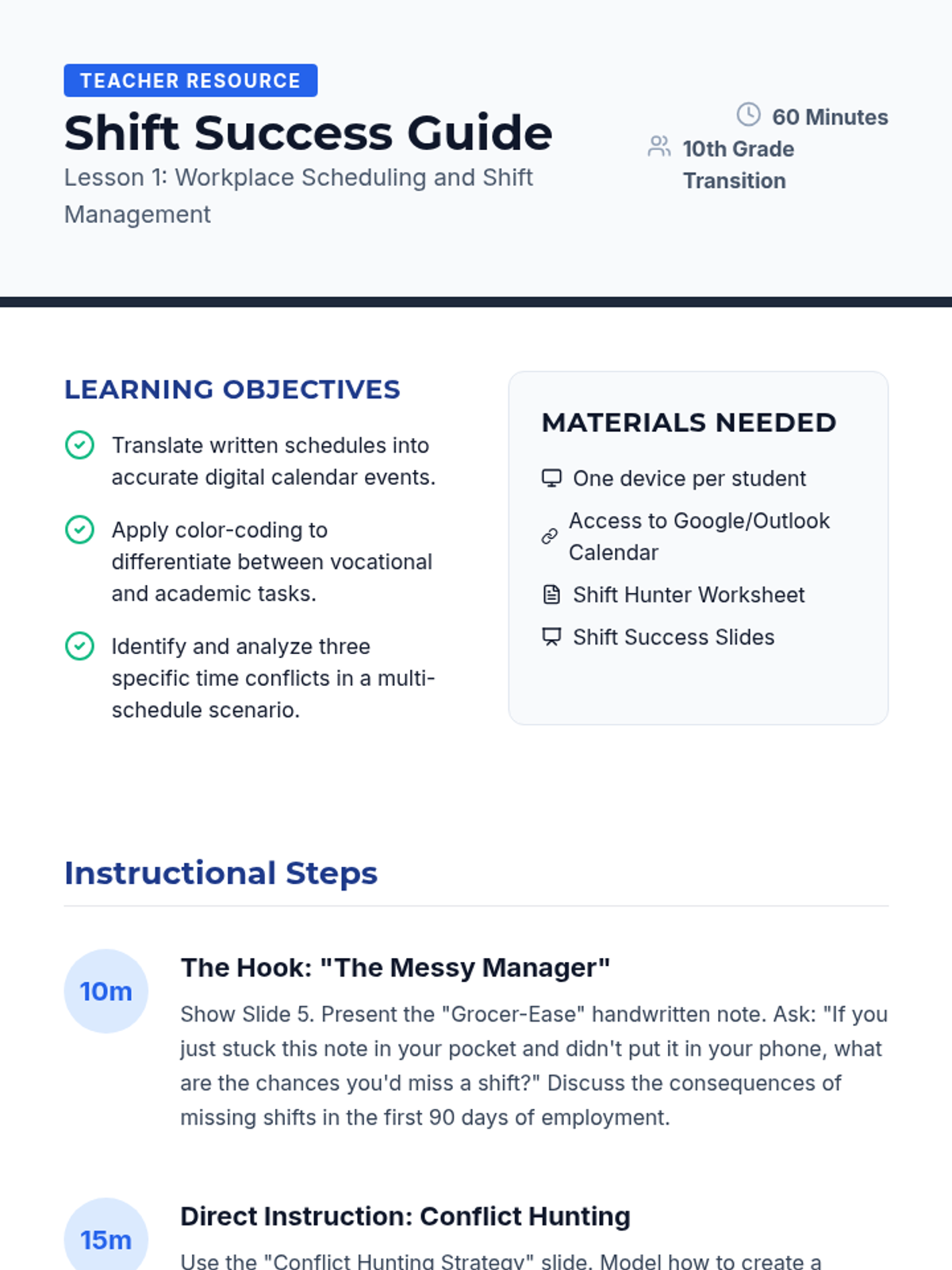 A 10th-grade sequence focused on transitioning from personal calendar management to professional and social coordination. Students learn to navigate work shifts, digital etiquette for invites, privacy settings, and conflict resolution to build independence for life after high school.
