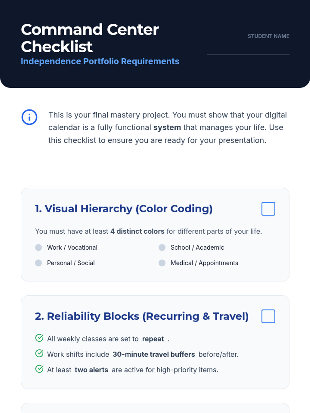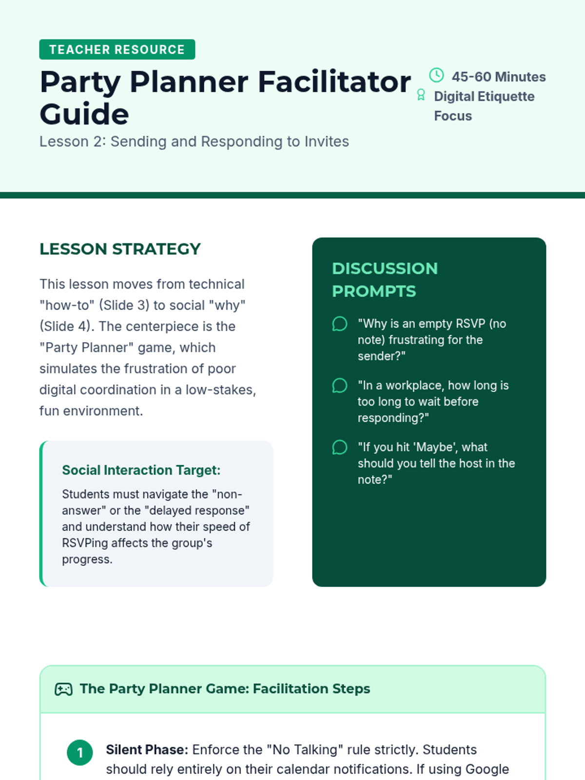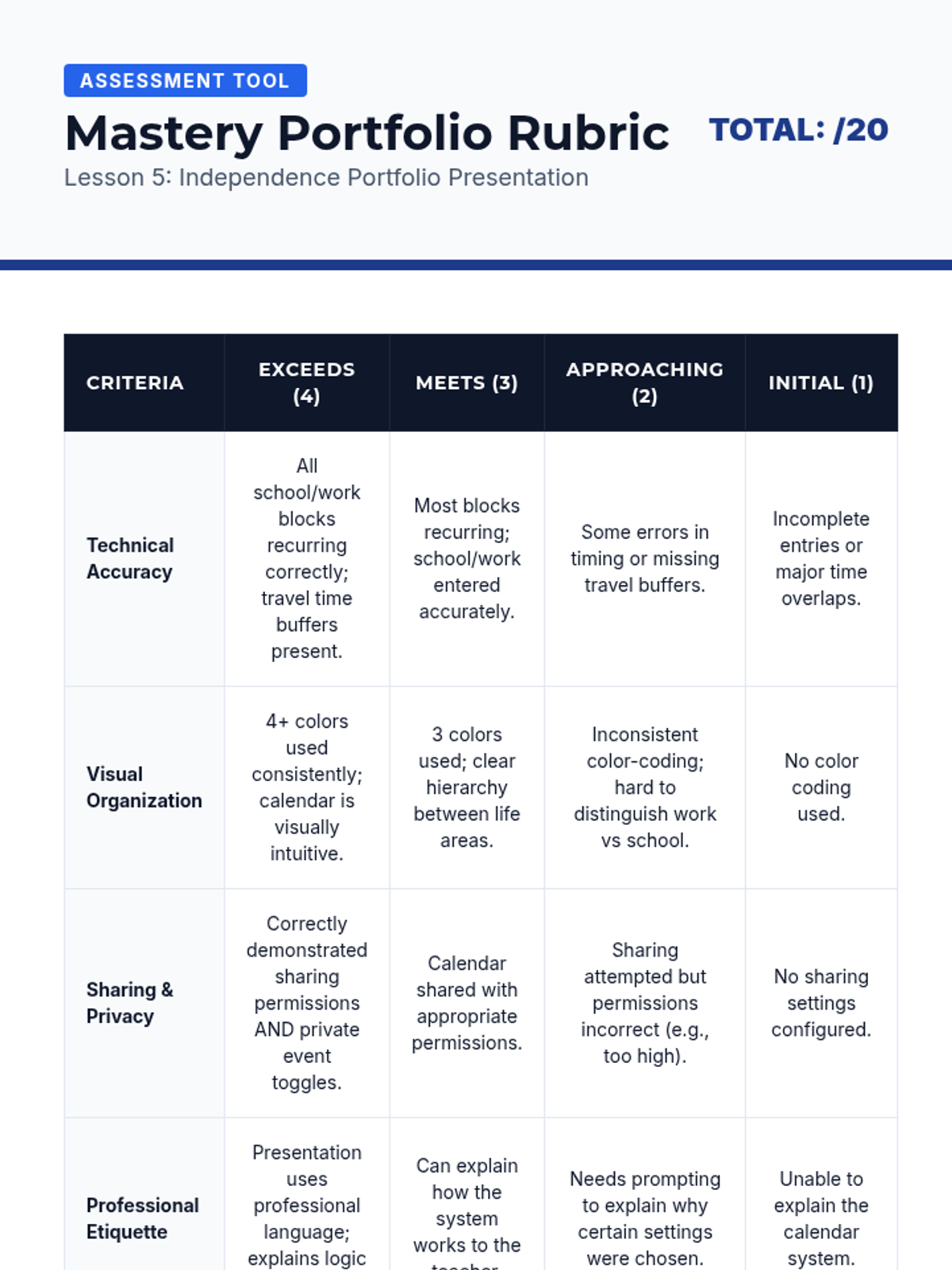 A 10th-grade sequence focused on transitioning from personal calendar management to professional and social coordination. Students learn to navigate work shifts, digital etiquette for invites, privacy settings, and conflict resolution to build independence for life after high school.