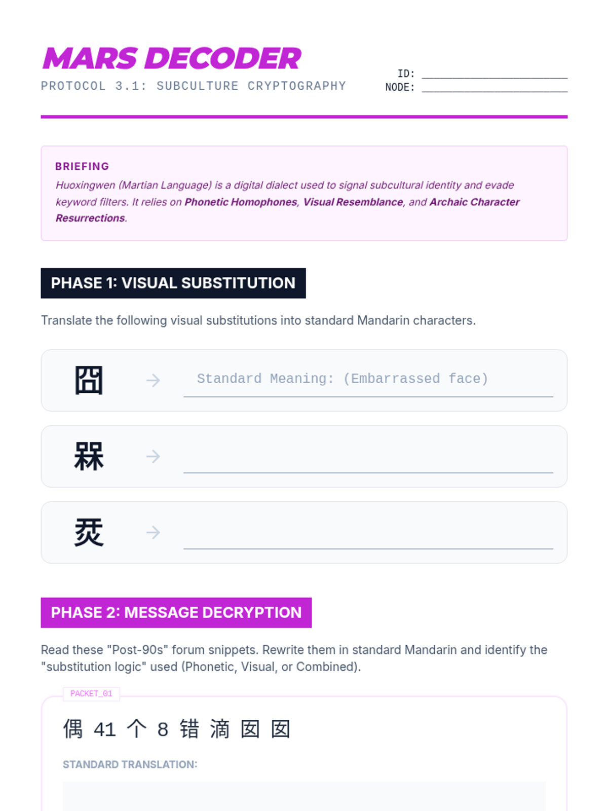 This sequence explores how digital media reshapes the usage, memory, and form of Chinese characters, covering character amnesia, internet slang, and linguistic resistance. It is designed for undergraduate students of advanced Mandarin.