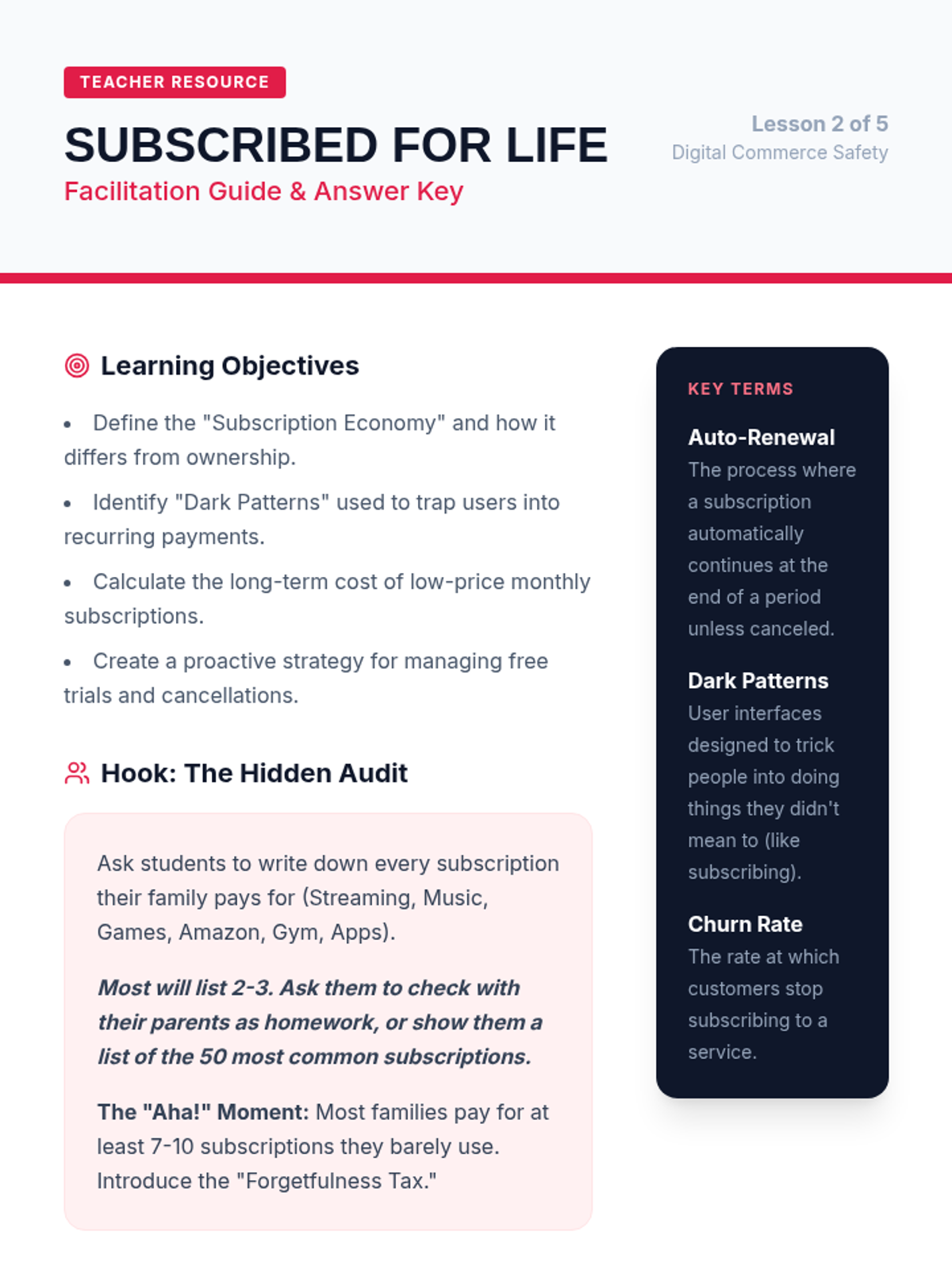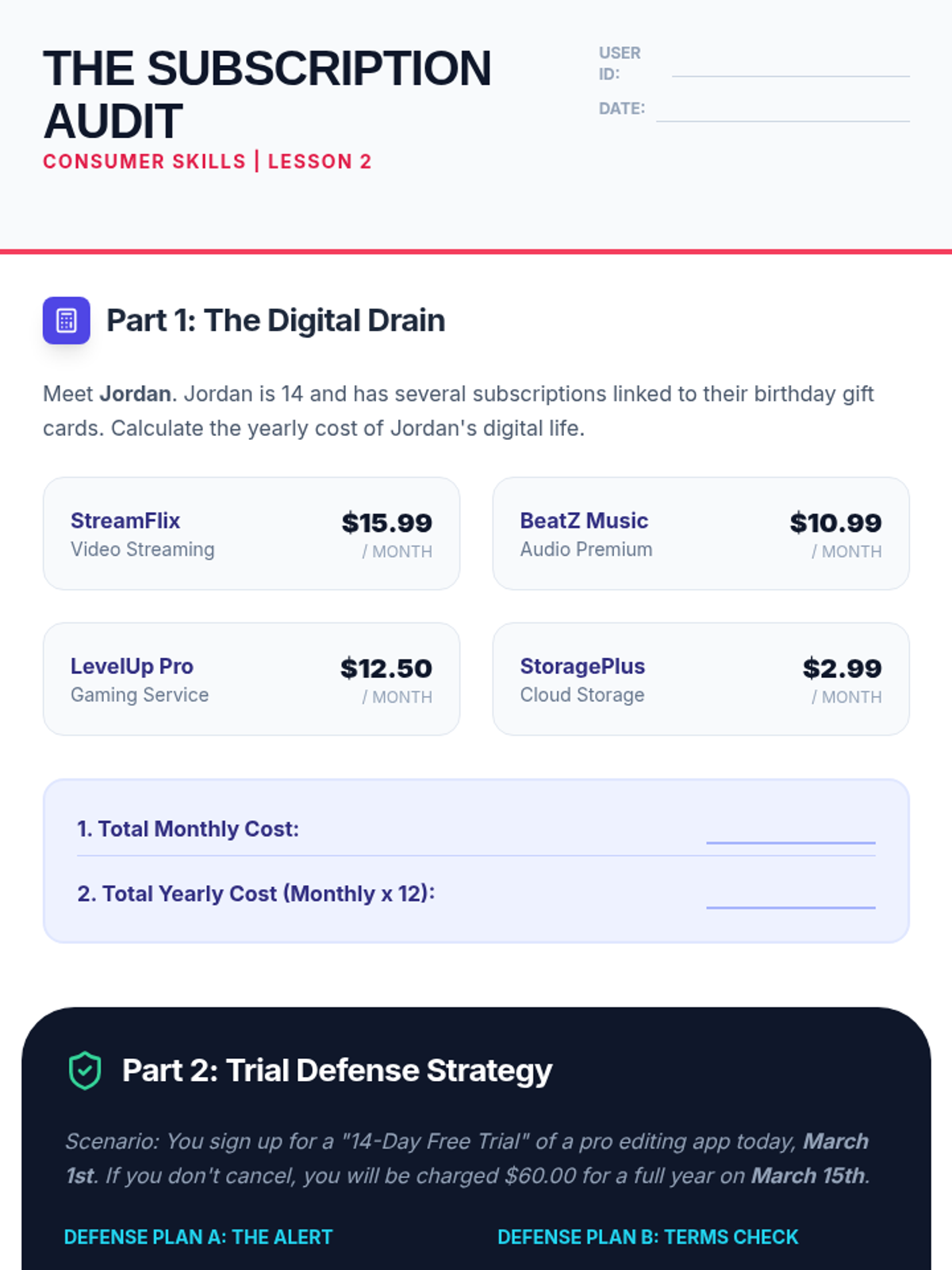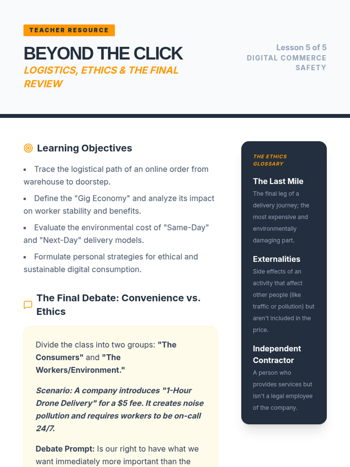 A comprehensive sequence for 8th-grade students on navigating the digital marketplace. It covers in-app purchases, subscription traps, digital payment security, terms of service agreements, and the ethical implications of the gig economy.