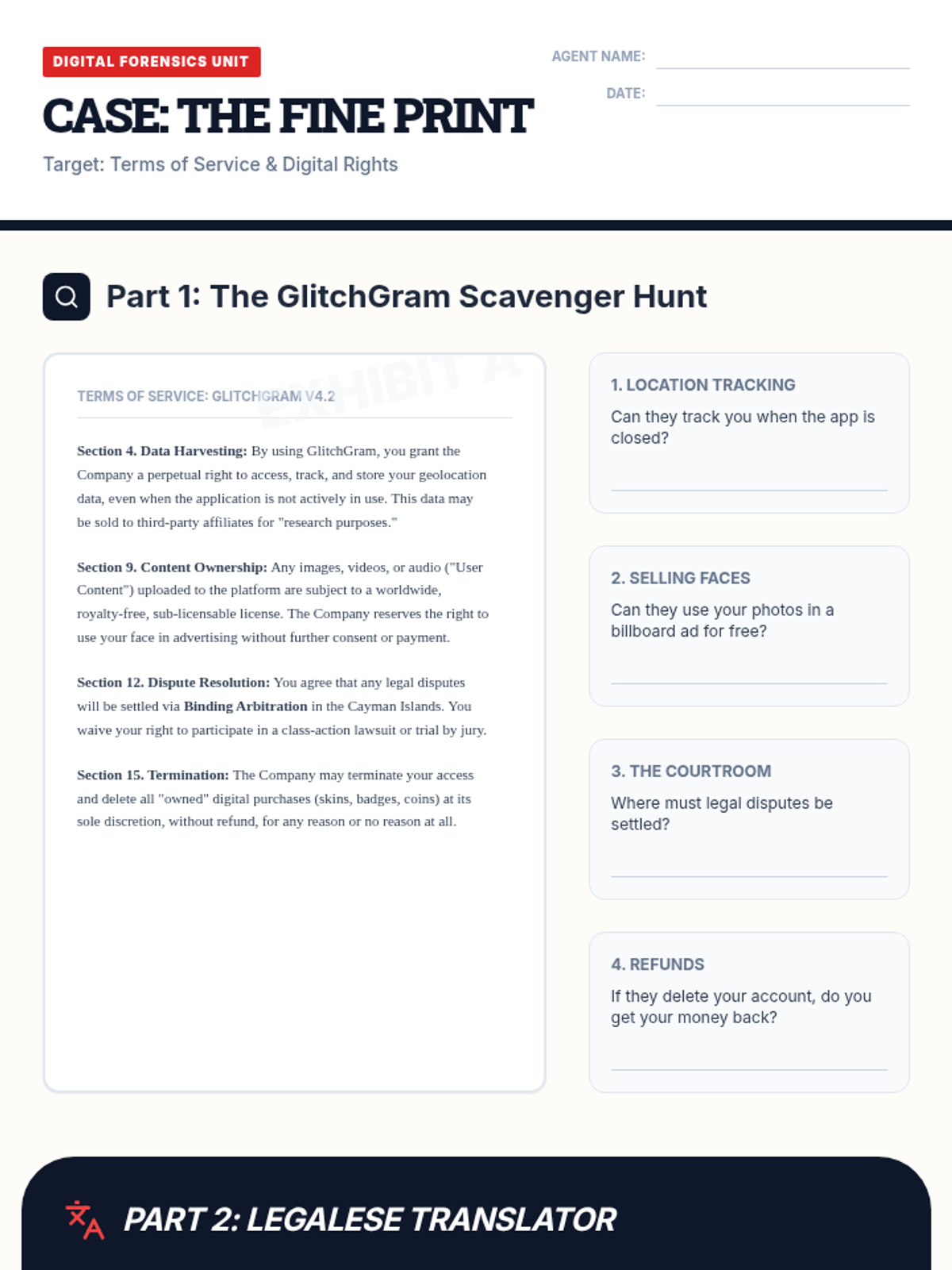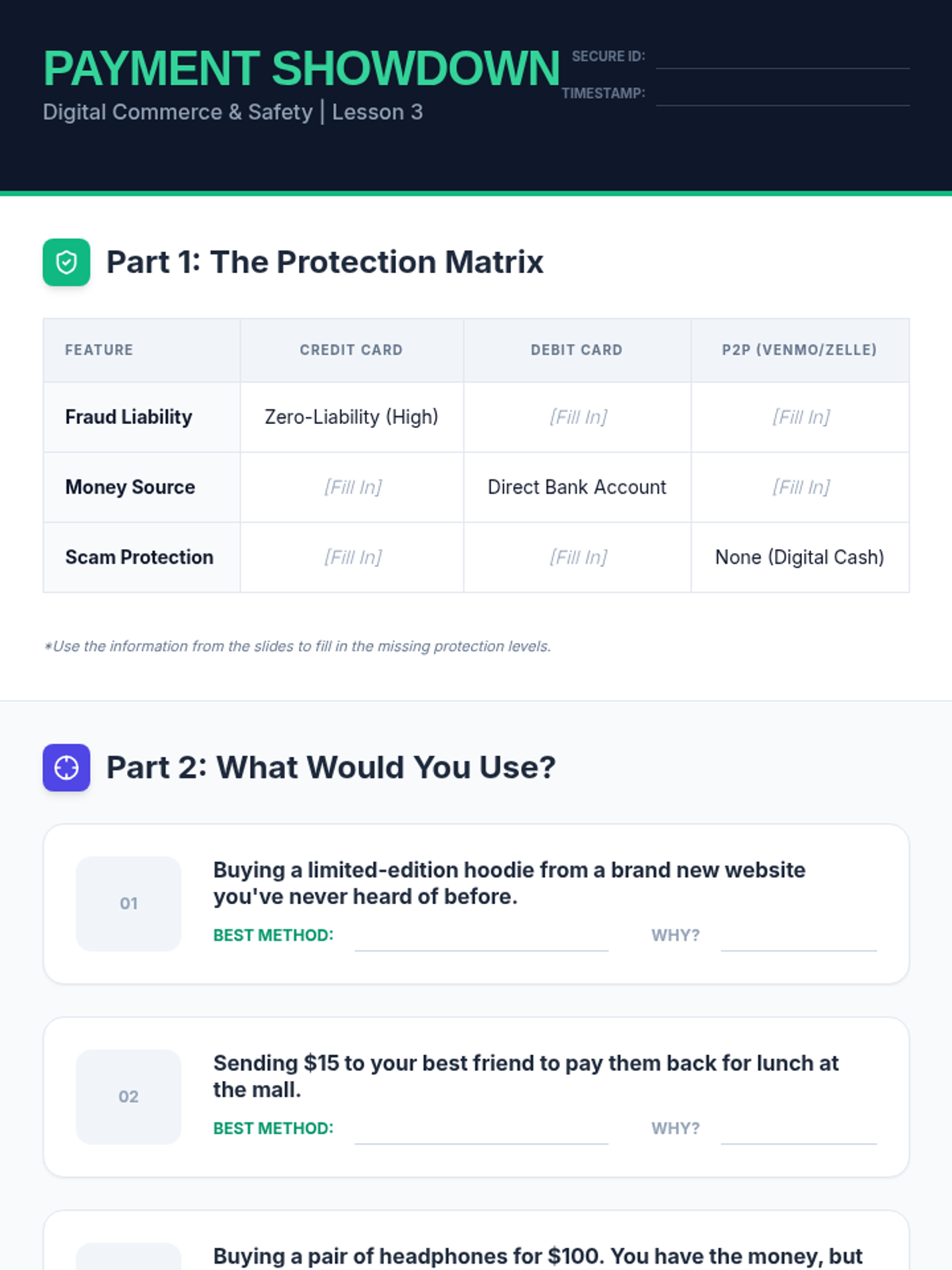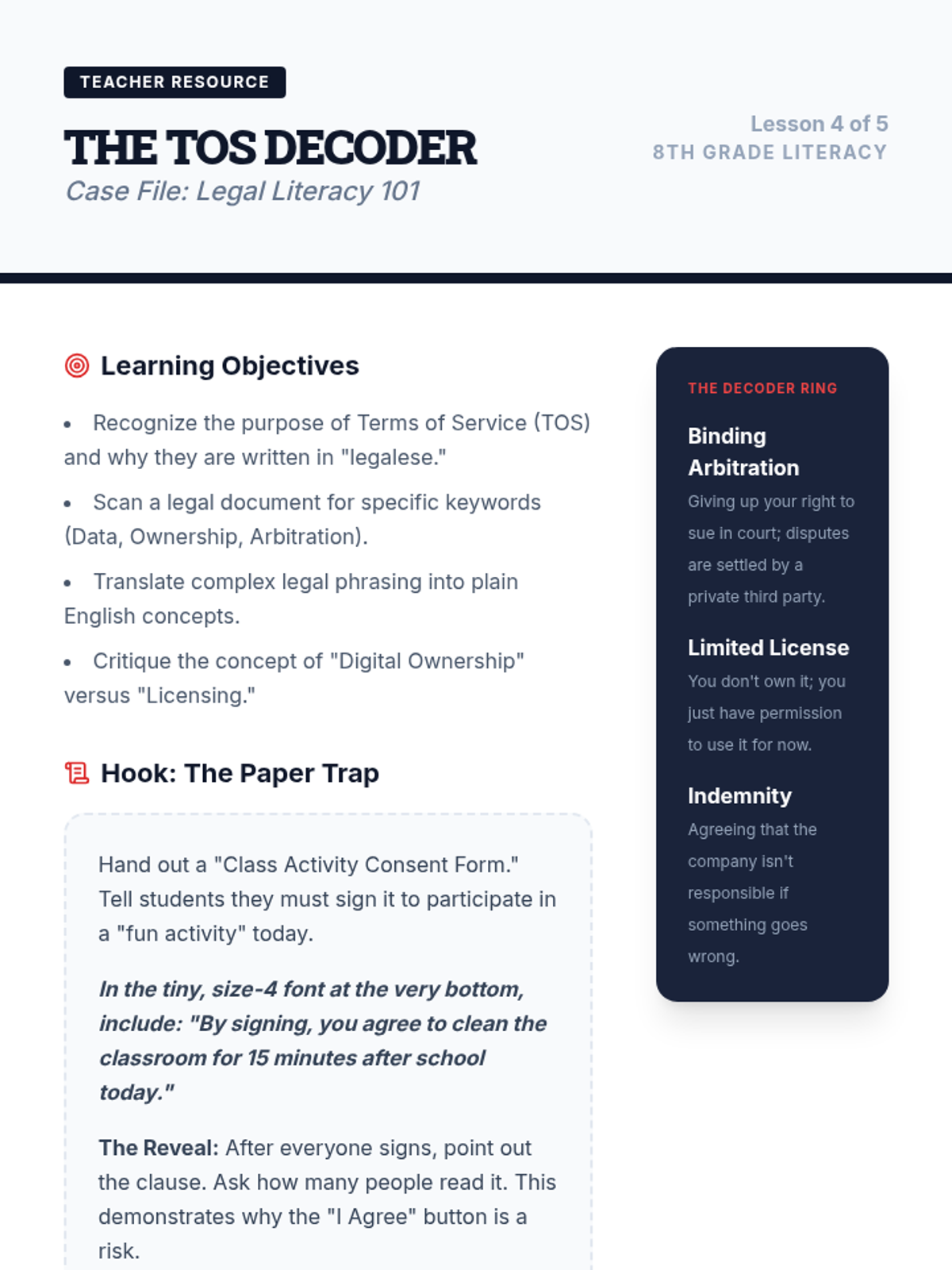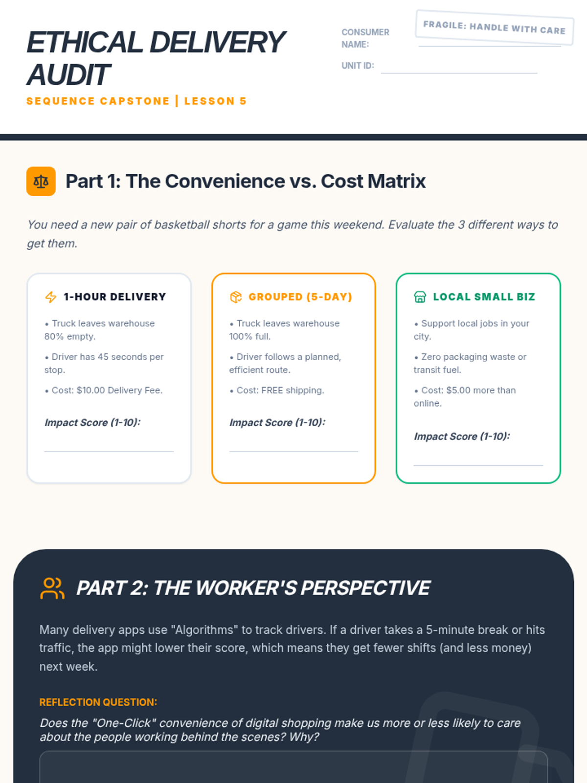 A comprehensive sequence for 8th-grade students on navigating the digital marketplace. It covers in-app purchases, subscription traps, digital payment security, terms of service agreements, and the ethical implications of the gig economy.