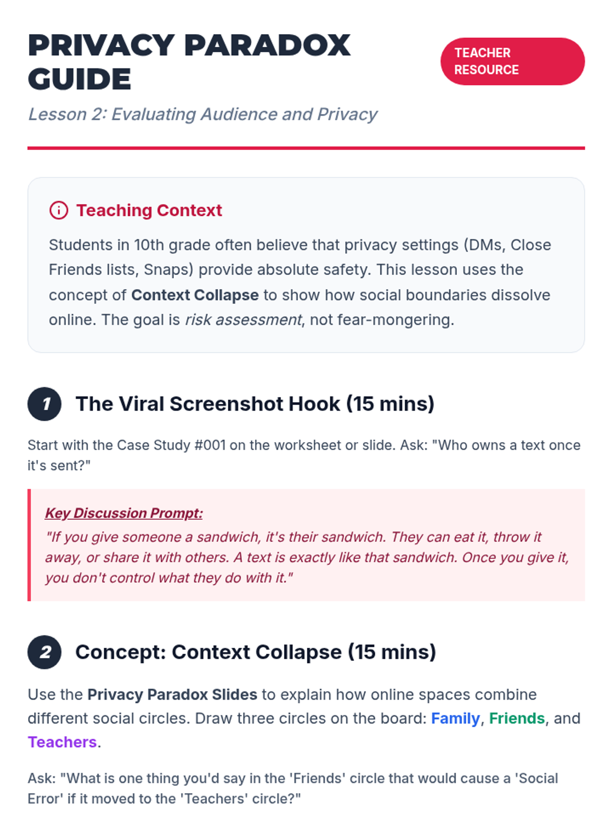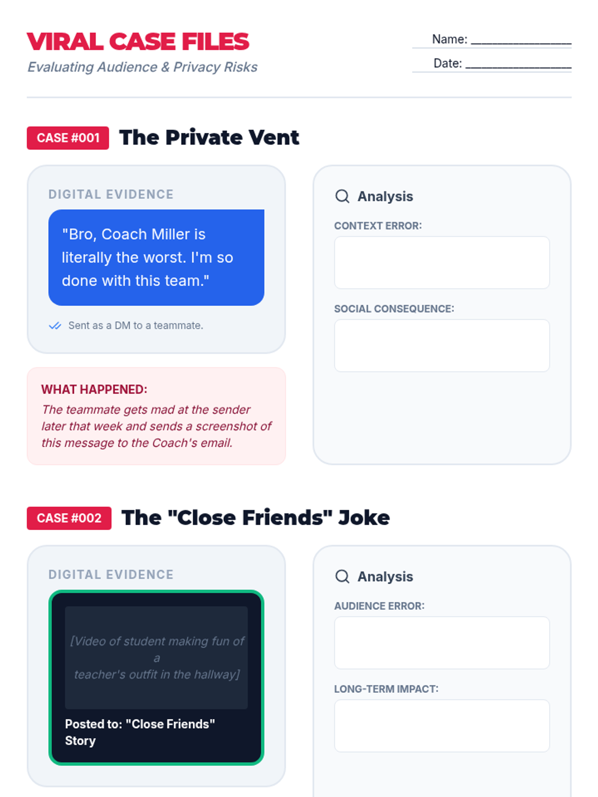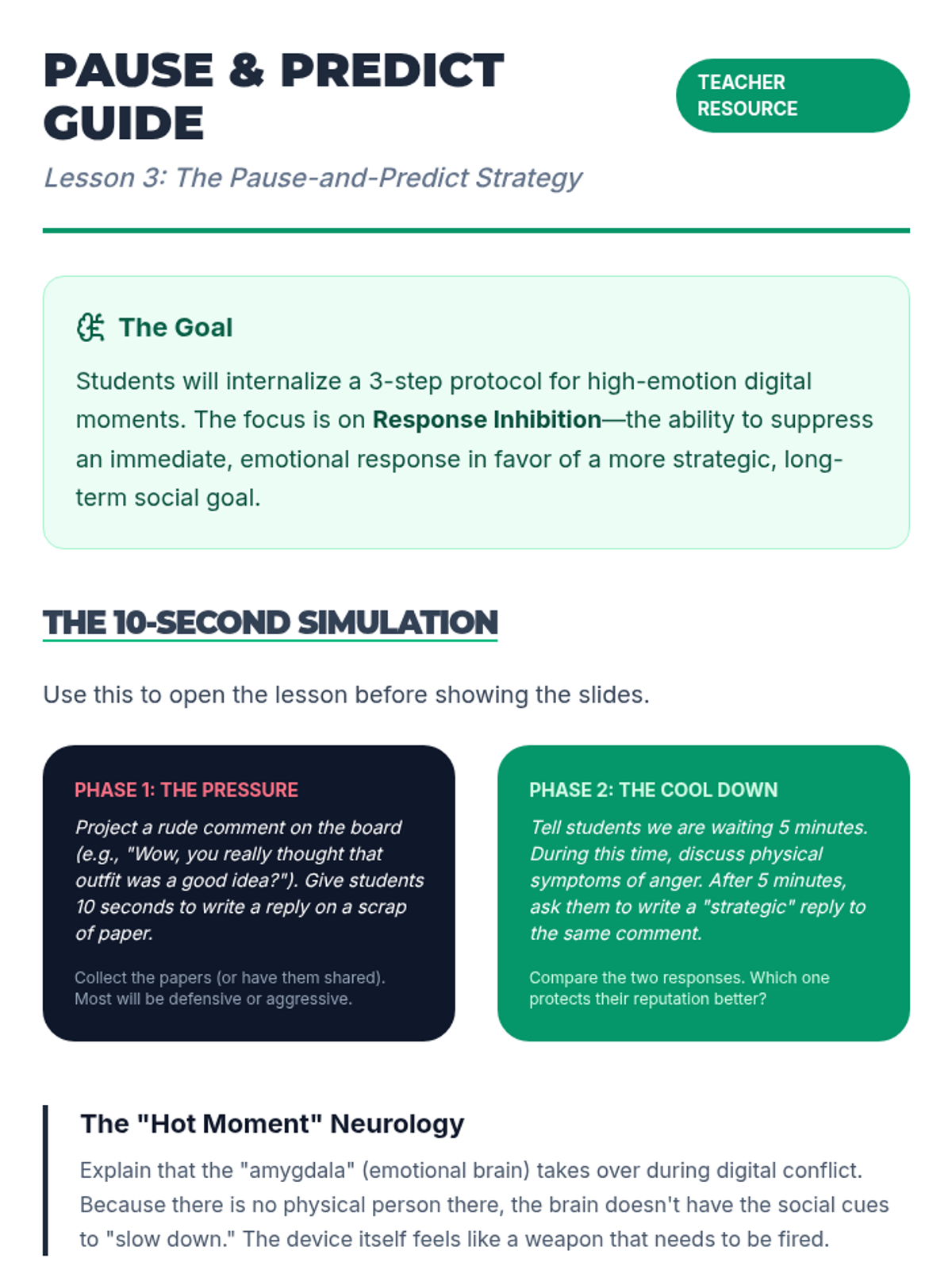 A 10th-grade Special Education sequence focused on evaluating social decisions in digital spaces. Students learn to decode tone without non-verbals, assess privacy risks, manage digital impulses, resolve online conflicts, and build a personal code of digital conduct.