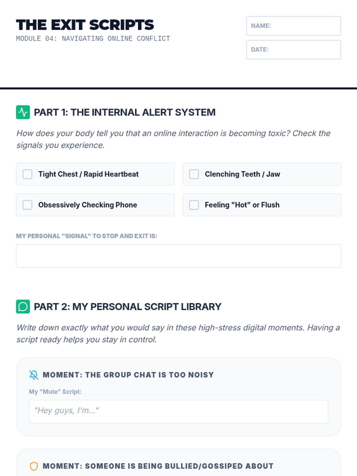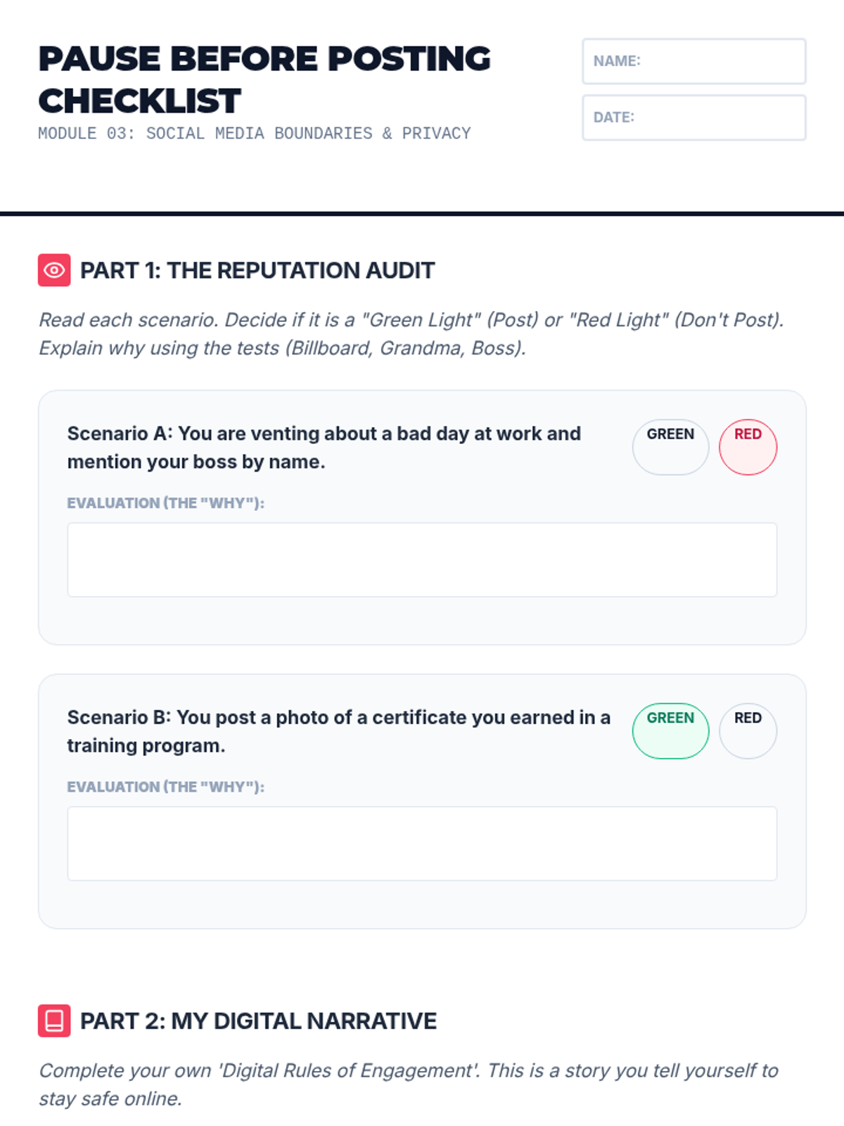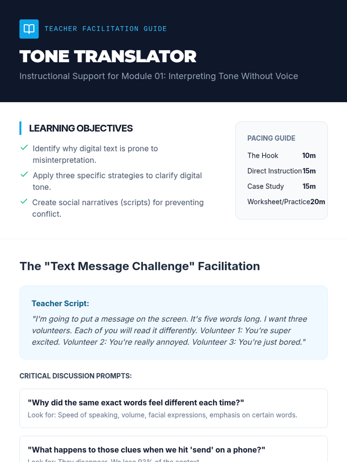 A comprehensive sequence for 12th-grade students focusing on the intersection of social narratives and digital communication. Students learn to navigate tone, professionalism, privacy, conflict, and safety in digital spaces through the creation of personalized scripts and 'Digital Rules of Engagement.'