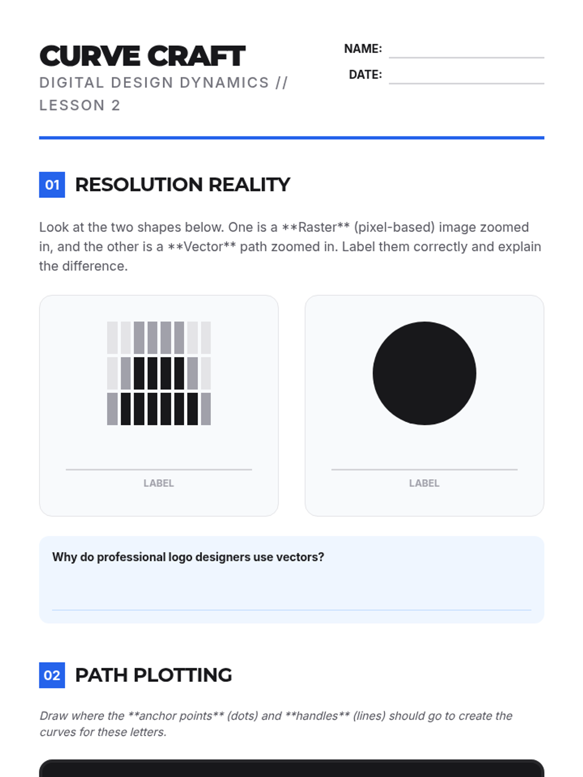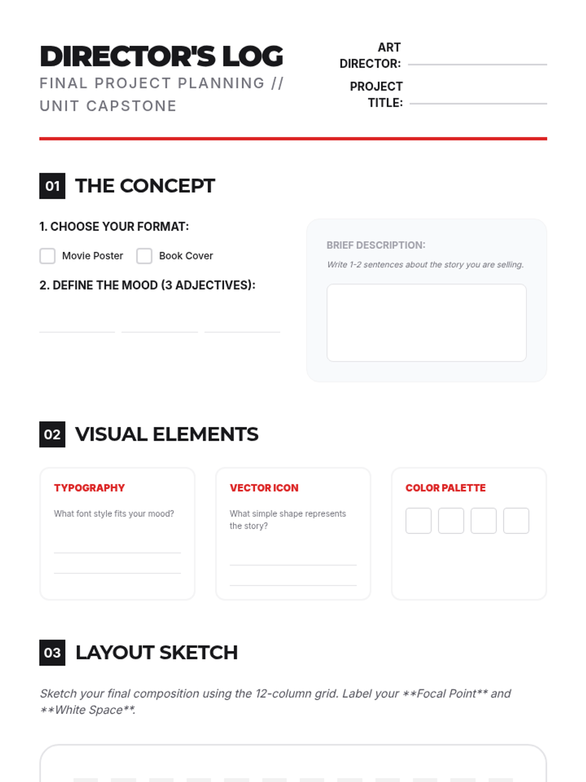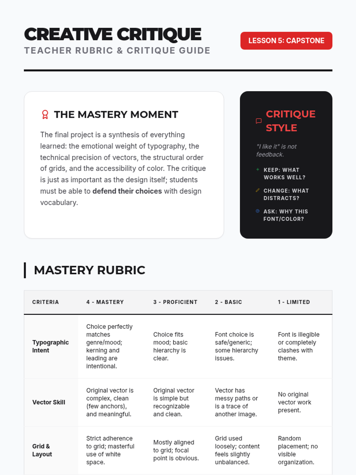 A comprehensive 8th-grade unit bridging traditional printmaking concepts with modern digital graphic design. Students explore typography anatomy, vector illustration, grid-based layouts, and digital color theory to create professional-quality visual communications.