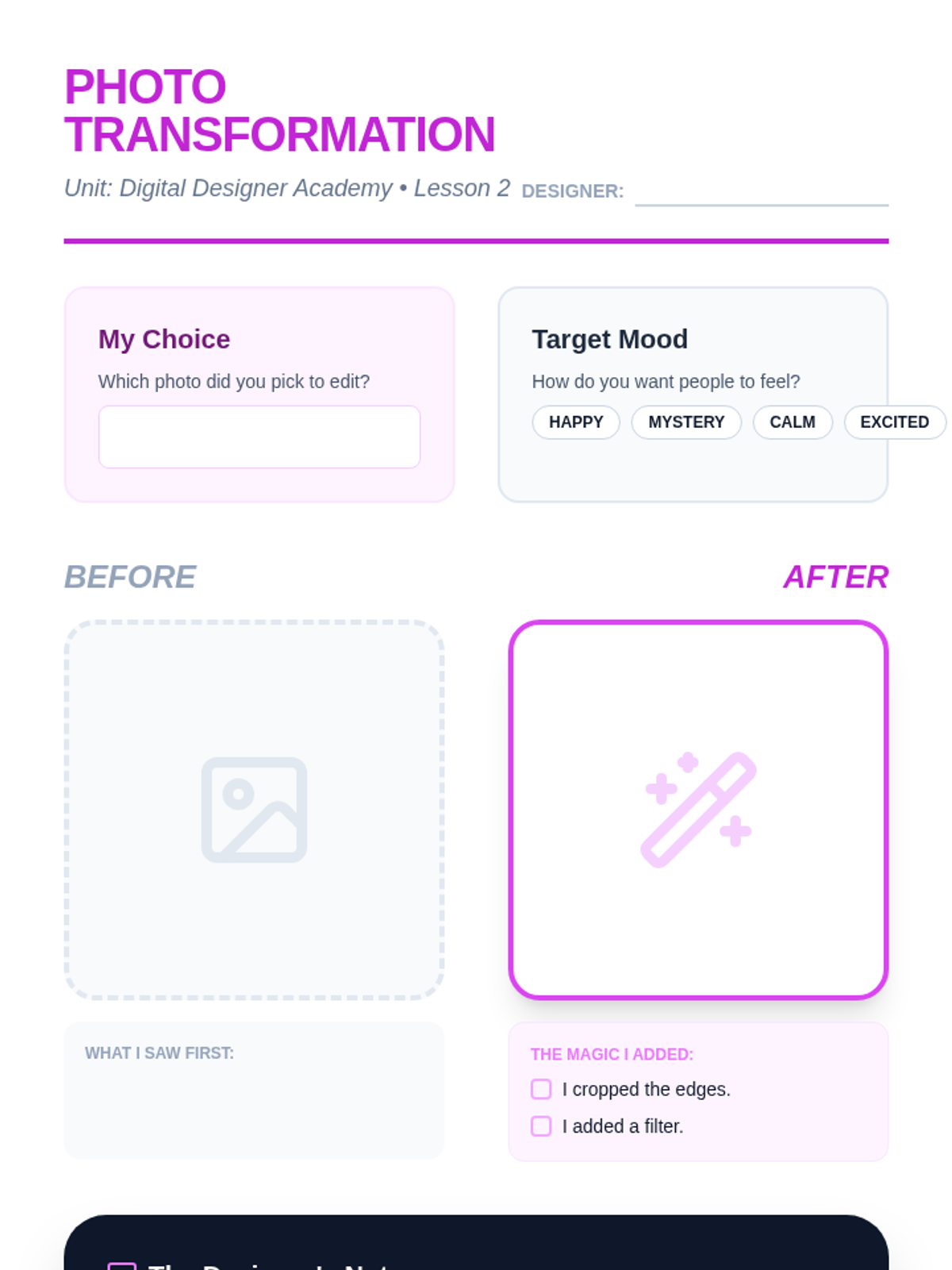 This 2nd-grade sequence introduces students to the fundamentals of digital photography and user interface design. Students progress from capturing and editing clear images to understanding and designing the icons and layouts that make digital apps functional and visually appealing.