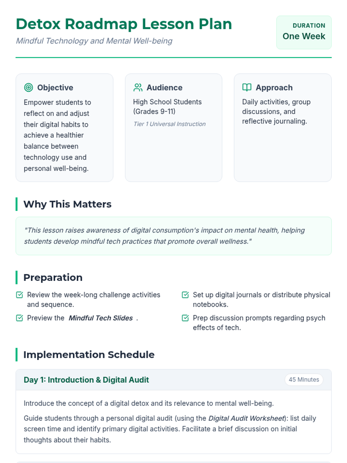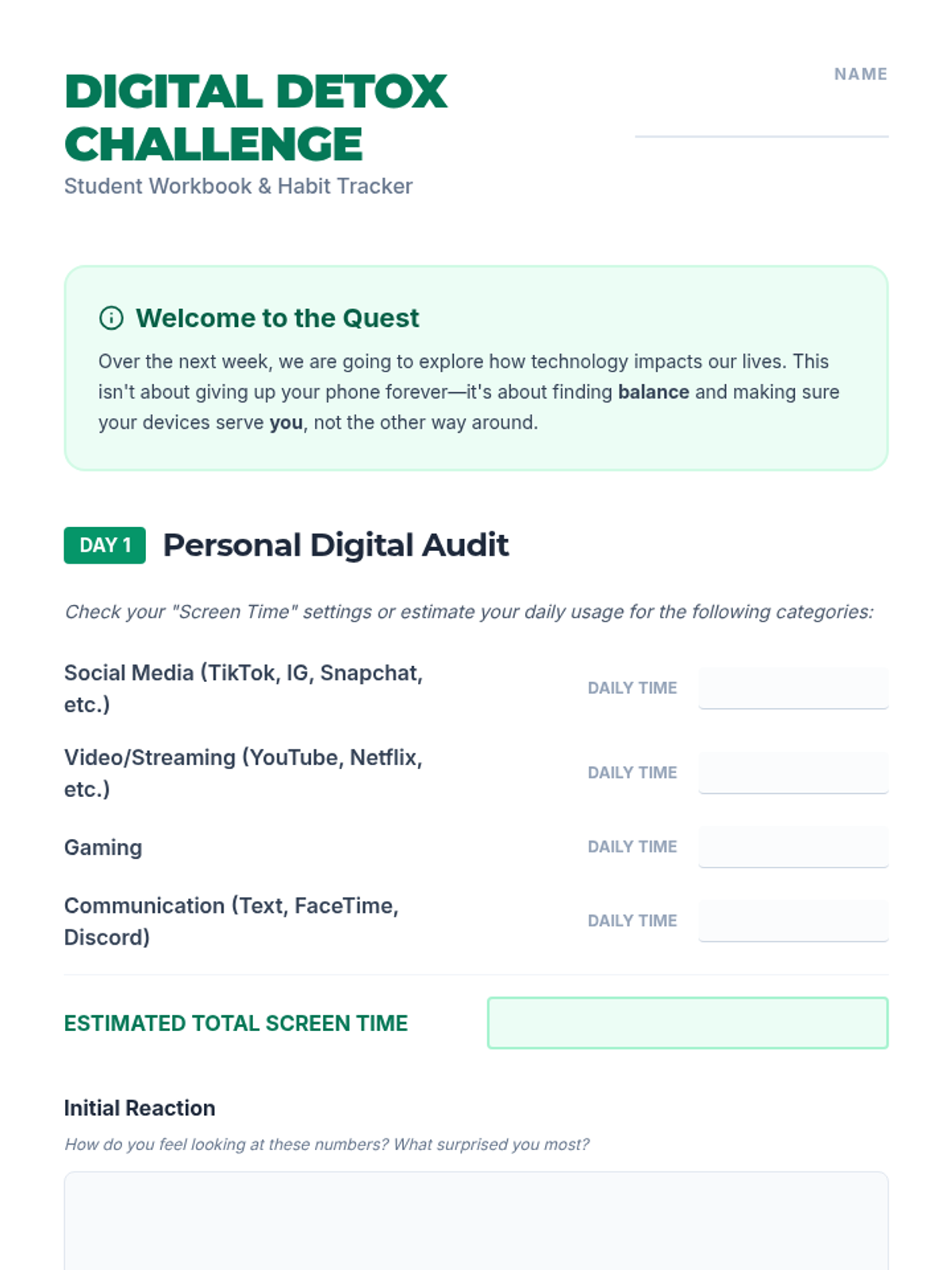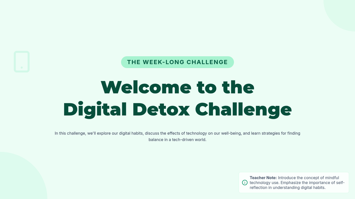 A transformative journey for students to reclaim their time and attention from digital distractions through a structured detox challenge and habit-building exercises.