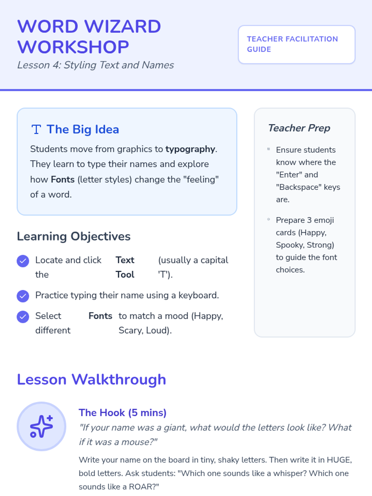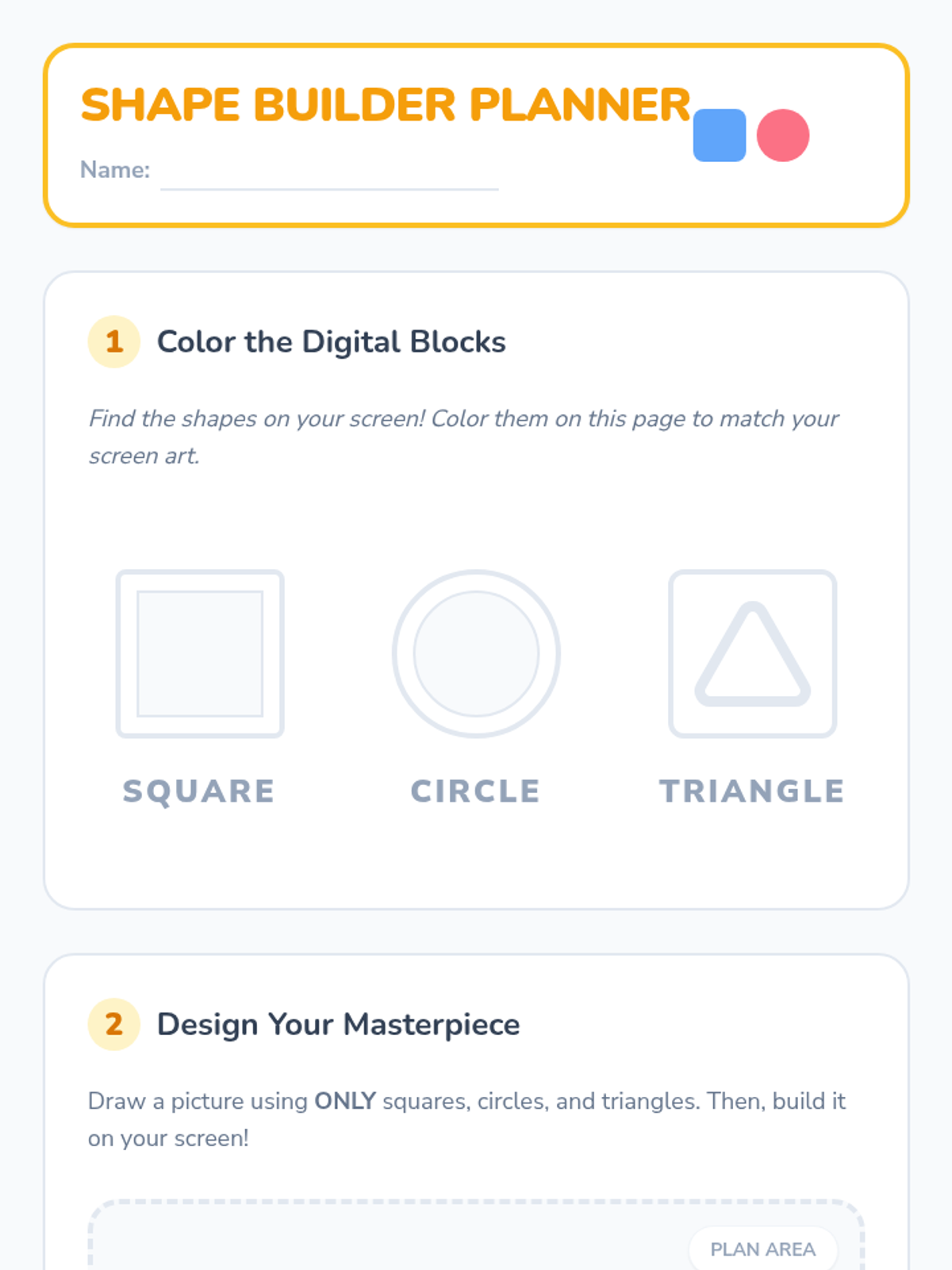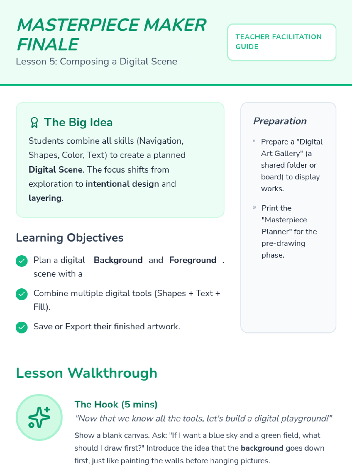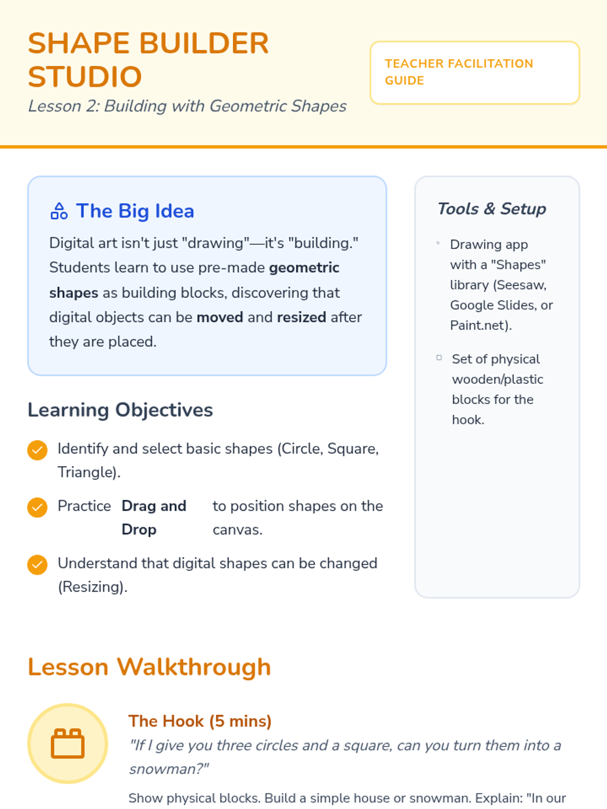 A foundational sequence for Kindergarteners to explore digital design, moving from basic tool navigation and shape manipulation to intentional composition and typography using digital media.