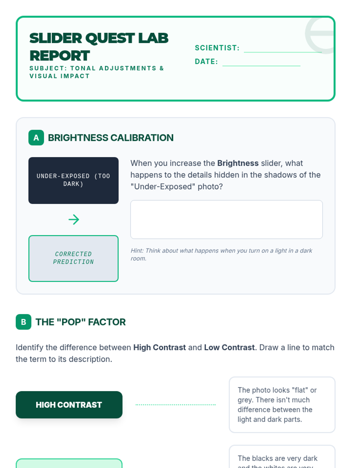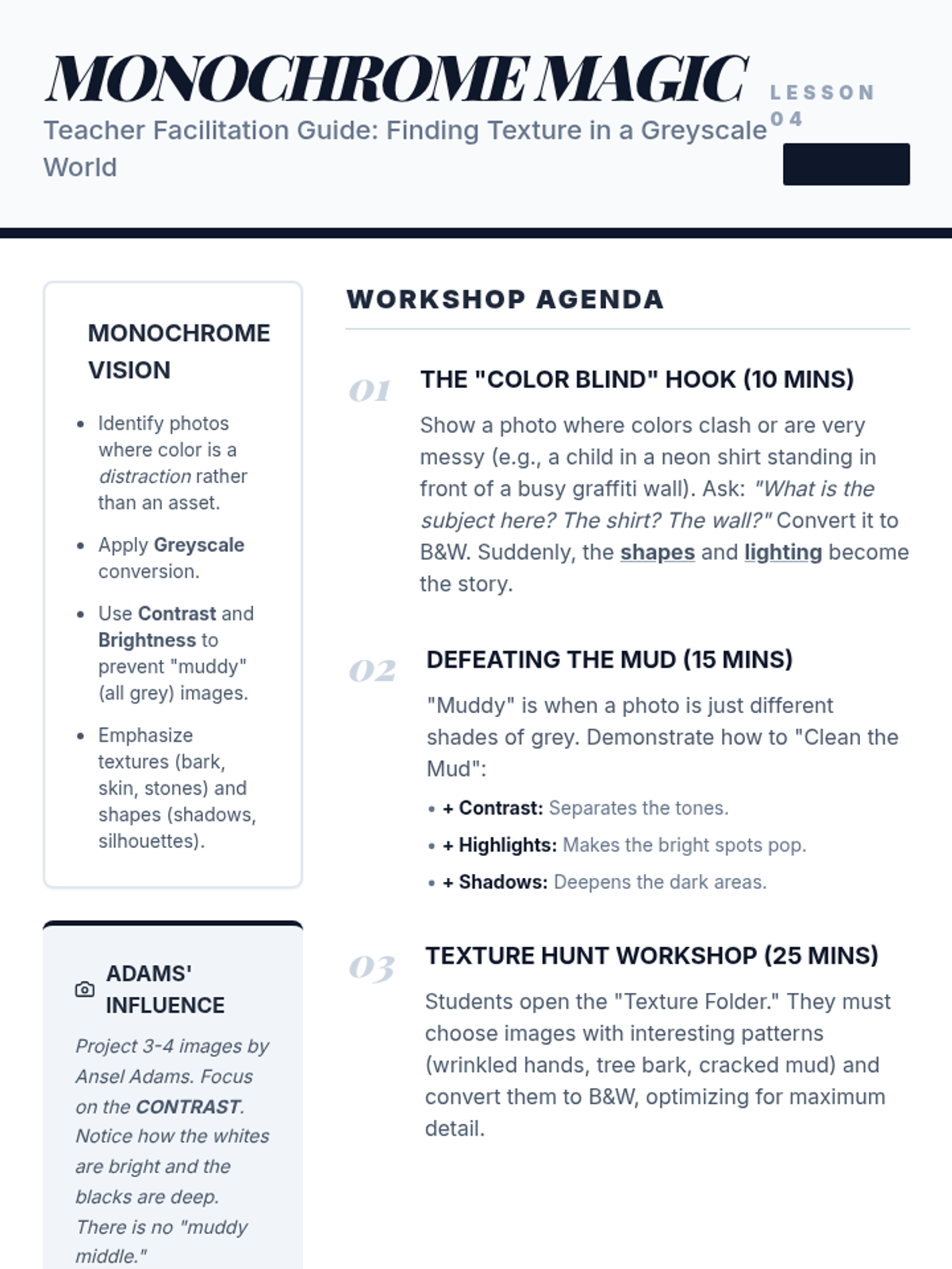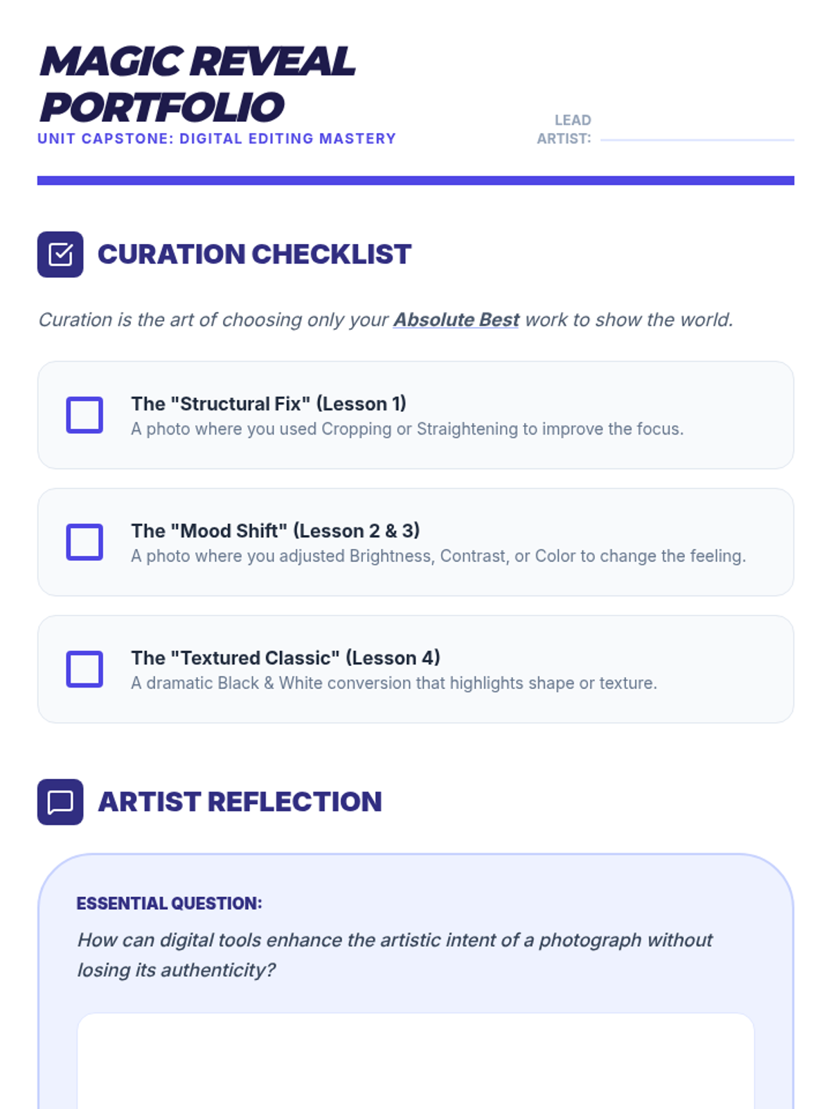 A technical photography sequence for 4th graders exploring the 'digital darkroom.' Students learn to use non-destructive editing tools like cropping, tonal adjustments, and color correction to enhance their artistic intent while maintaining authenticity.