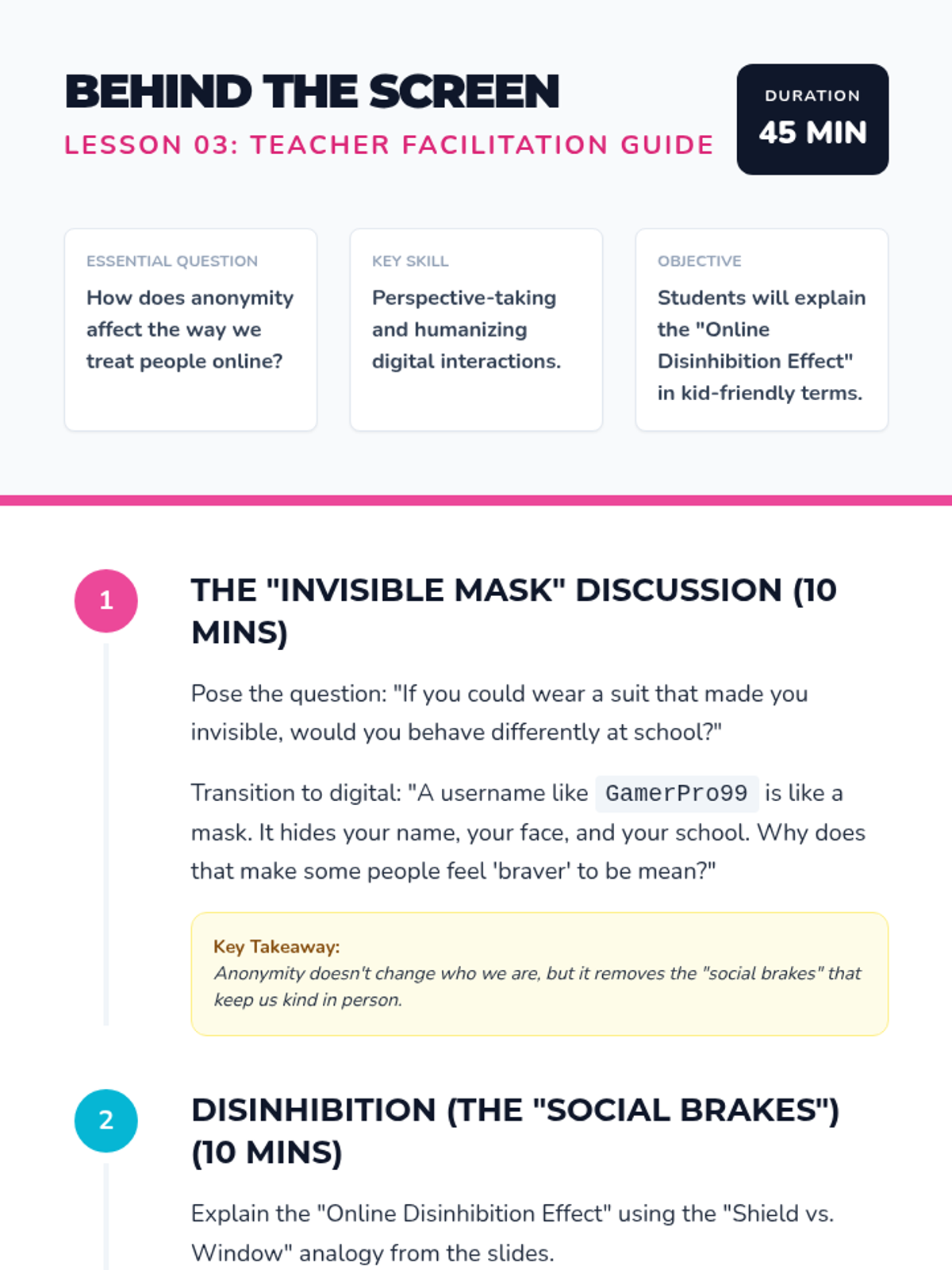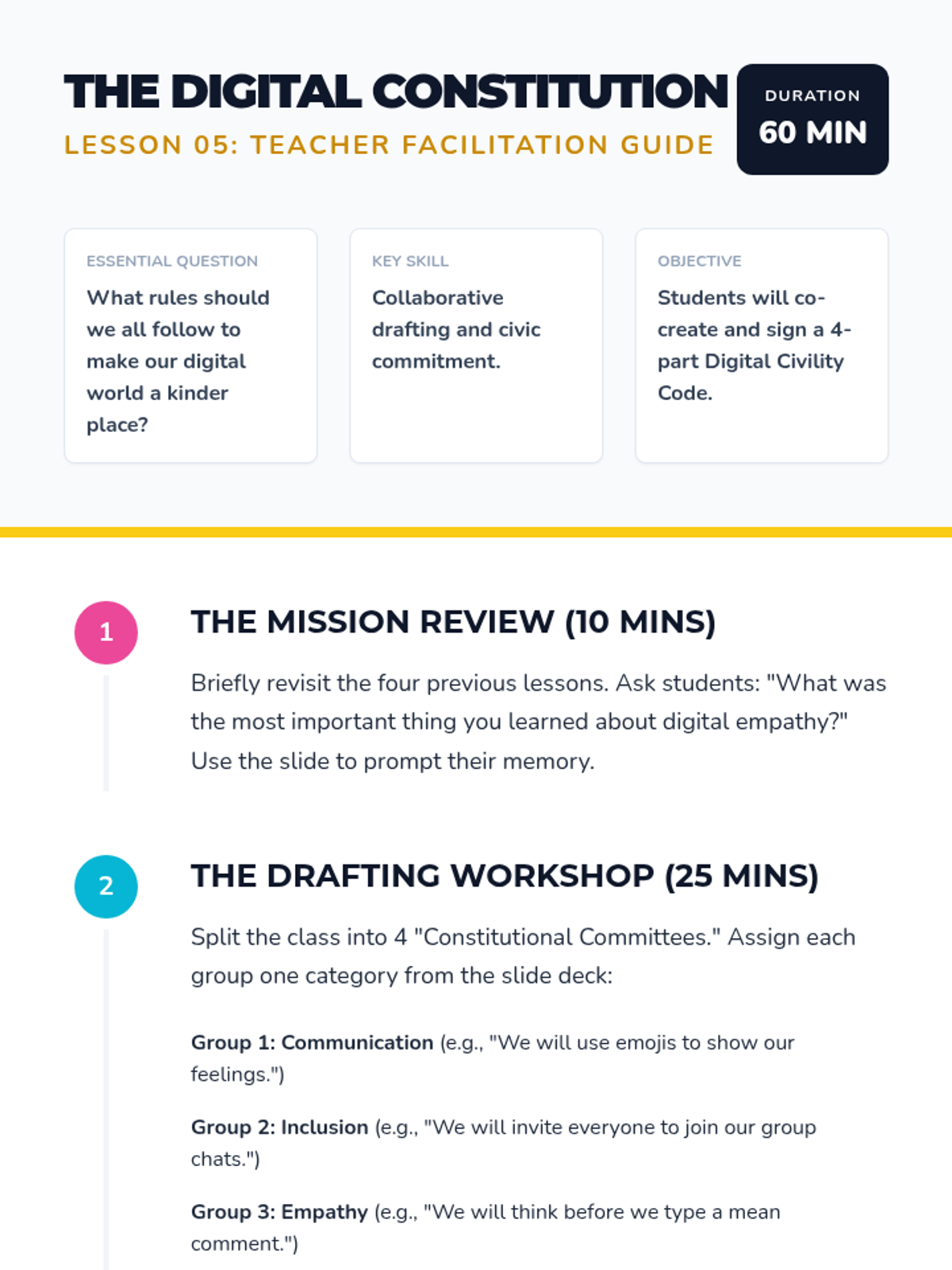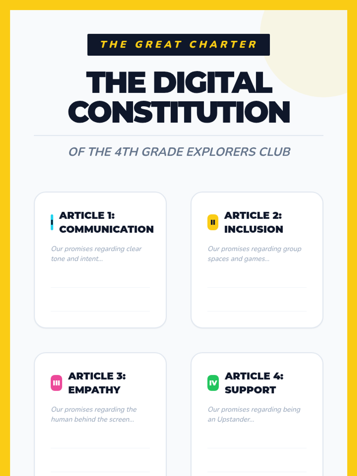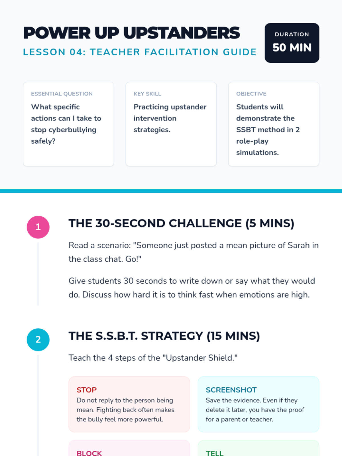 A comprehensive 5-lesson series for 4th graders focused on emotional intelligence in digital spaces. Students learn to interpret text tone, identify cyberbullying vs. conflict, understand the impact of anonymity, practice upstander strategies, and co-create a class digital civility code.
