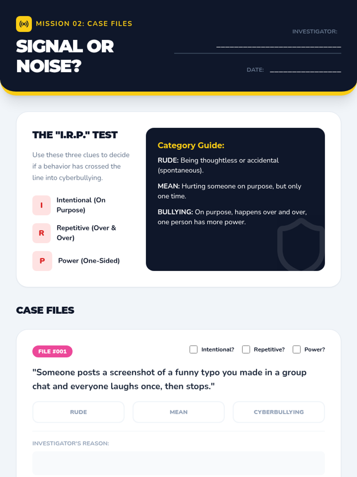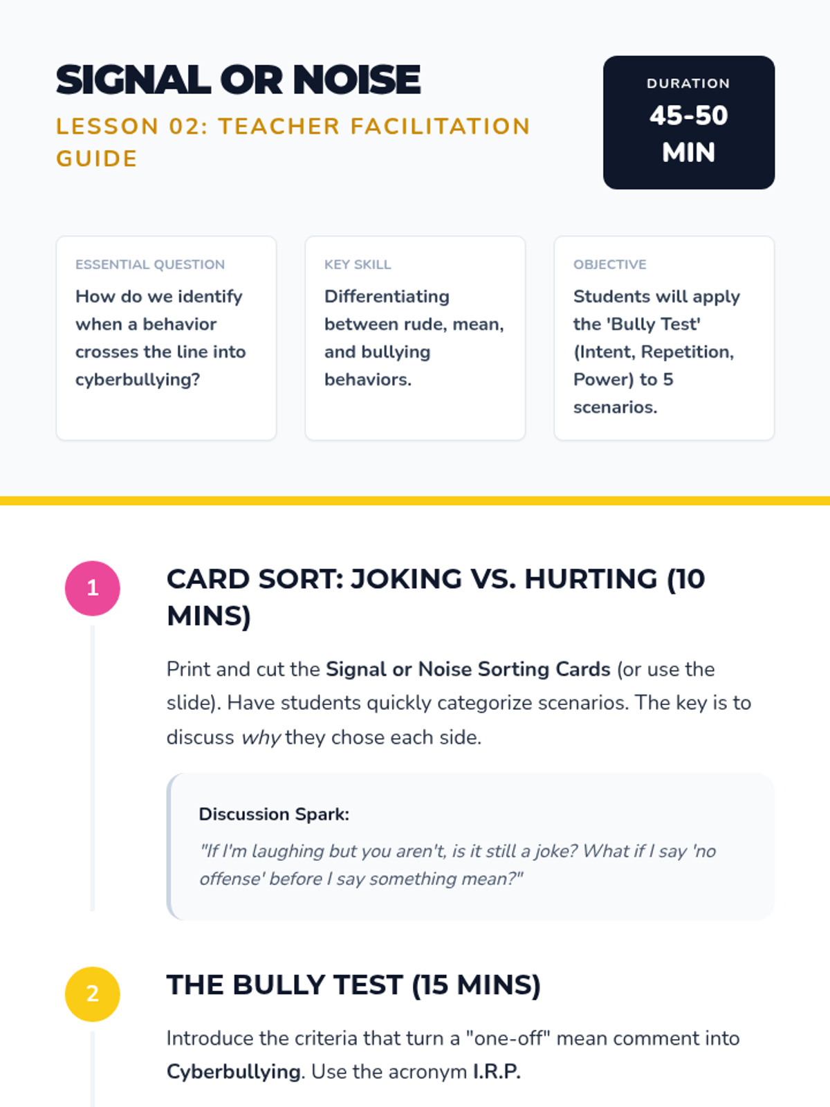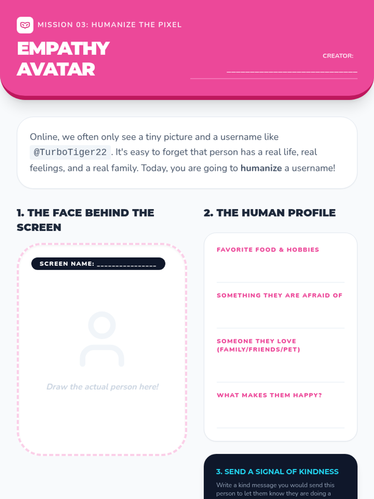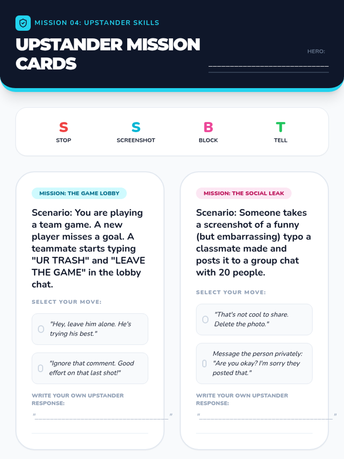 A comprehensive 5-lesson series for 4th graders focused on emotional intelligence in digital spaces. Students learn to interpret text tone, identify cyberbullying vs. conflict, understand the impact of anonymity, practice upstander strategies, and co-create a class digital civility code.
