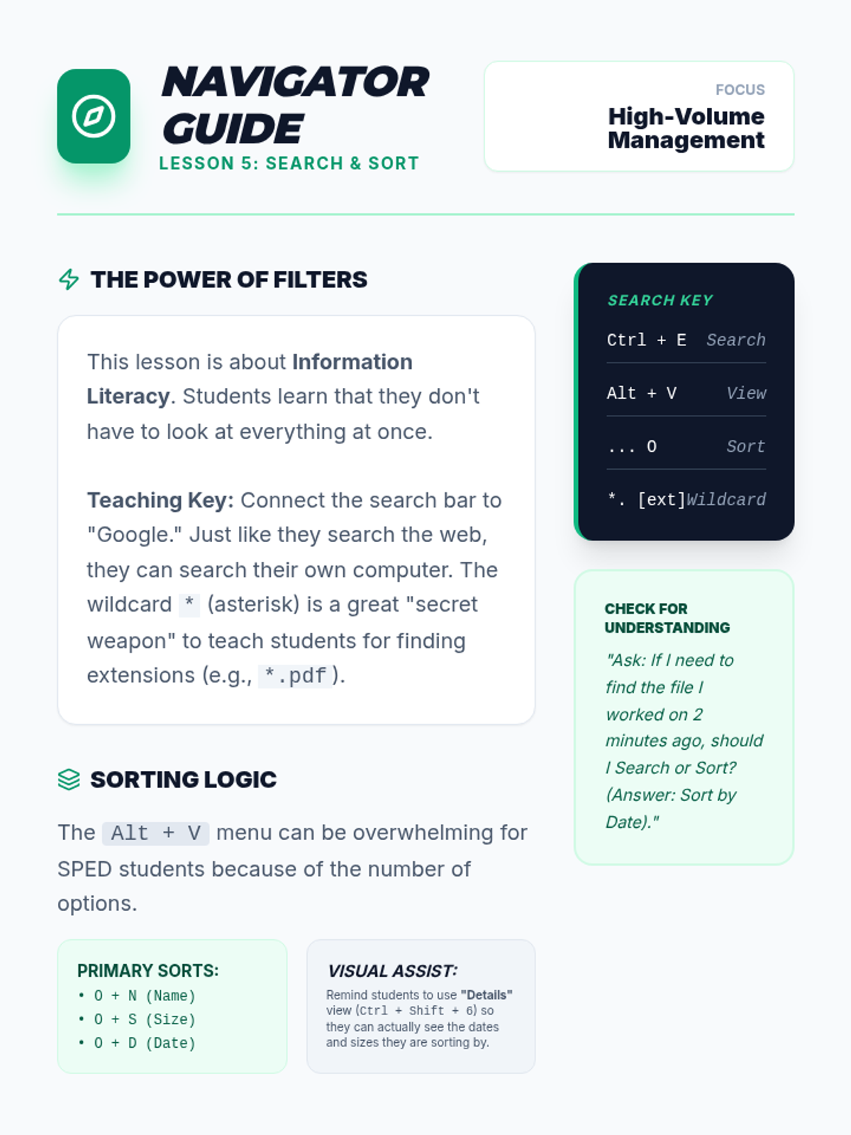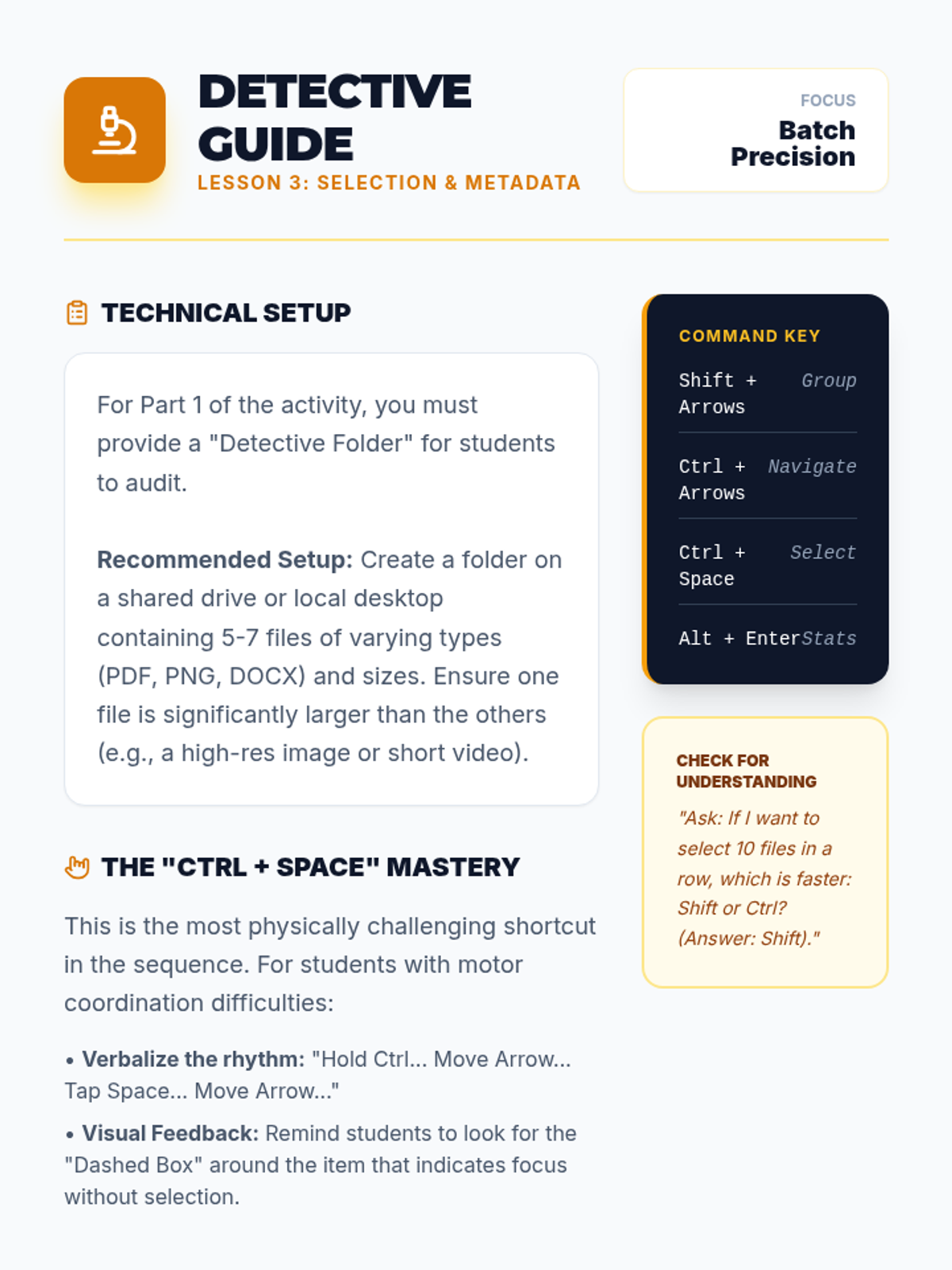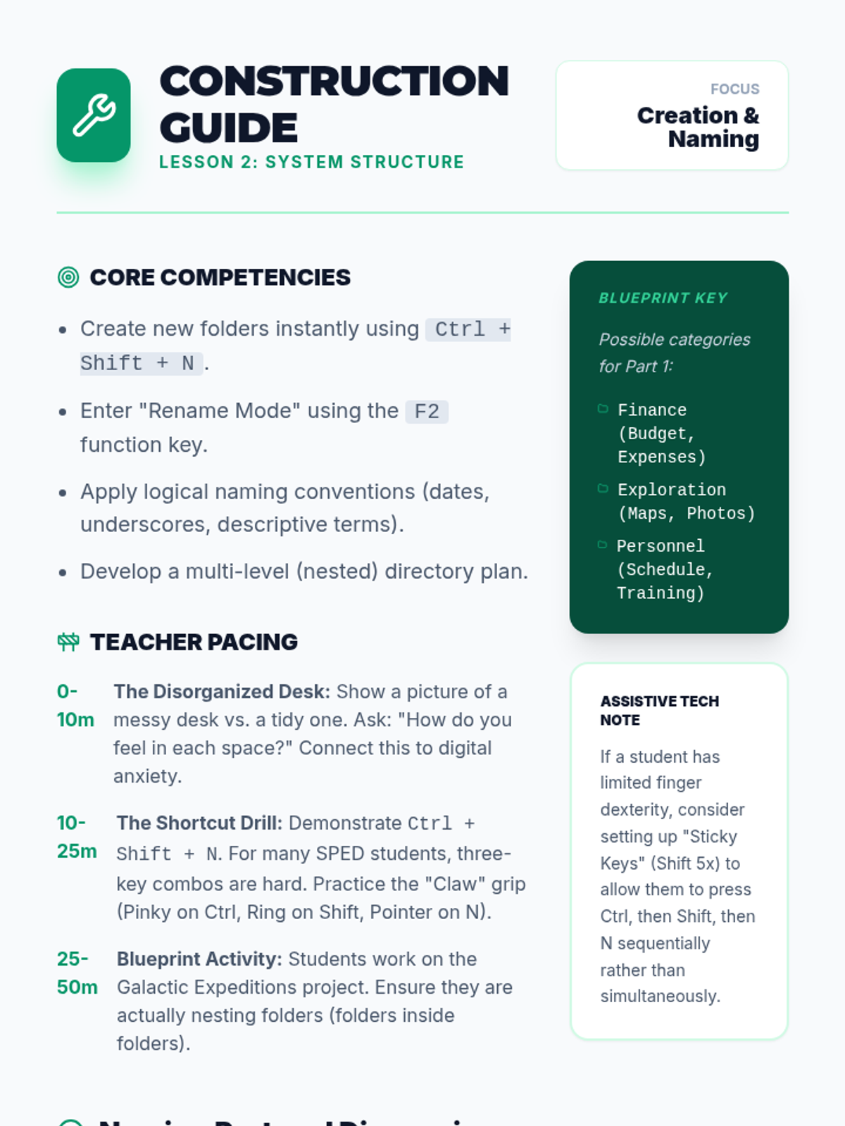 A comprehensive 11th-grade sequence teaching keyboard-only file management and digital organization. Students build a mental model of directory structures and master shortcuts for navigation, creation, selection, and manipulation without a mouse.