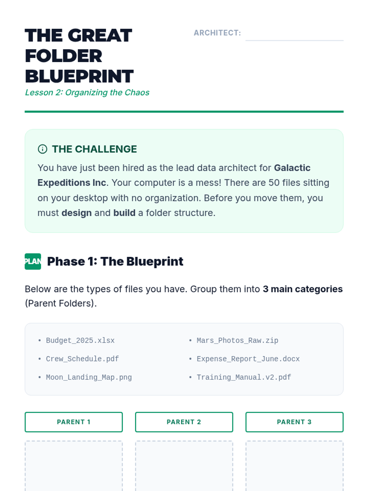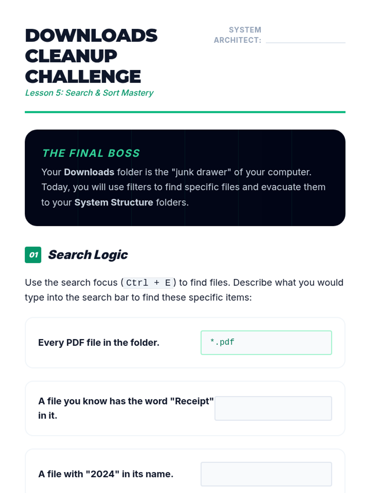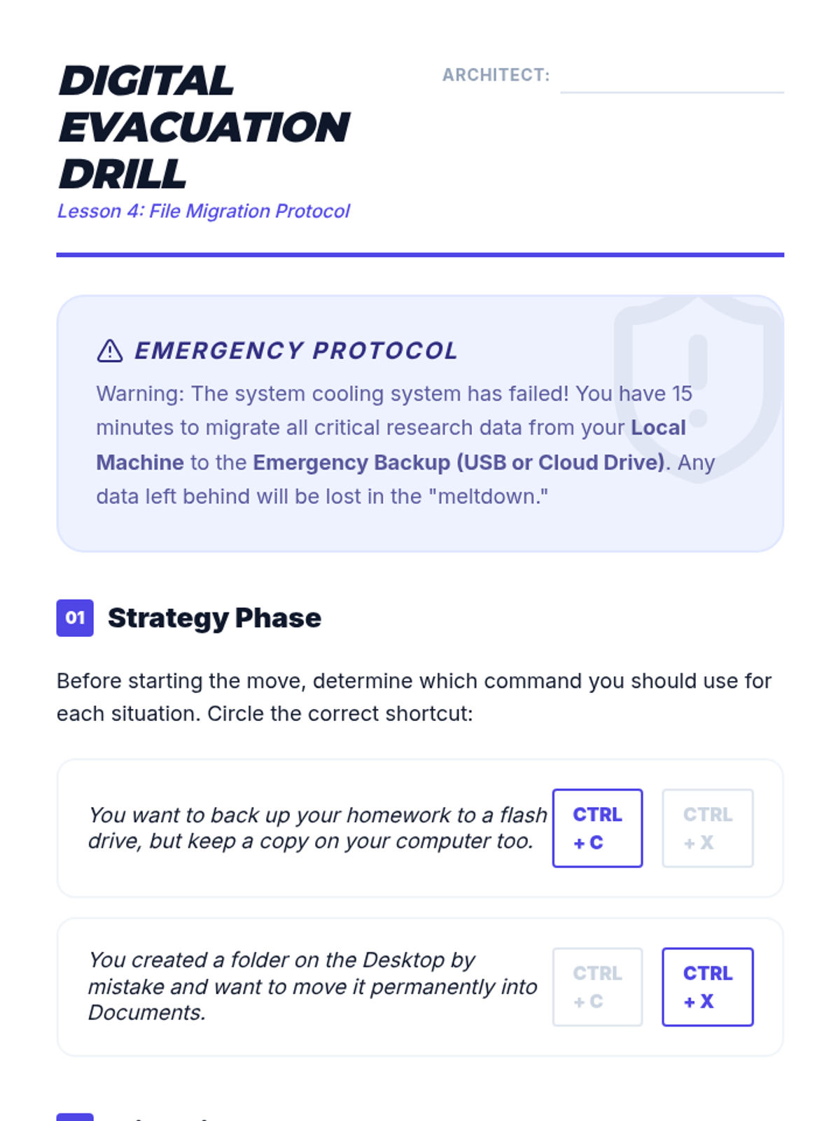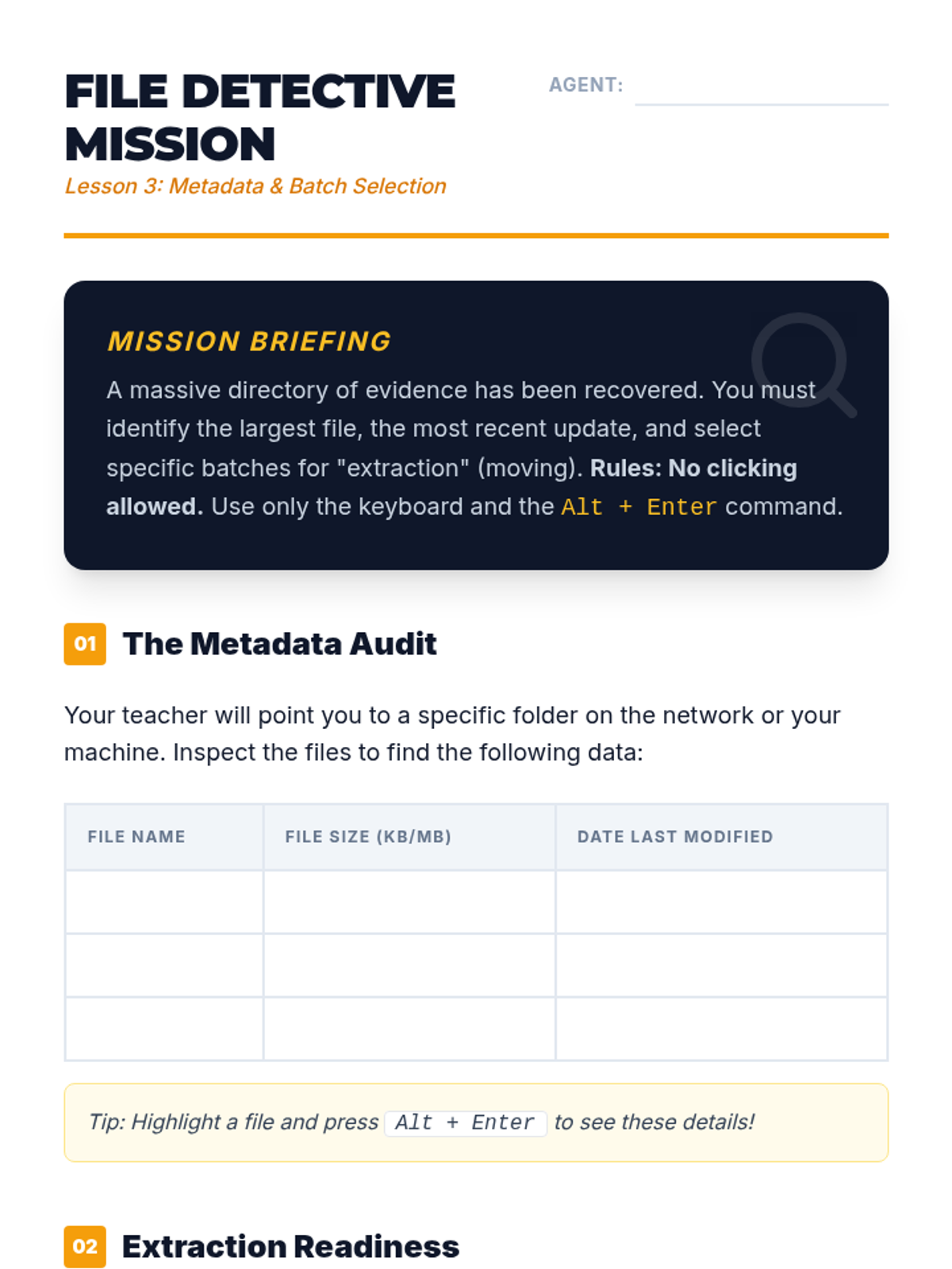 A comprehensive 11th-grade sequence teaching keyboard-only file management and digital organization. Students build a mental model of directory structures and master shortcuts for navigation, creation, selection, and manipulation without a mouse.