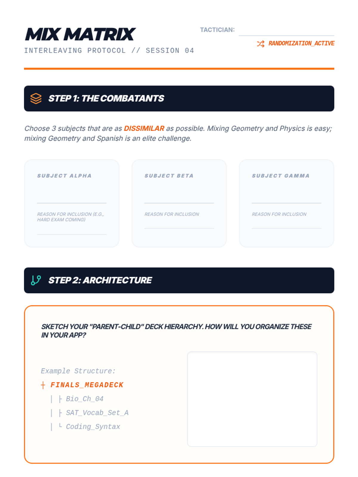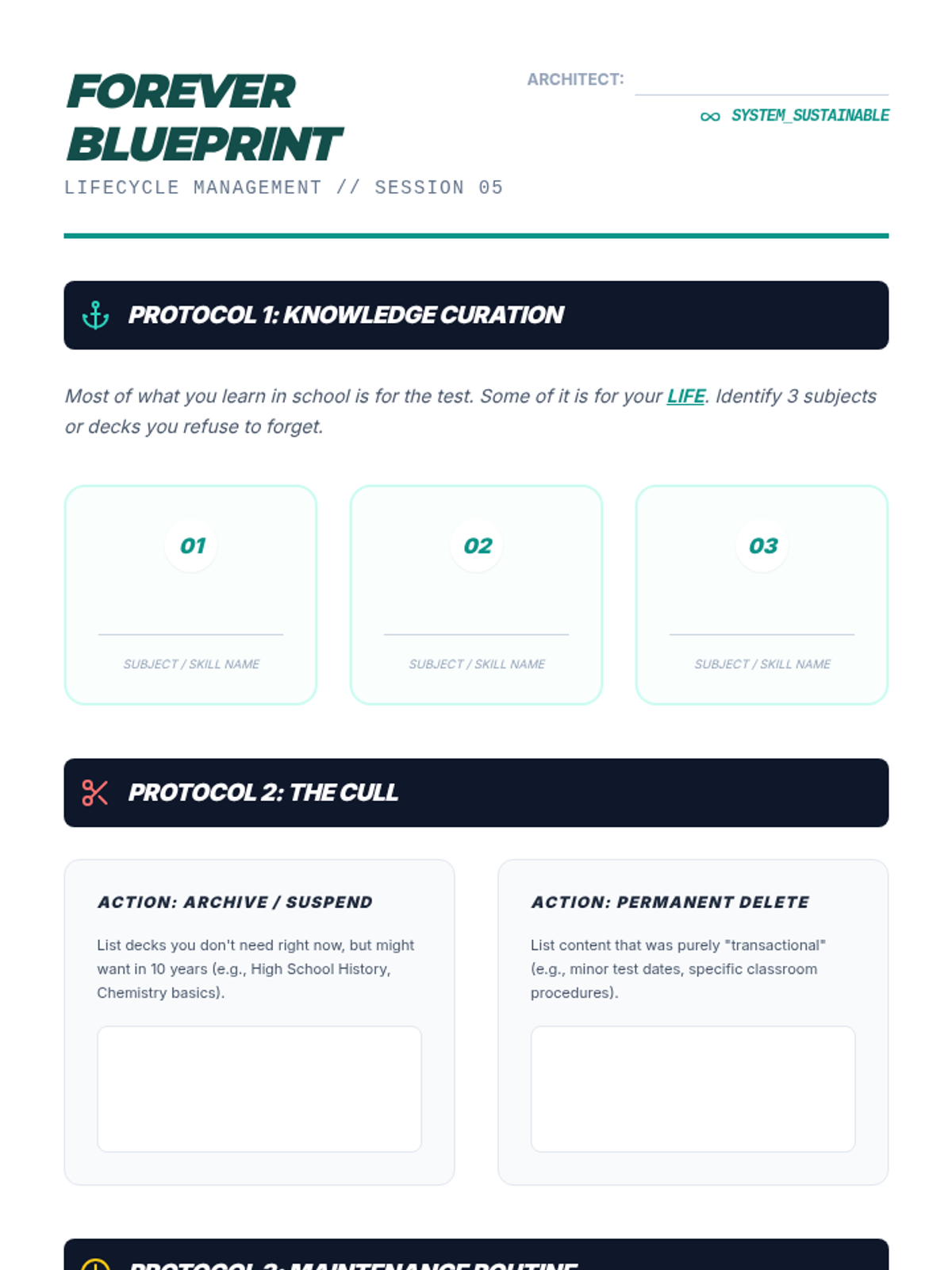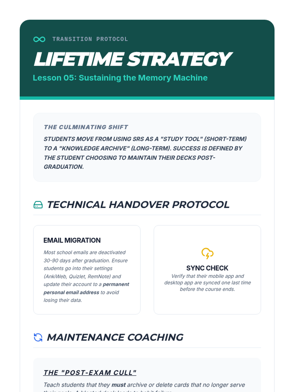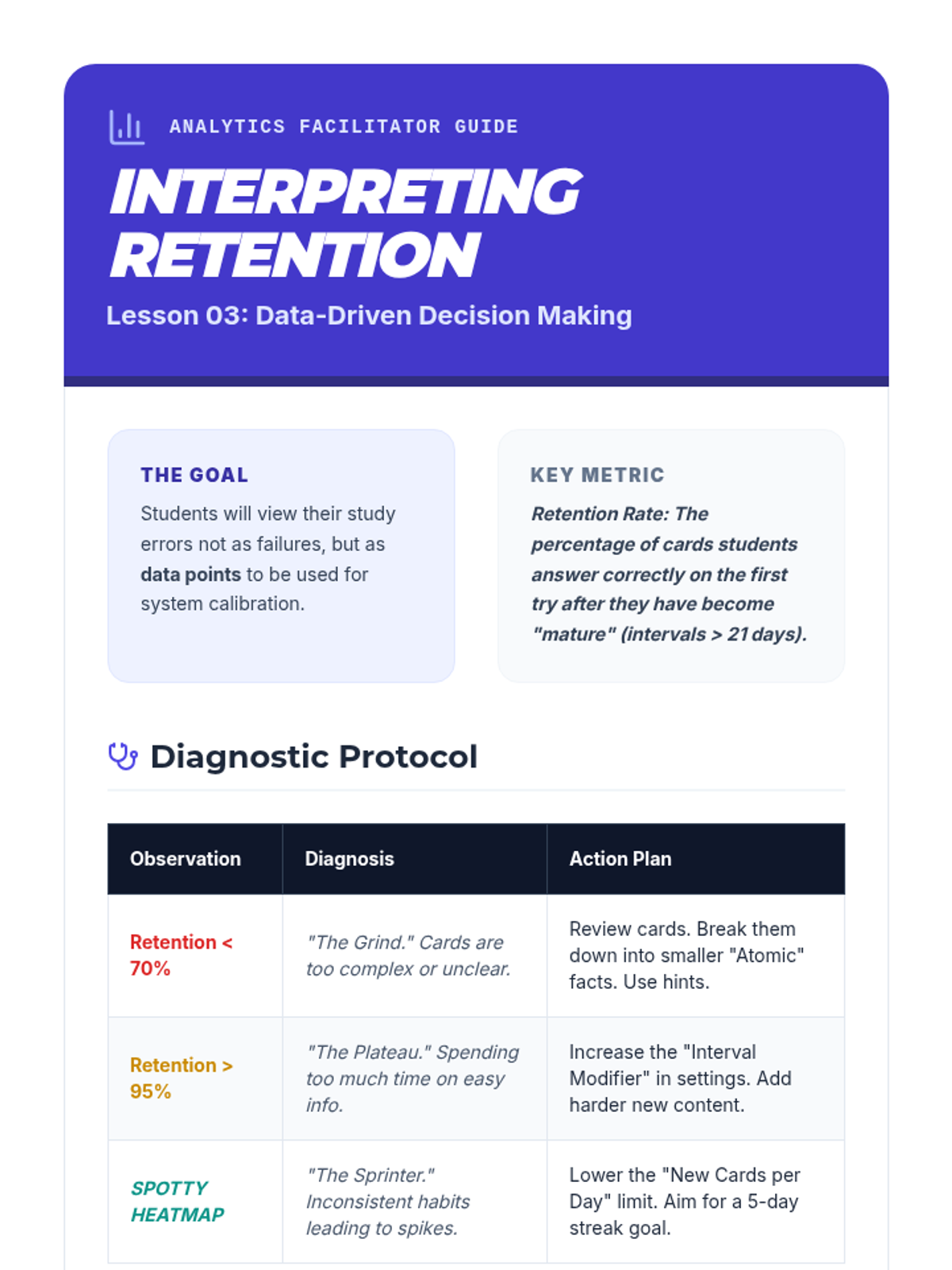 This sequence transitions 12th-grade students from manual study methods to digital spaced repetition software (SRS). Students will master advanced card-creation techniques, interpret retention data to optimize their learning, and develop long-term maintenance strategies for post-secondary success.