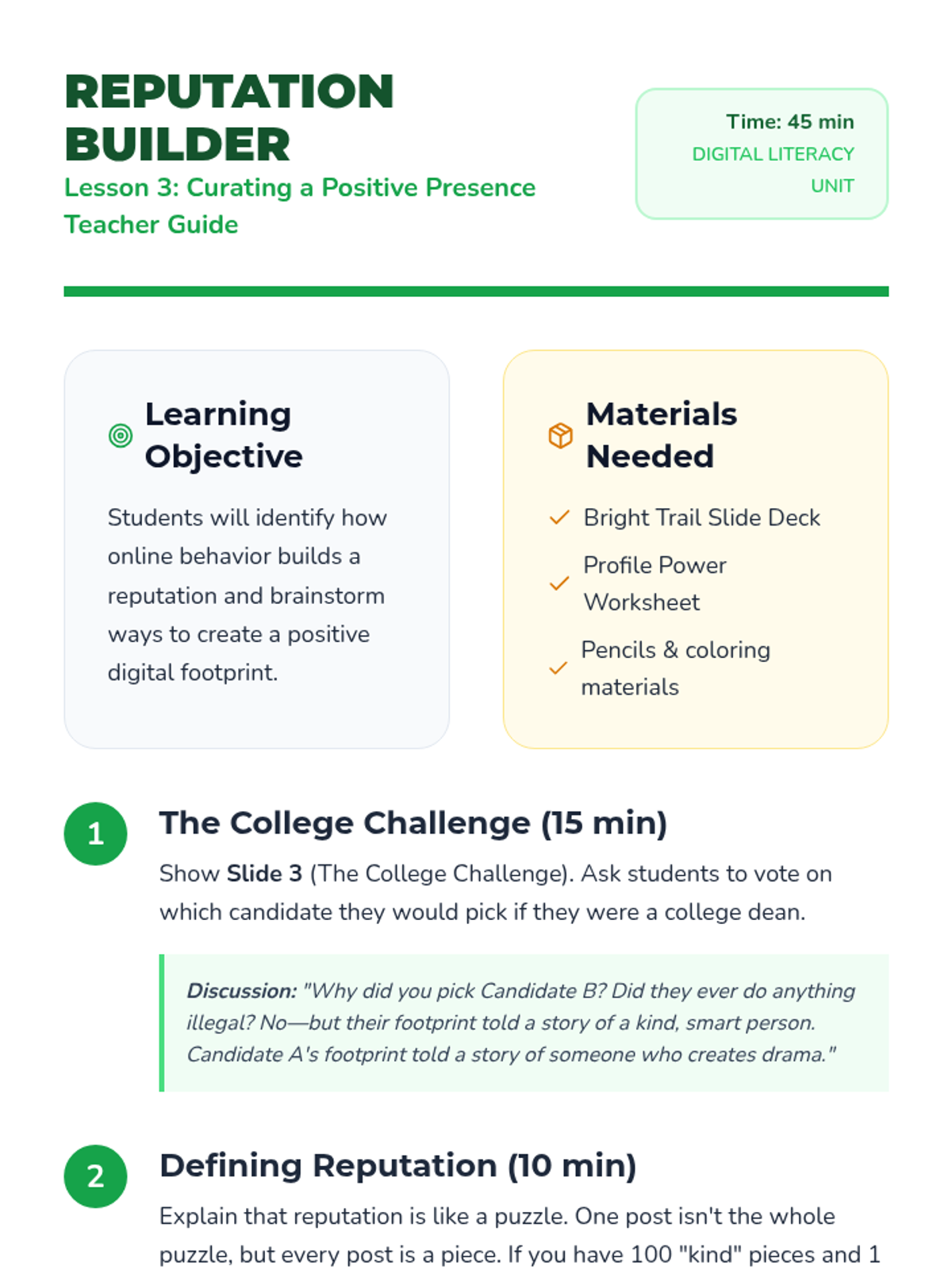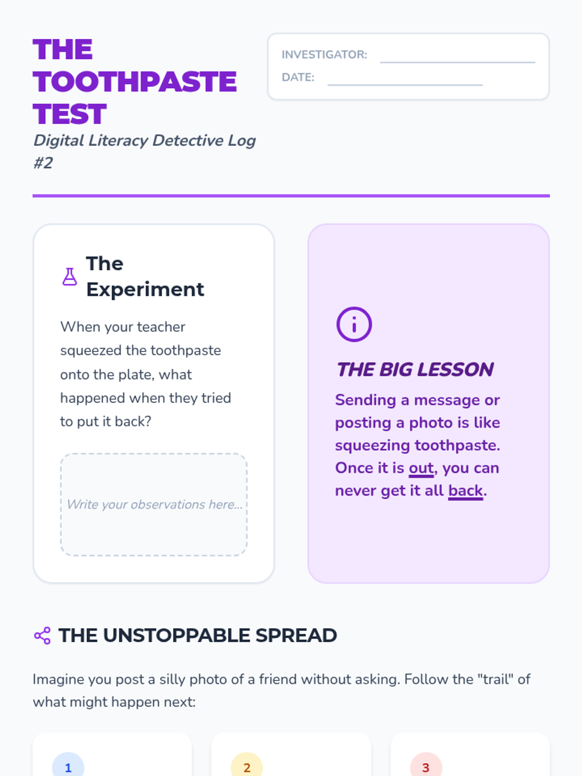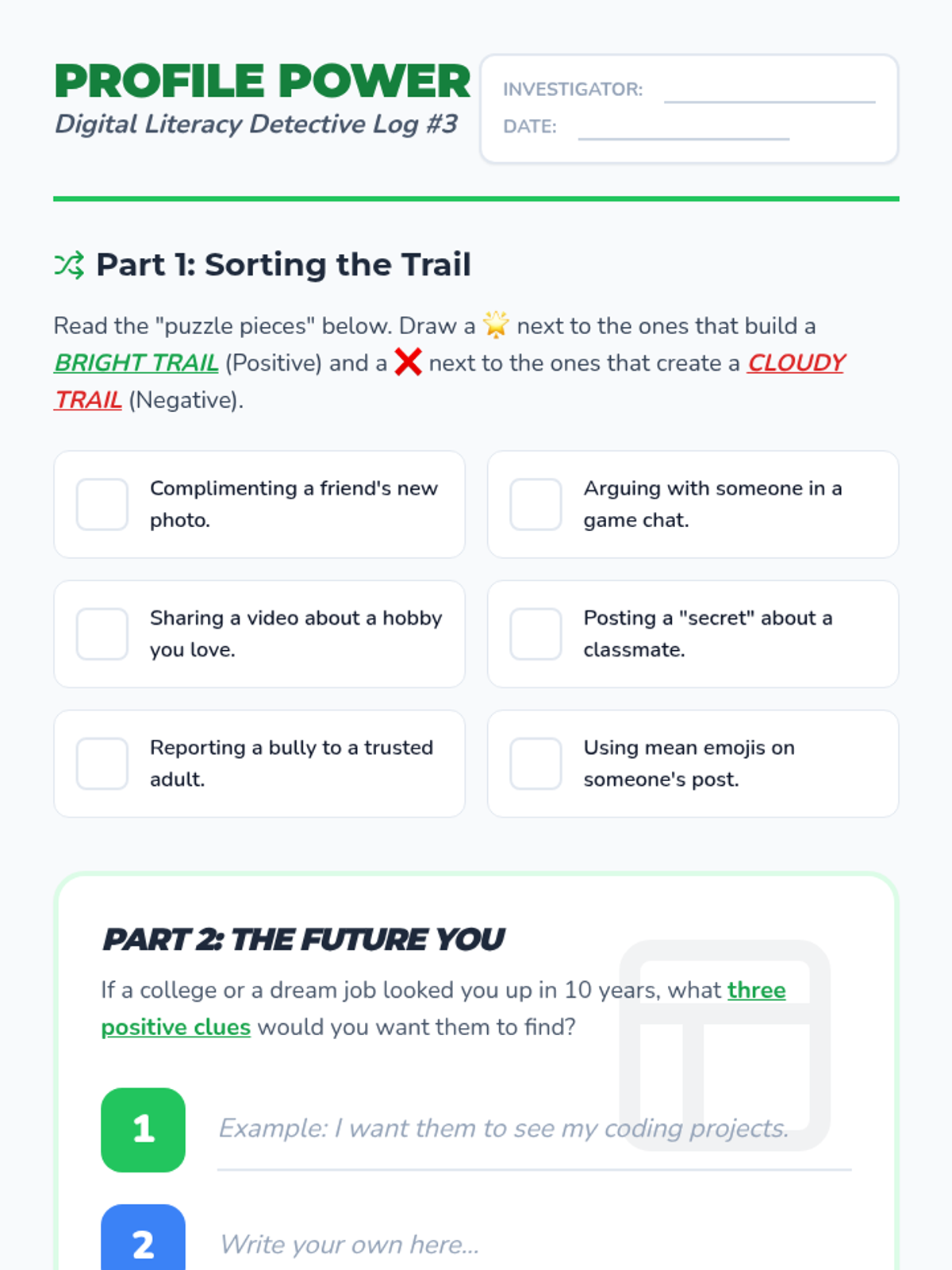 A 5-lesson unit for 3rd graders on understanding that their online actions leave a permanent, searchable trail. Students learn through analogies like wet cement and toothpaste, eventually becoming 'Digital Detectives' who can audit profiles and curate positive reputations.