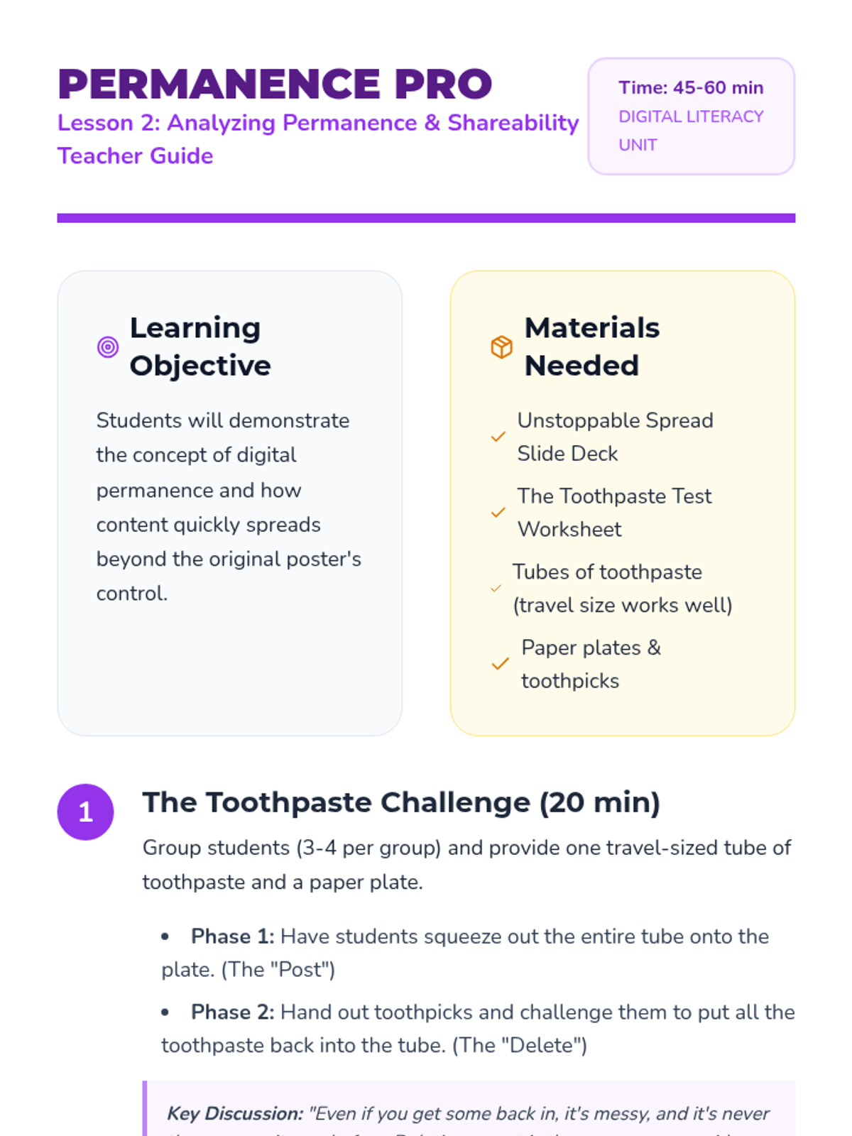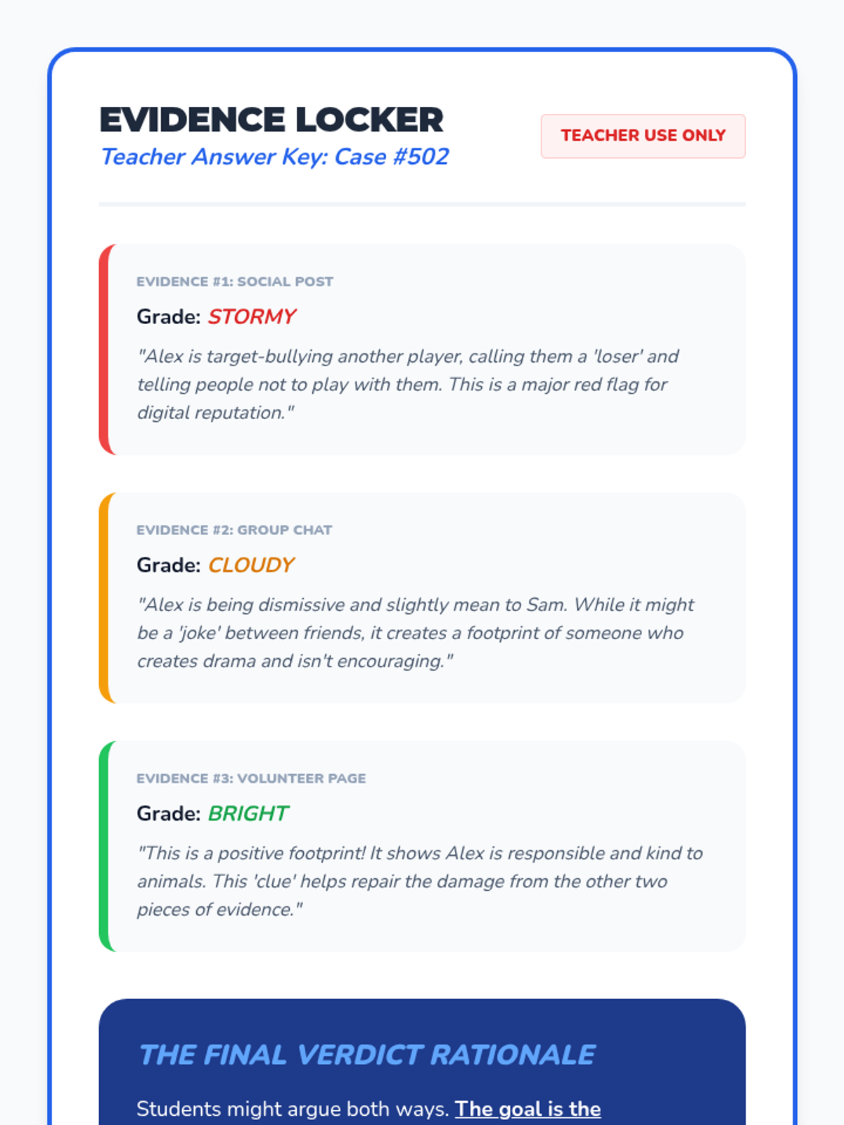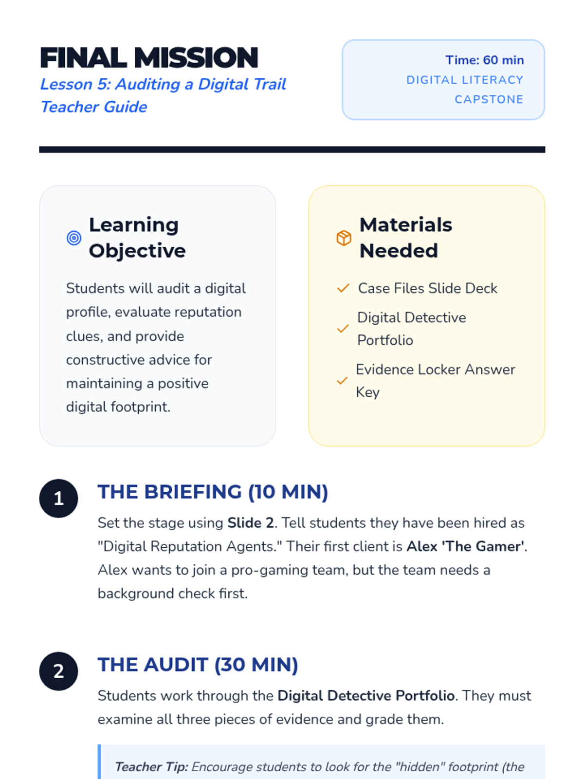A 5-lesson unit for 3rd graders on understanding that their online actions leave a permanent, searchable trail. Students learn through analogies like wet cement and toothpaste, eventually becoming 'Digital Detectives' who can audit profiles and curate positive reputations.