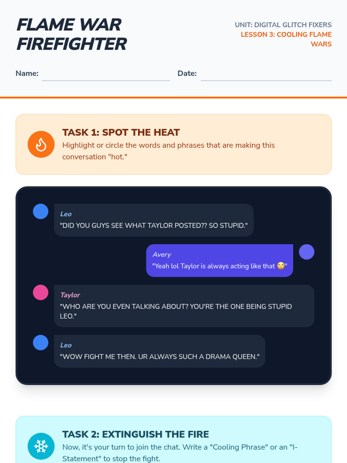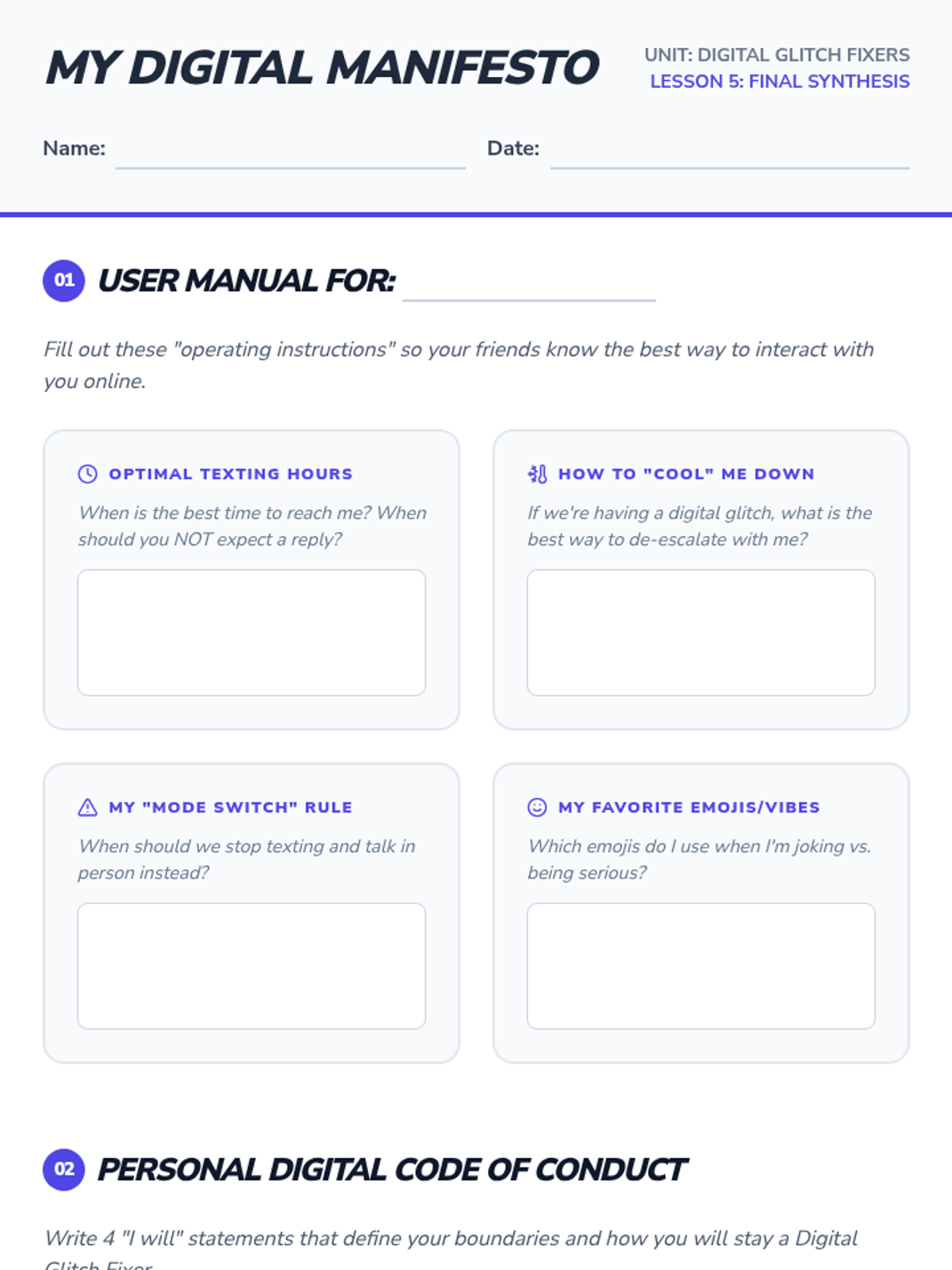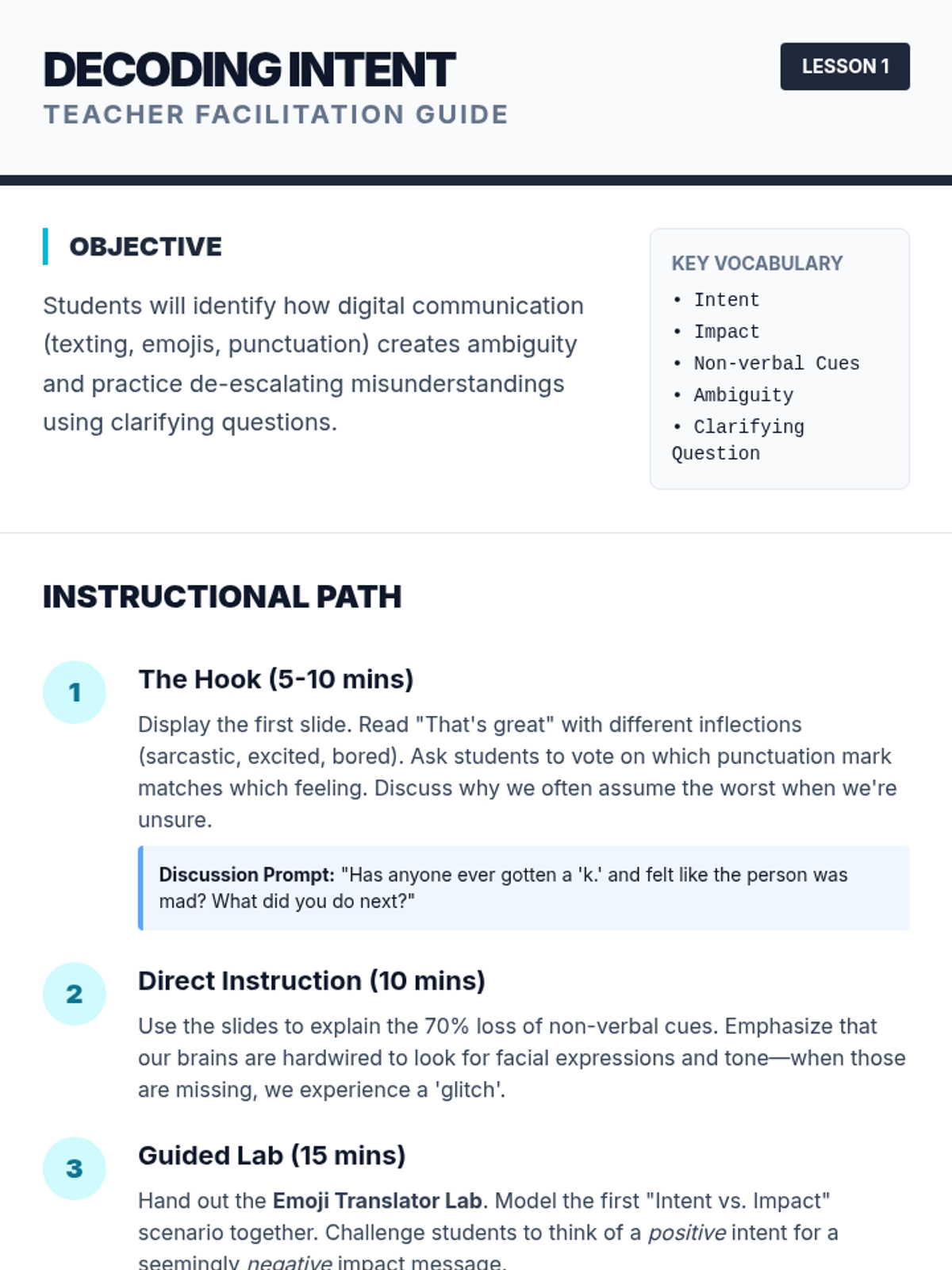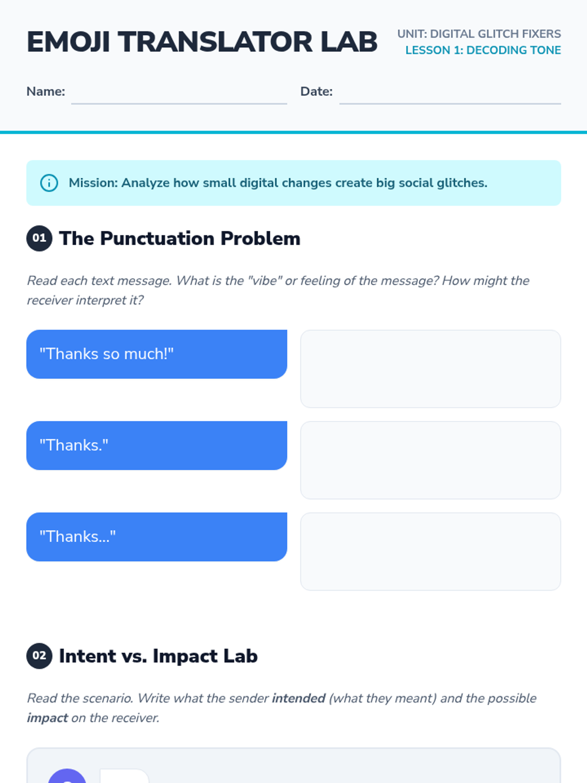 A 5-lesson unit for 8th-grade social communication students focused on navigating digital conflicts, decoding tone in text, and moving from online friction to offline resolution. Students learn to bridge the 'intent vs. impact' gap and develop personal digital boundaries.