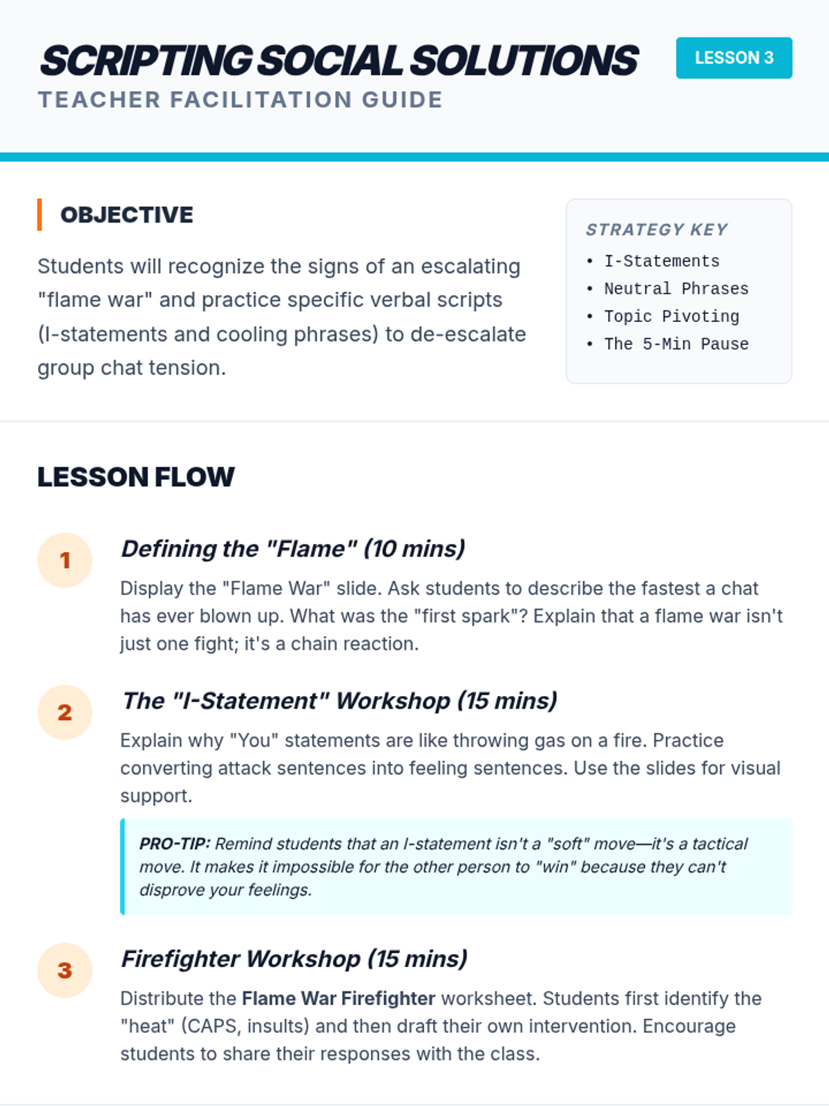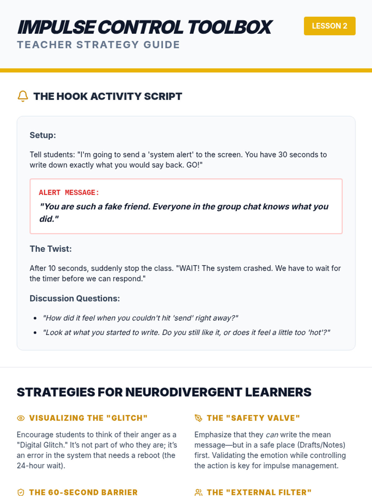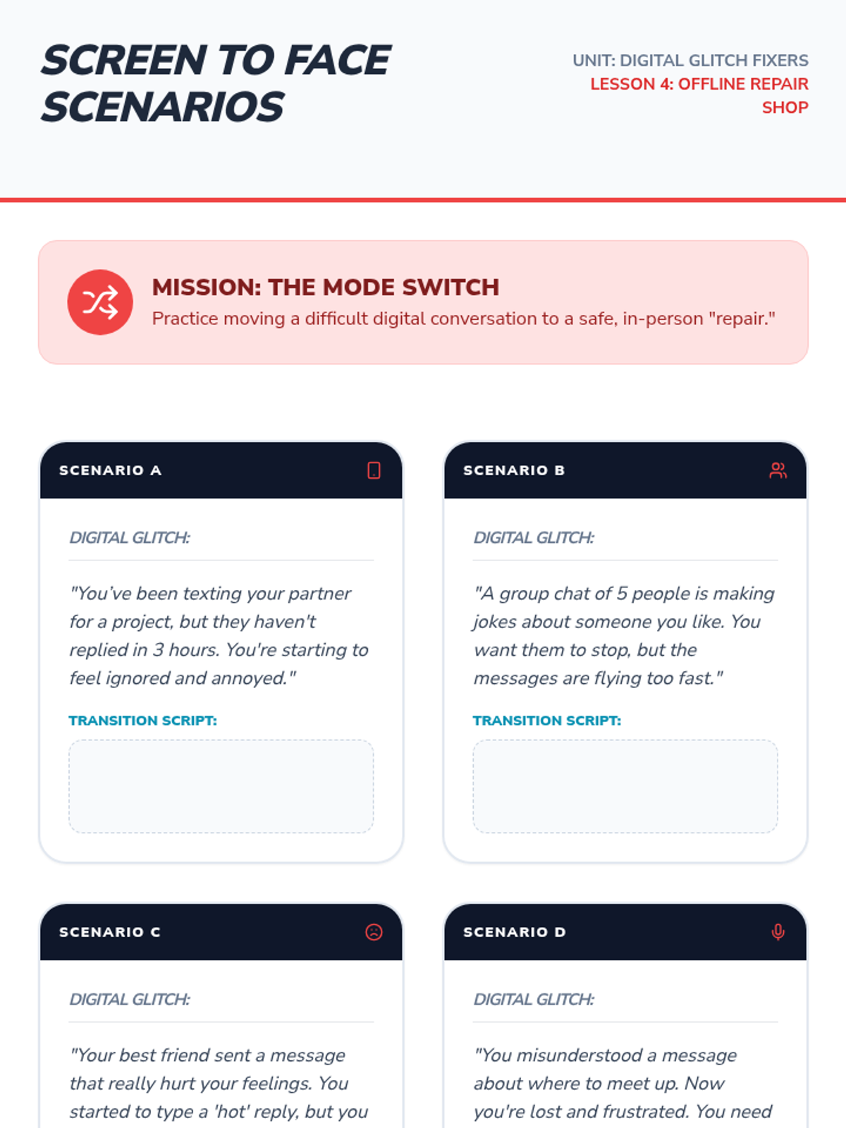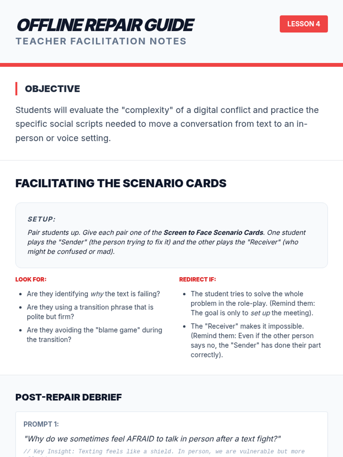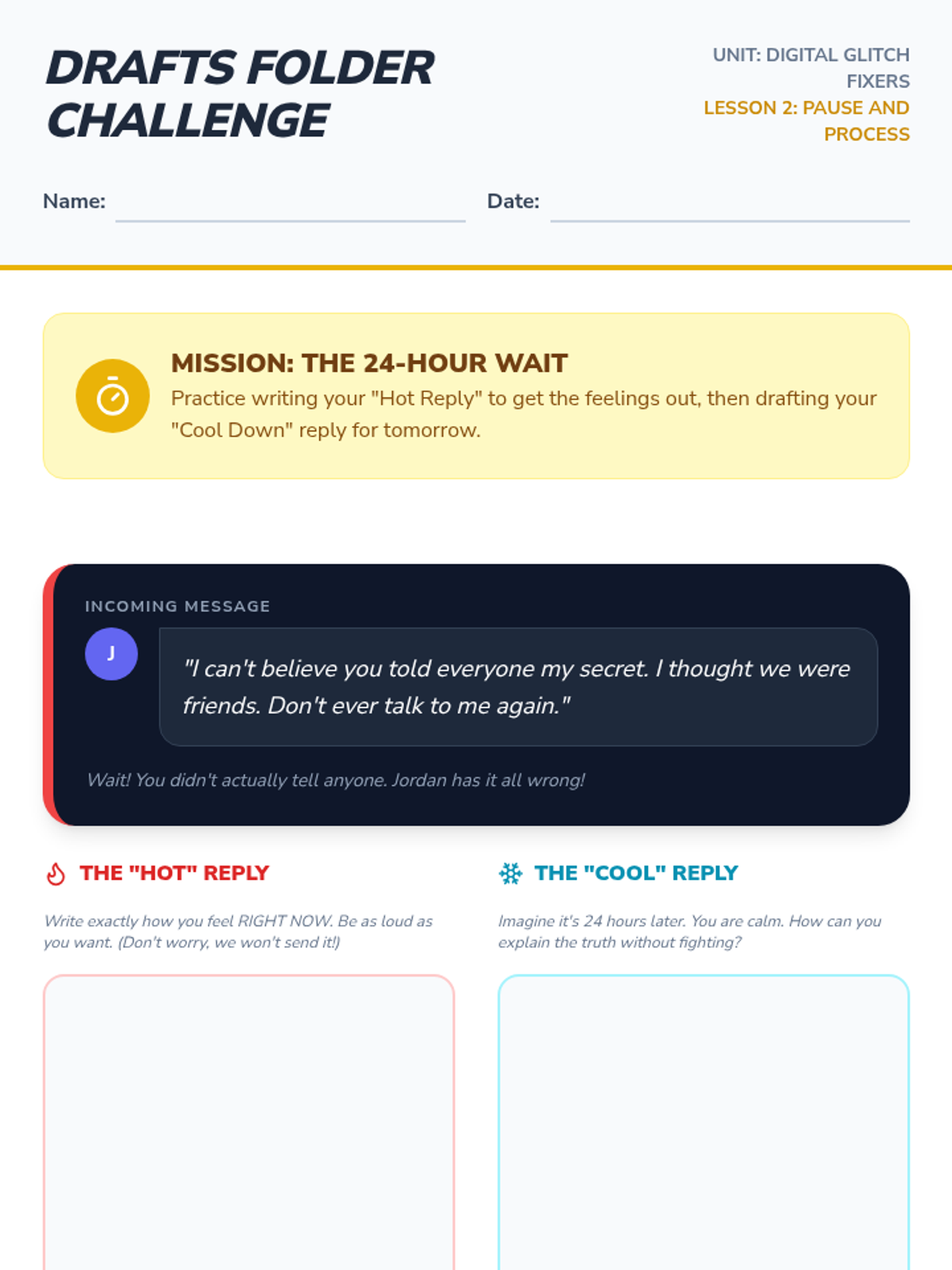 A 5-lesson unit for 8th-grade social communication students focused on navigating digital conflicts, decoding tone in text, and moving from online friction to offline resolution. Students learn to bridge the 'intent vs. impact' gap and develop personal digital boundaries.