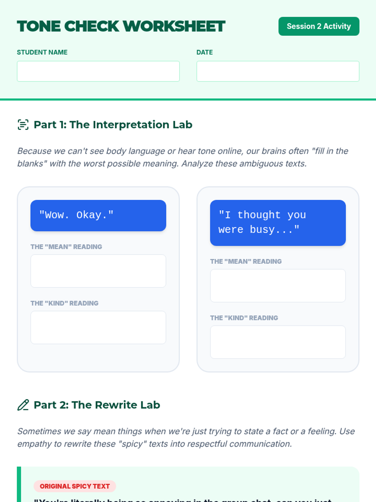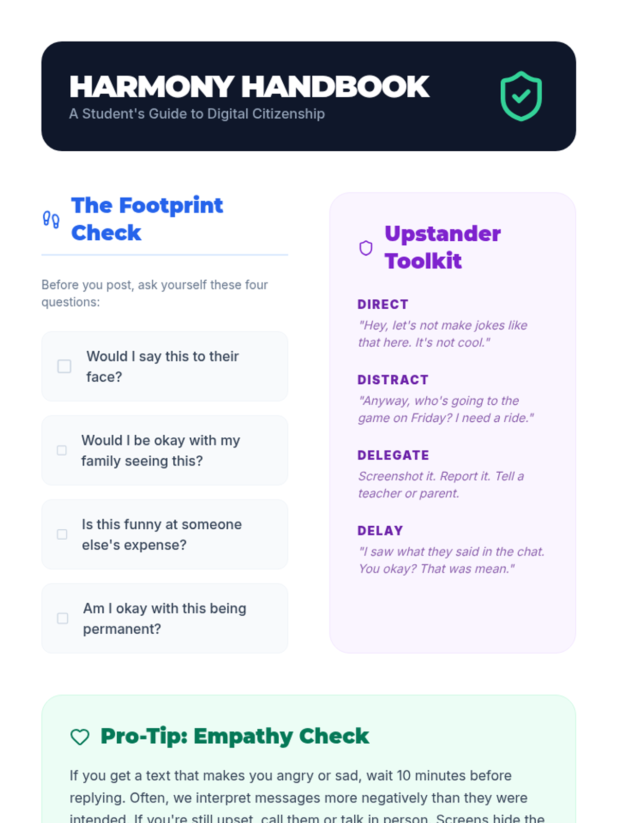 A three-part lesson series designed for middle schoolers to navigate the digital world with empathy, integrity, and safety. Students explore their digital footprint, practice nuanced communication, and develop strategies to combat cyberbullying as upstanders.