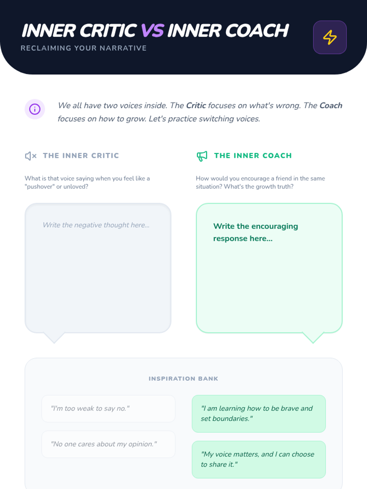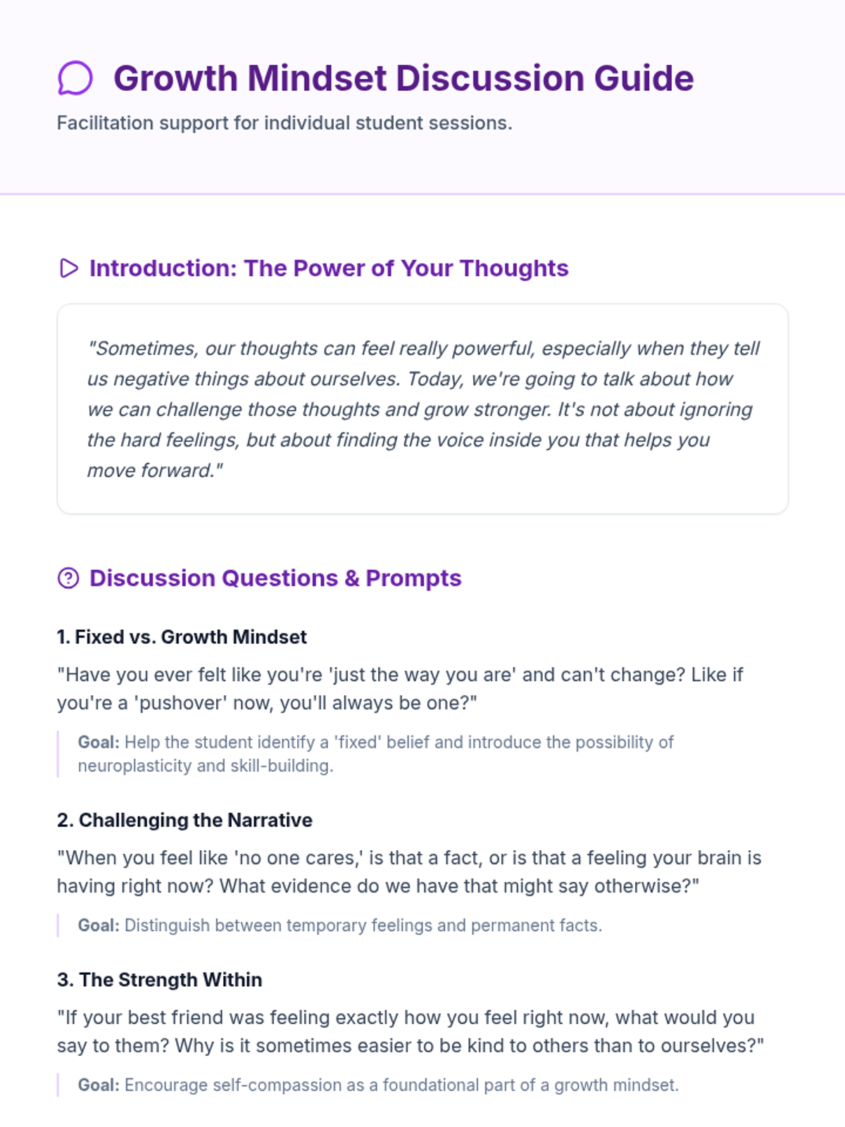 A 4-session Tier 2 CBT sequence for girls focusing on self-esteem and negative thinking patterns. This sequence builds on CBT basics to provide advanced strategies for cognitive reframing, thought stopping, self-compassion, and growth mindset.