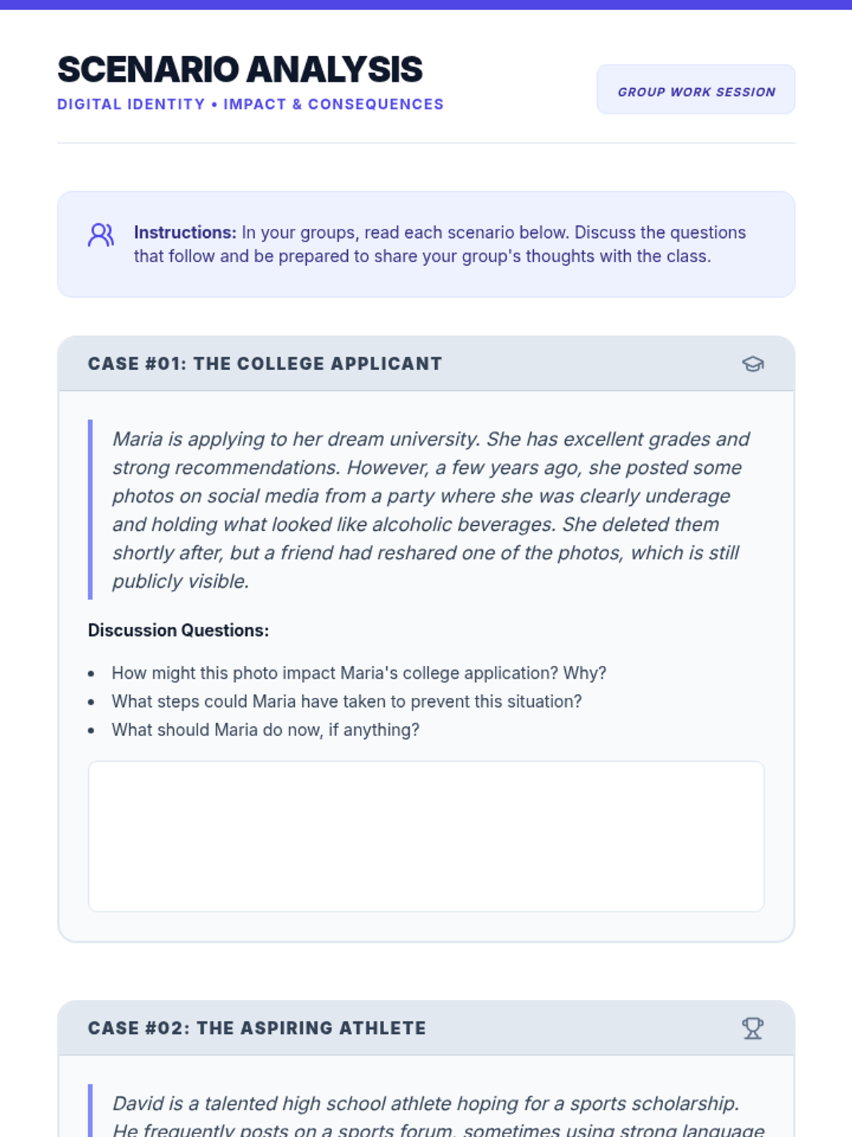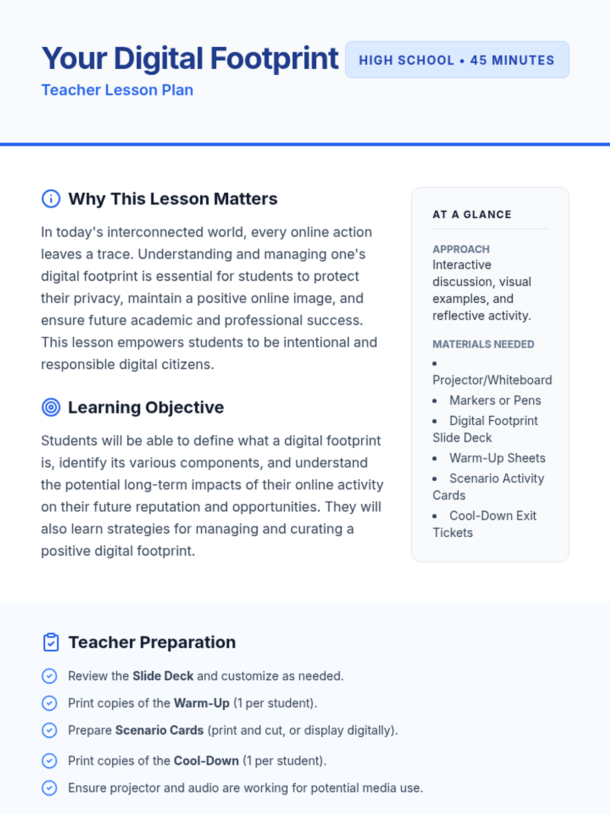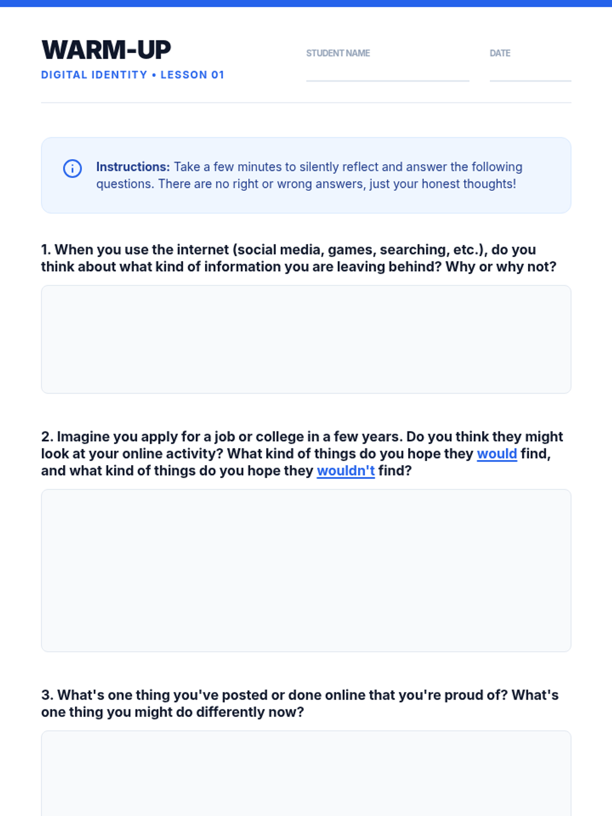 A comprehensive sequence exploring digital citizenship and personal self-worth. Students learn to manage their online presence in Lesson 1 and develop a growth mindset and positive self-image in Lesson 2.