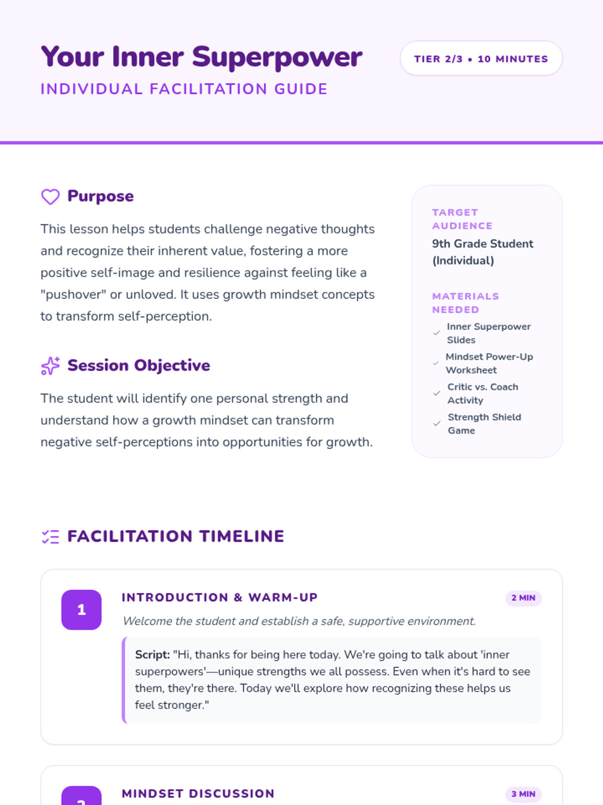A high-impact 5-lesson sequence designed for credit-deficient high school sophomores to reclaim their academic path. The curriculum reframes impulse control as a strategic 'power move' for achieving independence, career success, and graduation through cognitive discipline and environmental awareness.