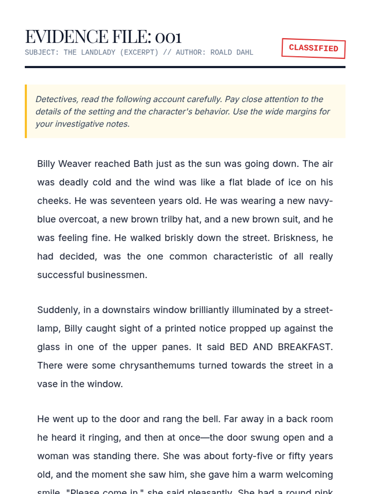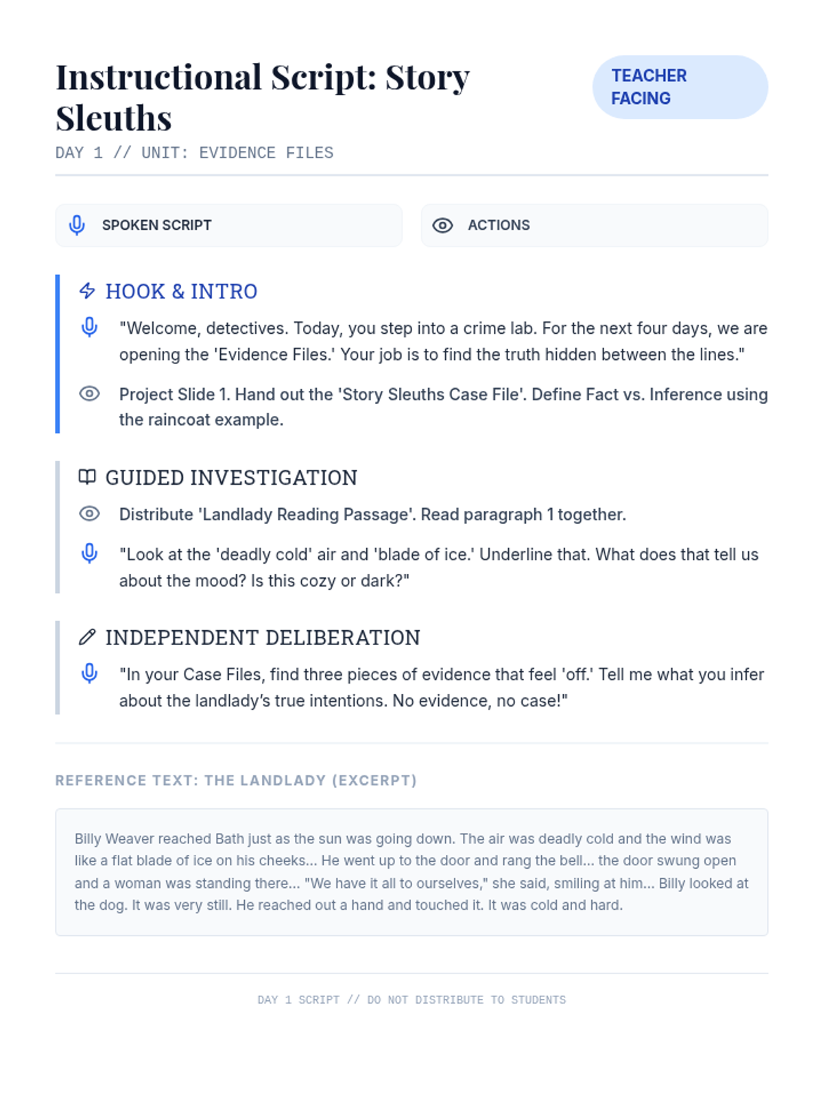 A four-day investigative unit focused on citing textual evidence and making inferences across various genres, including short stories, non-fiction, and poetry. Students act as 'Evidence Detectives' to solve literary and factual mysteries while engaging in collaborative discussions.