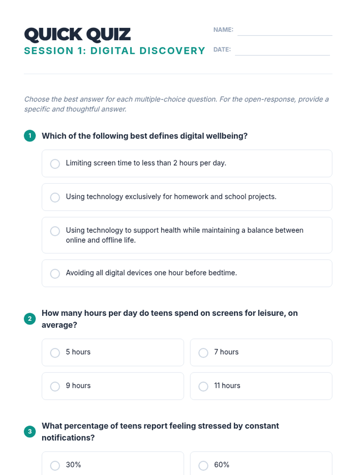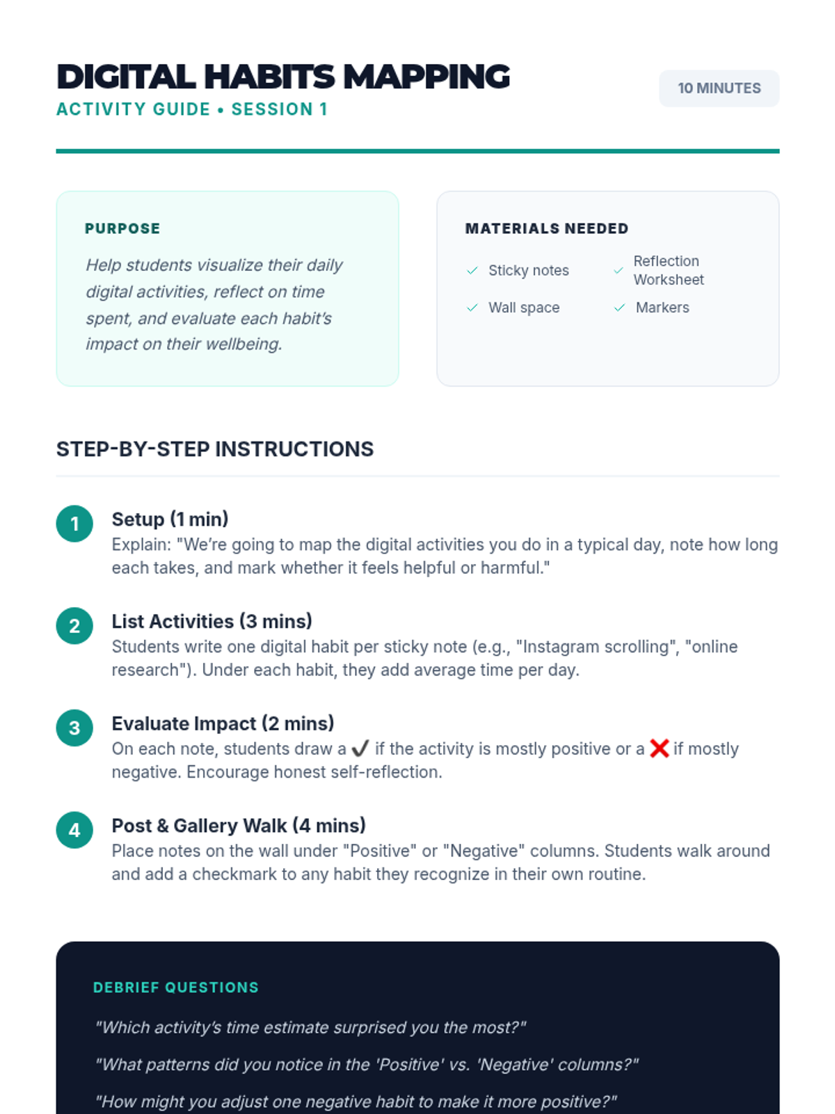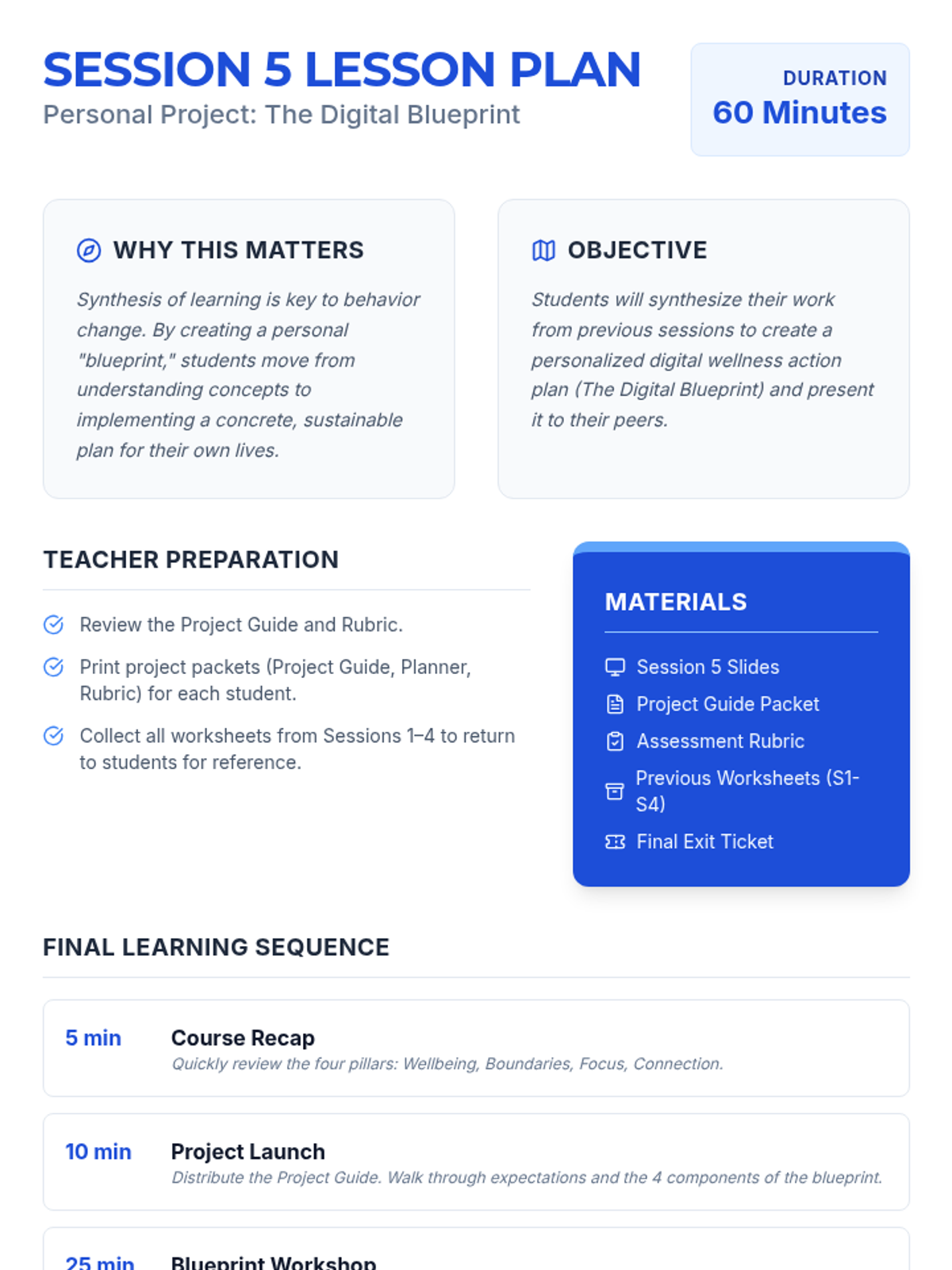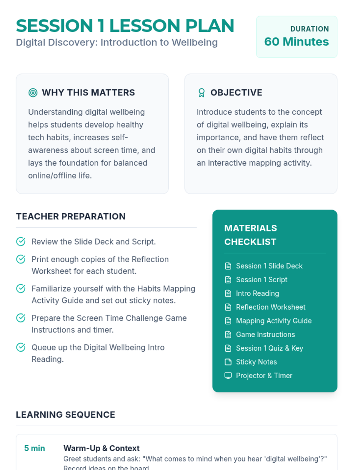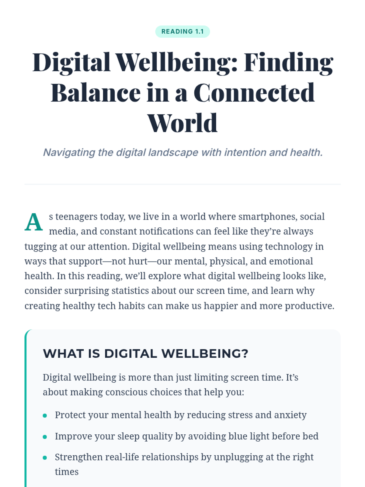 A 5-session digital wellbeing course for 11th graders designed to help them balance their online and offline lives. Students explore digital habits, set tech boundaries, manage notifications, analyze social media impact, and culminate their learning in a personalized wellness project.