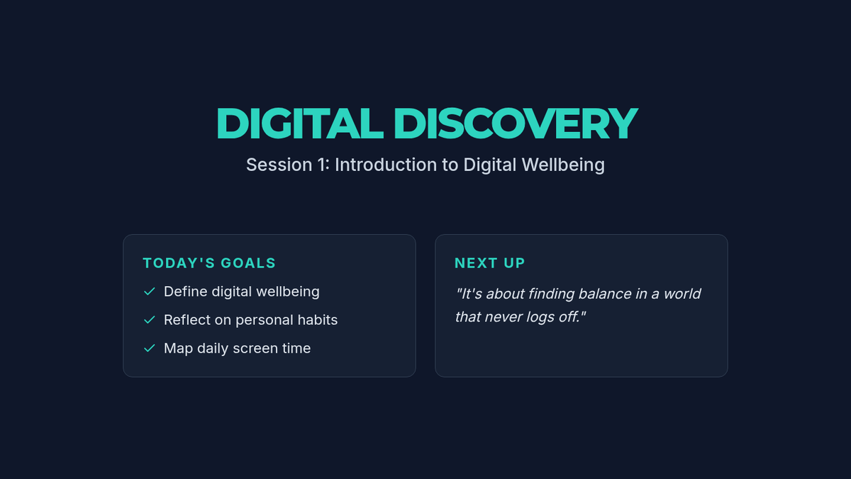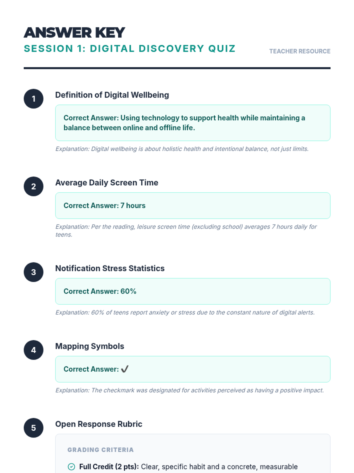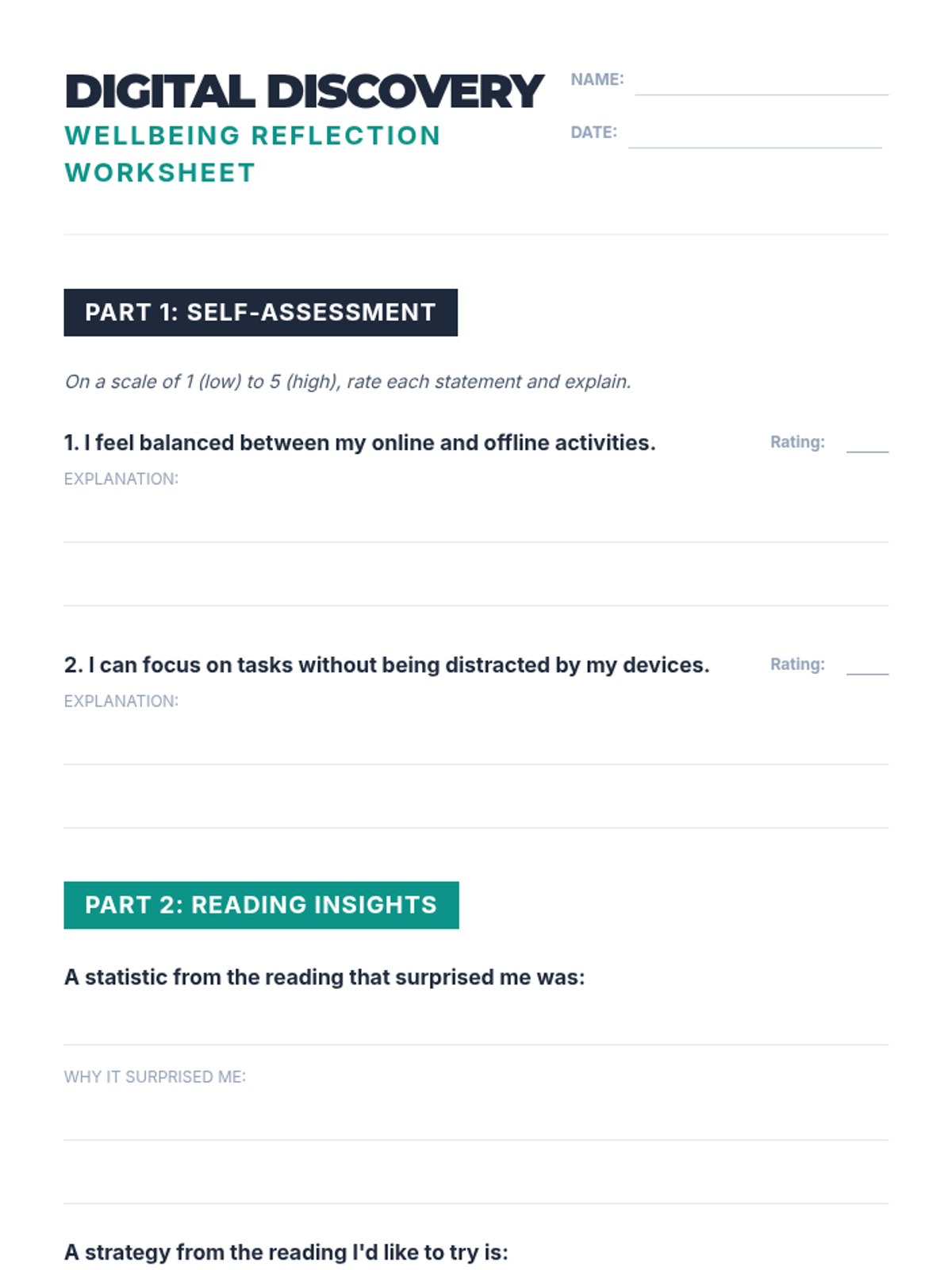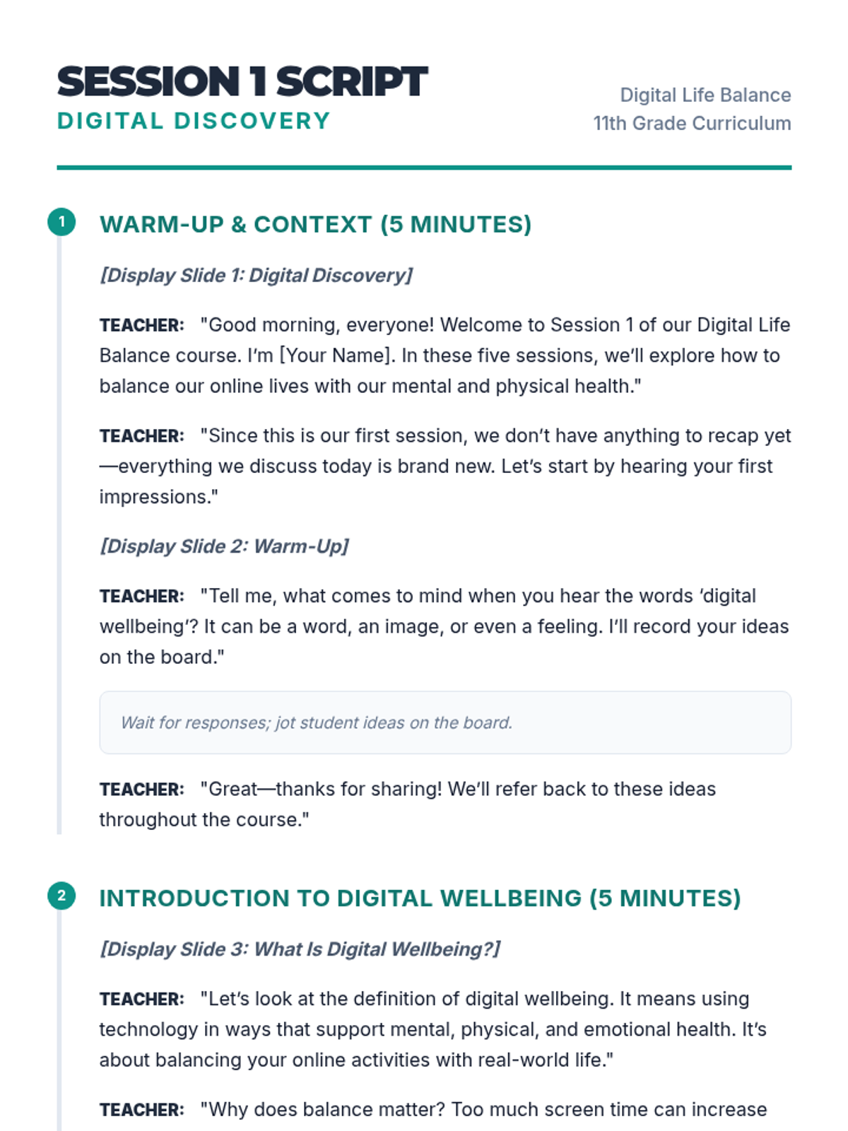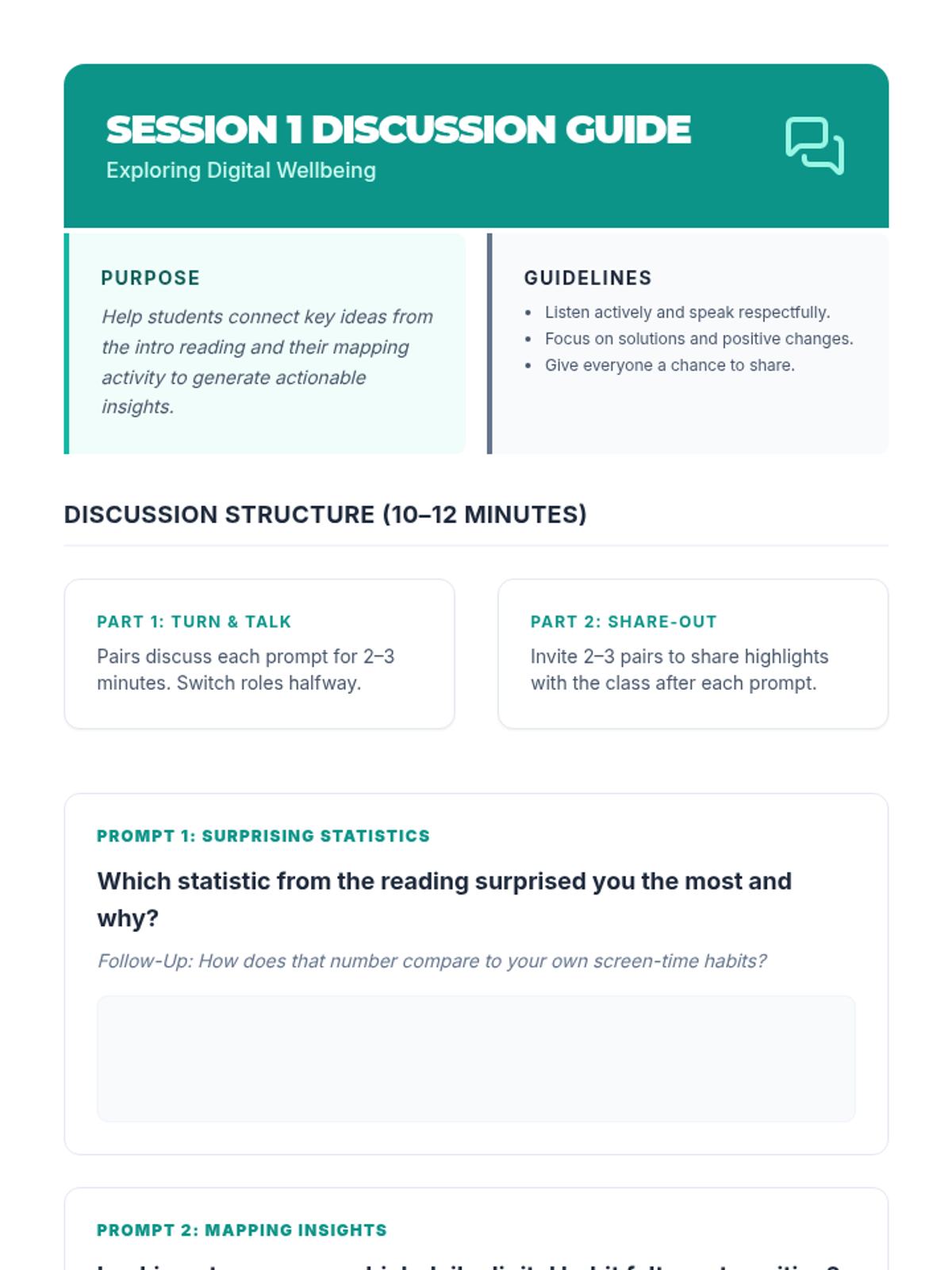 A 5-session digital wellbeing course for 11th graders designed to help them balance their online and offline lives. Students explore digital habits, set tech boundaries, manage notifications, analyze social media impact, and culminate their learning in a personalized wellness project.