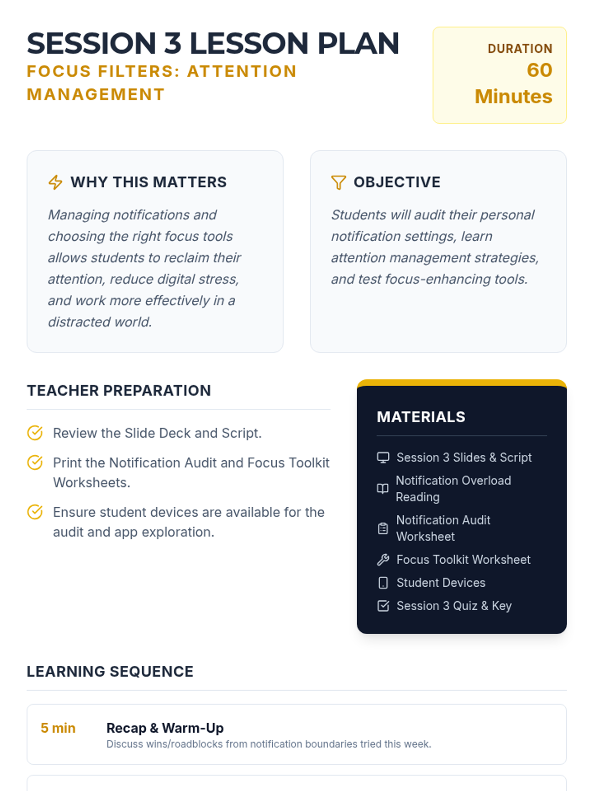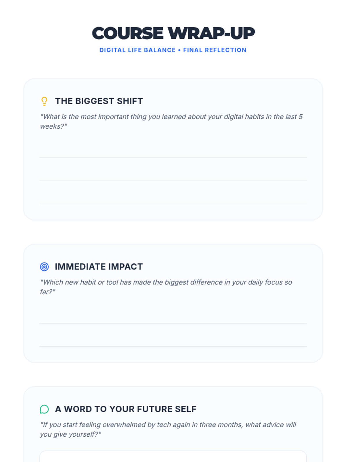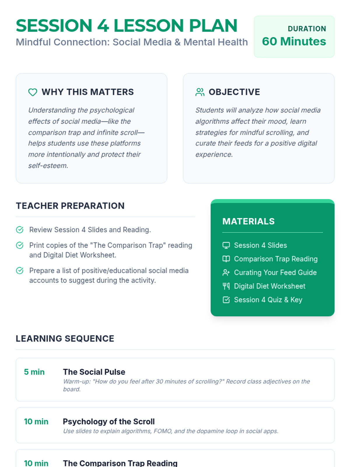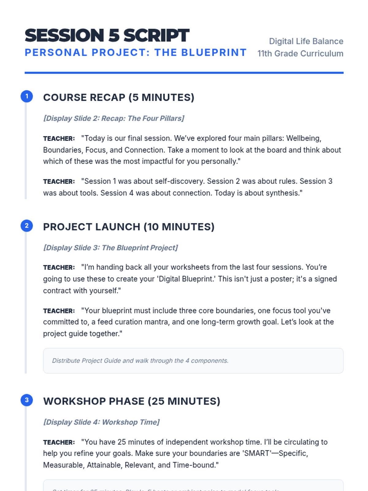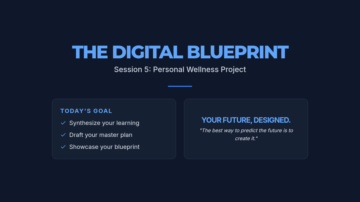 A 5-session digital wellbeing course for 11th graders designed to help them balance their online and offline lives. Students explore digital habits, set tech boundaries, manage notifications, analyze social media impact, and culminate their learning in a personalized wellness project.