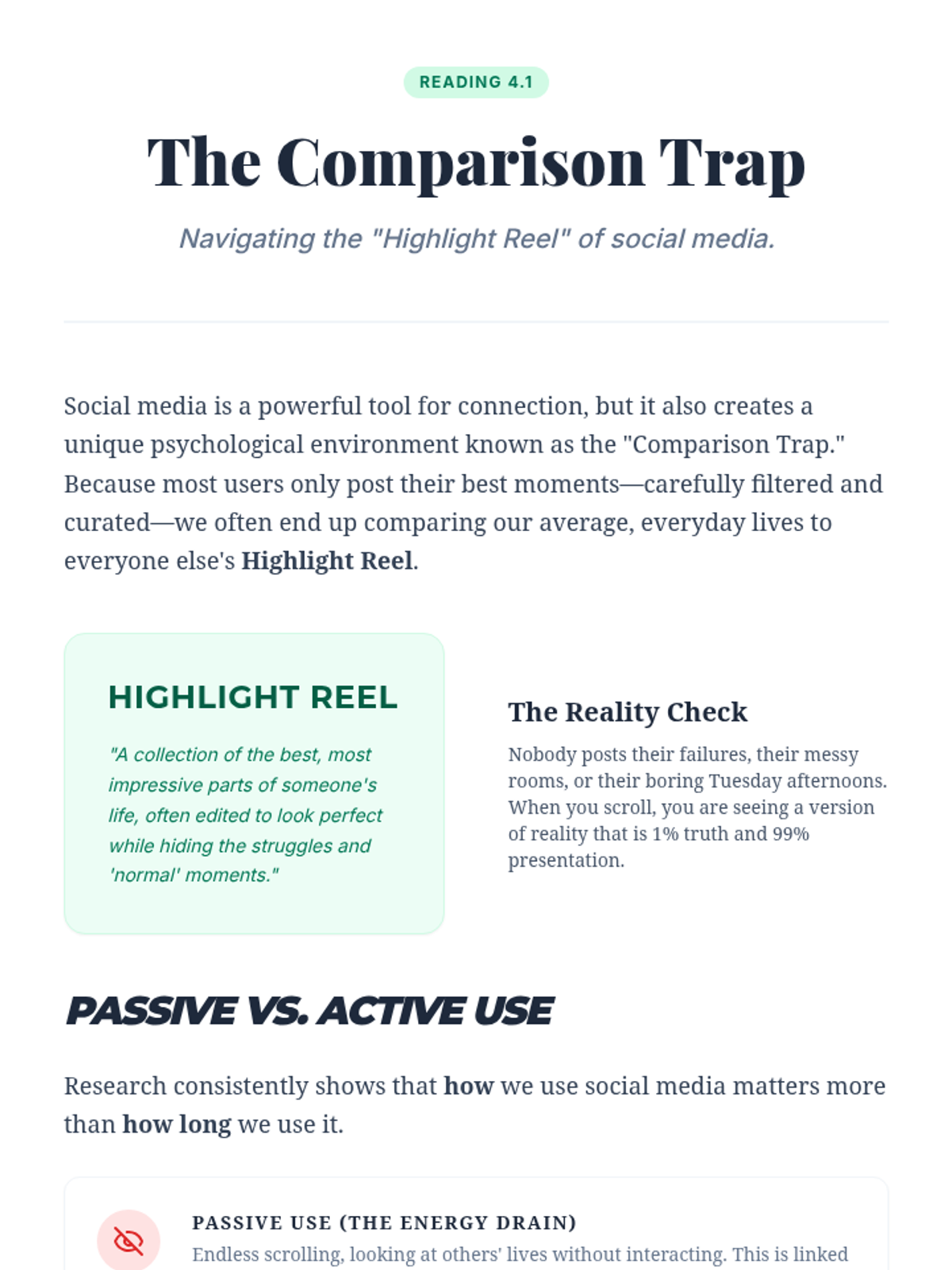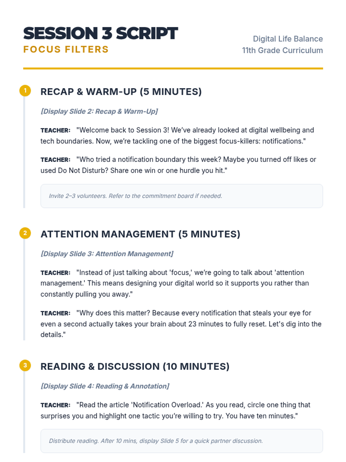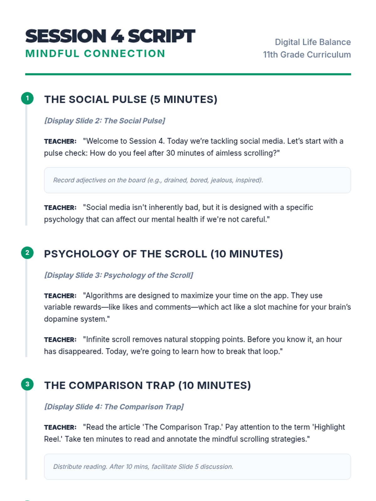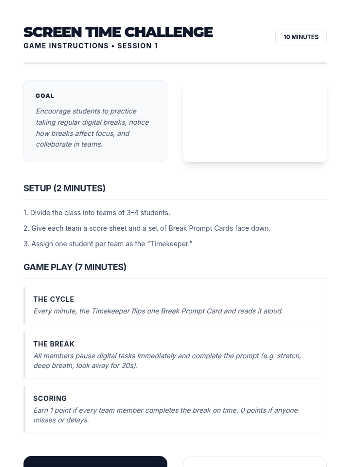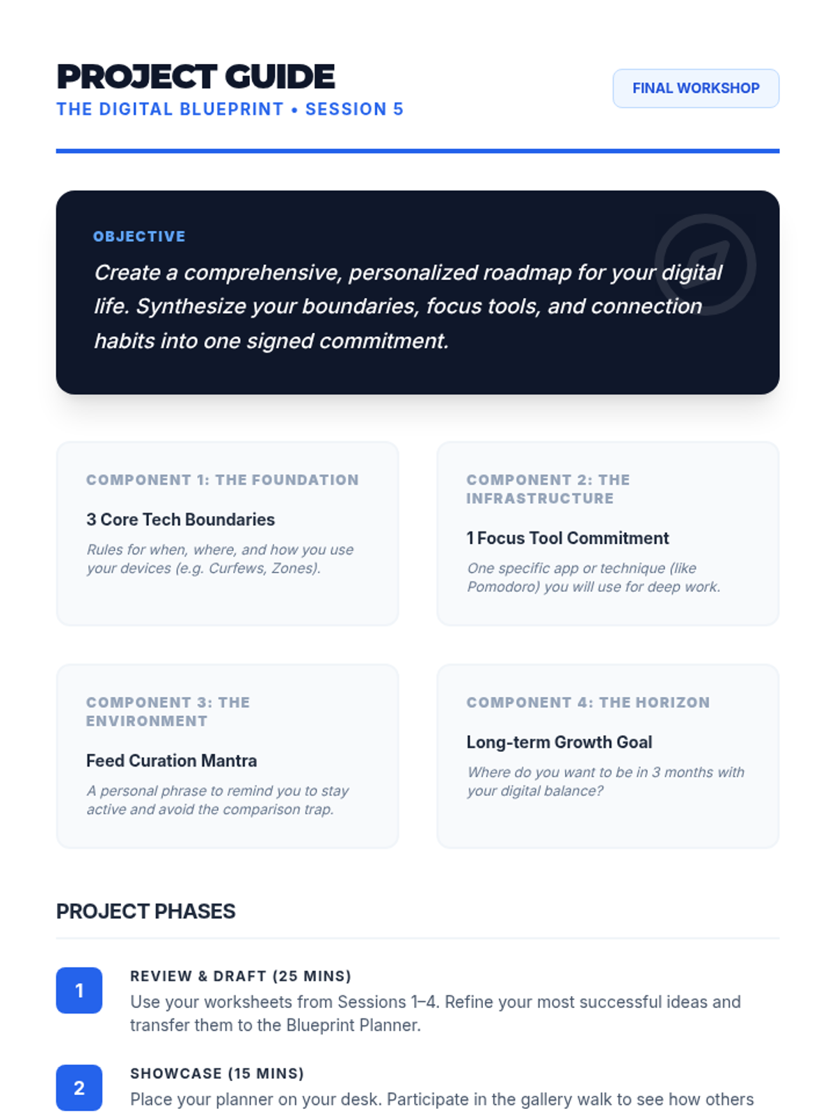 A 5-session digital wellbeing course for 11th graders designed to help them balance their online and offline lives. Students explore digital habits, set tech boundaries, manage notifications, analyze social media impact, and culminate their learning in a personalized wellness project.