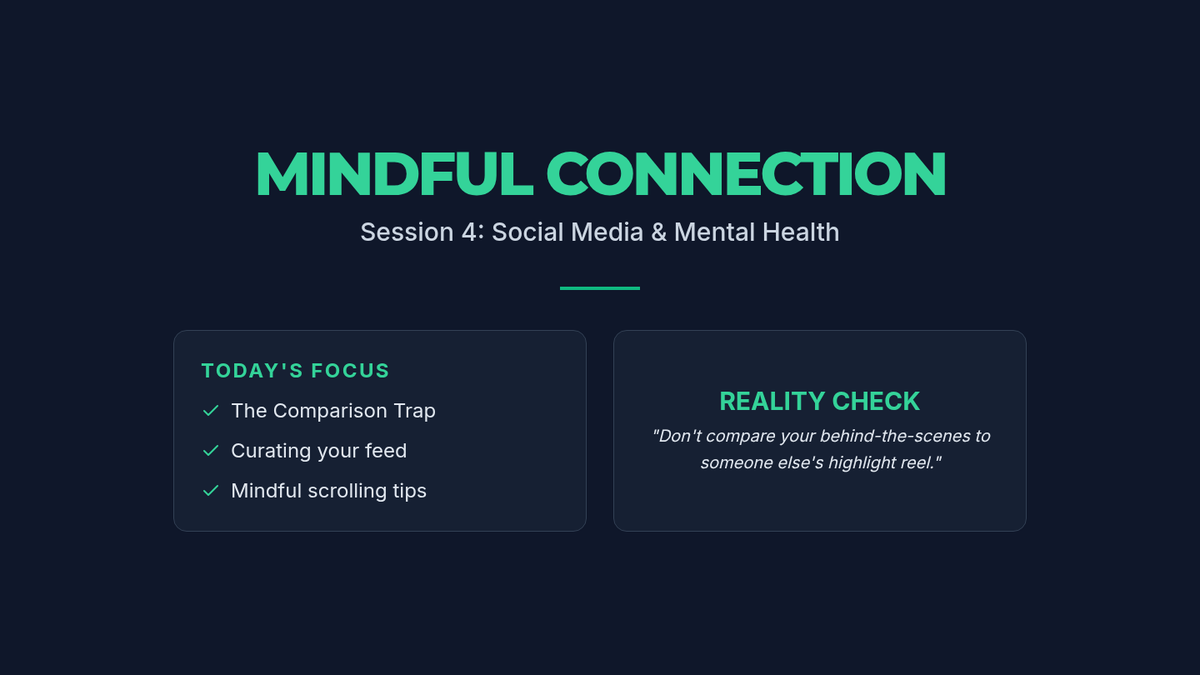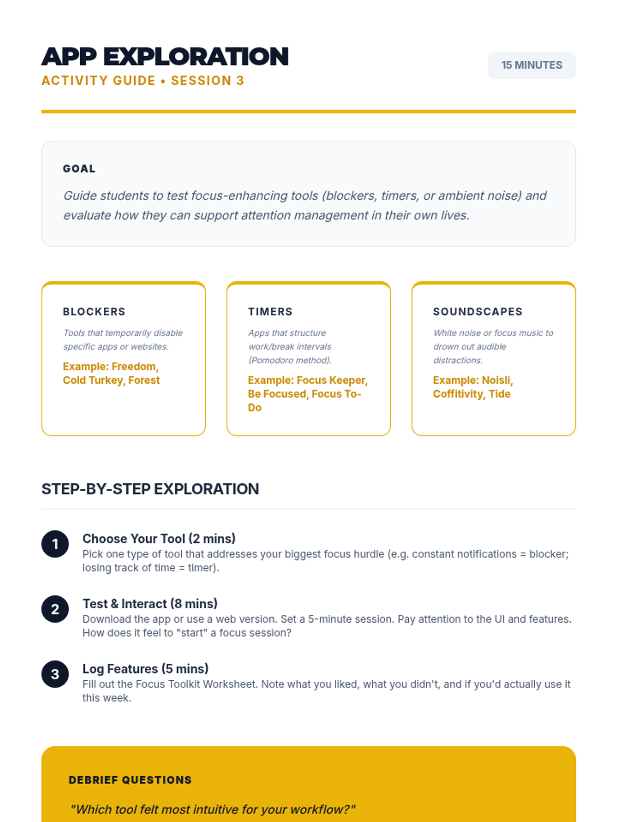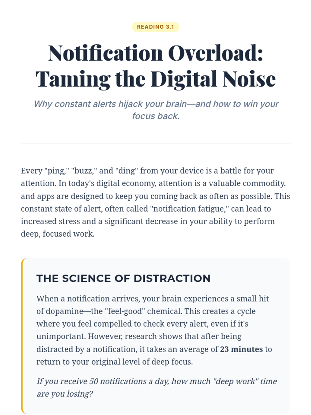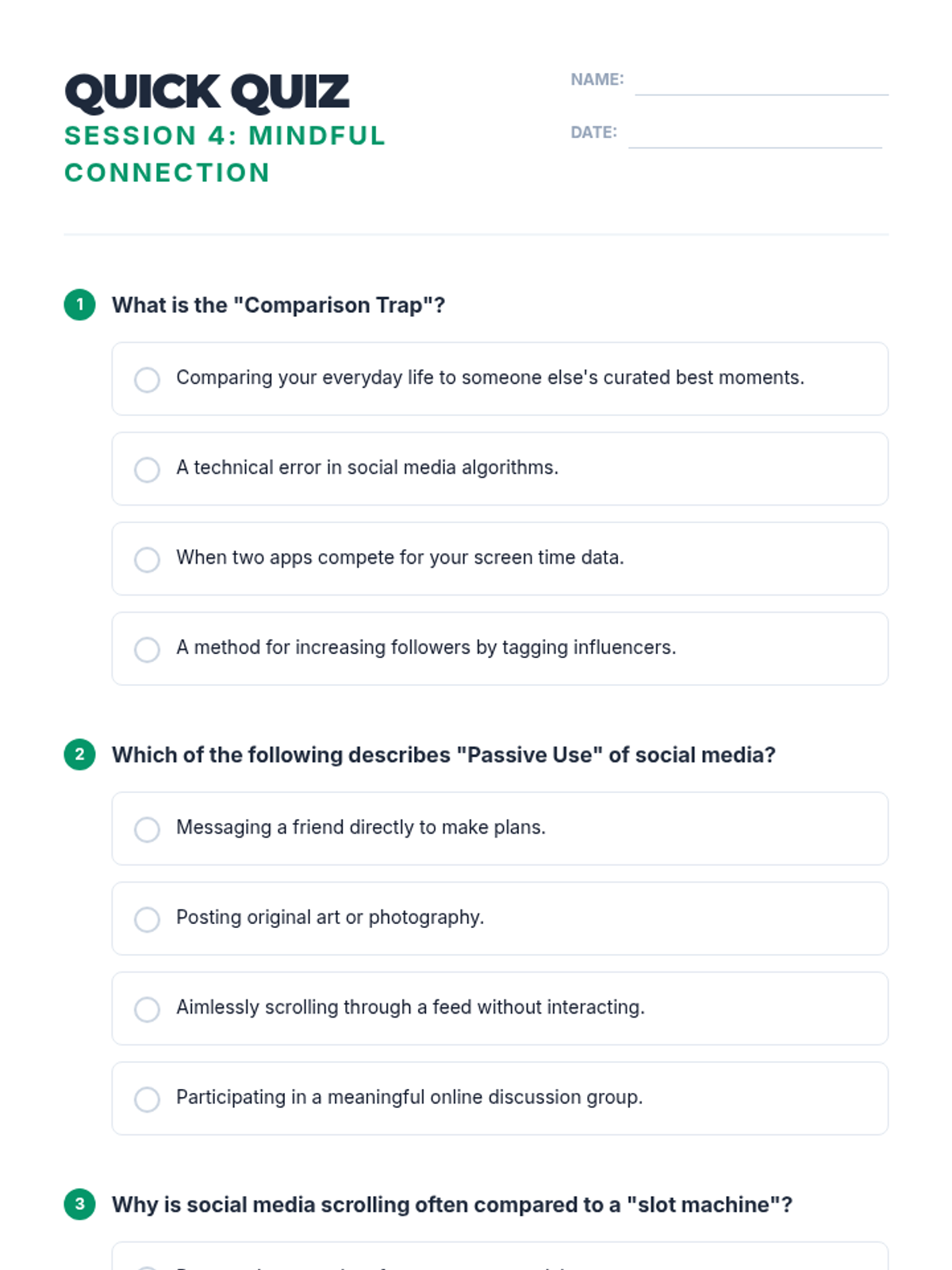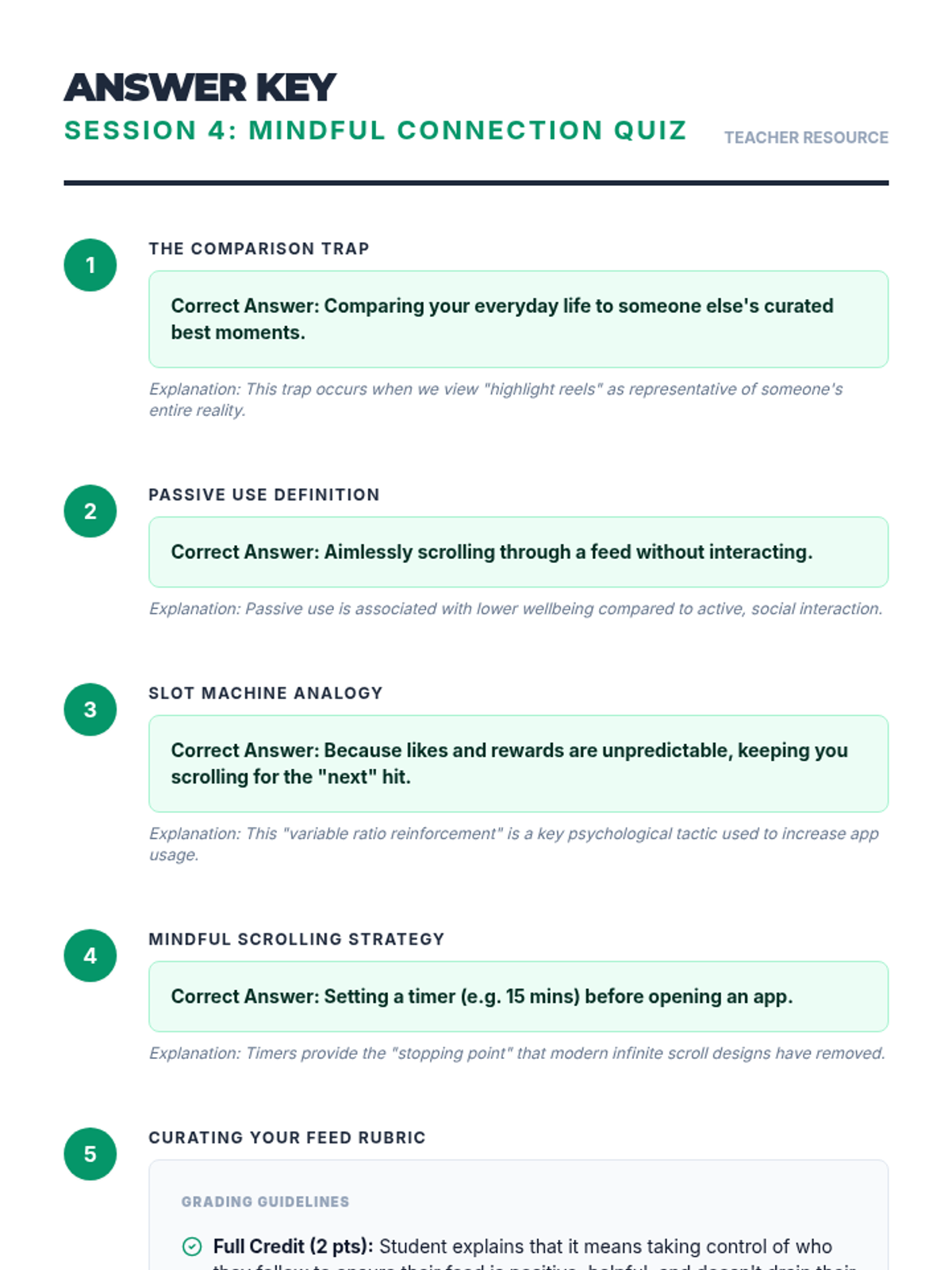 A 5-session digital wellbeing course for 11th graders designed to help them balance their online and offline lives. Students explore digital habits, set tech boundaries, manage notifications, analyze social media impact, and culminate their learning in a personalized wellness project.